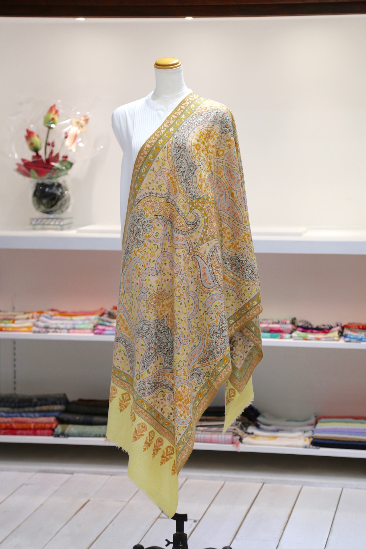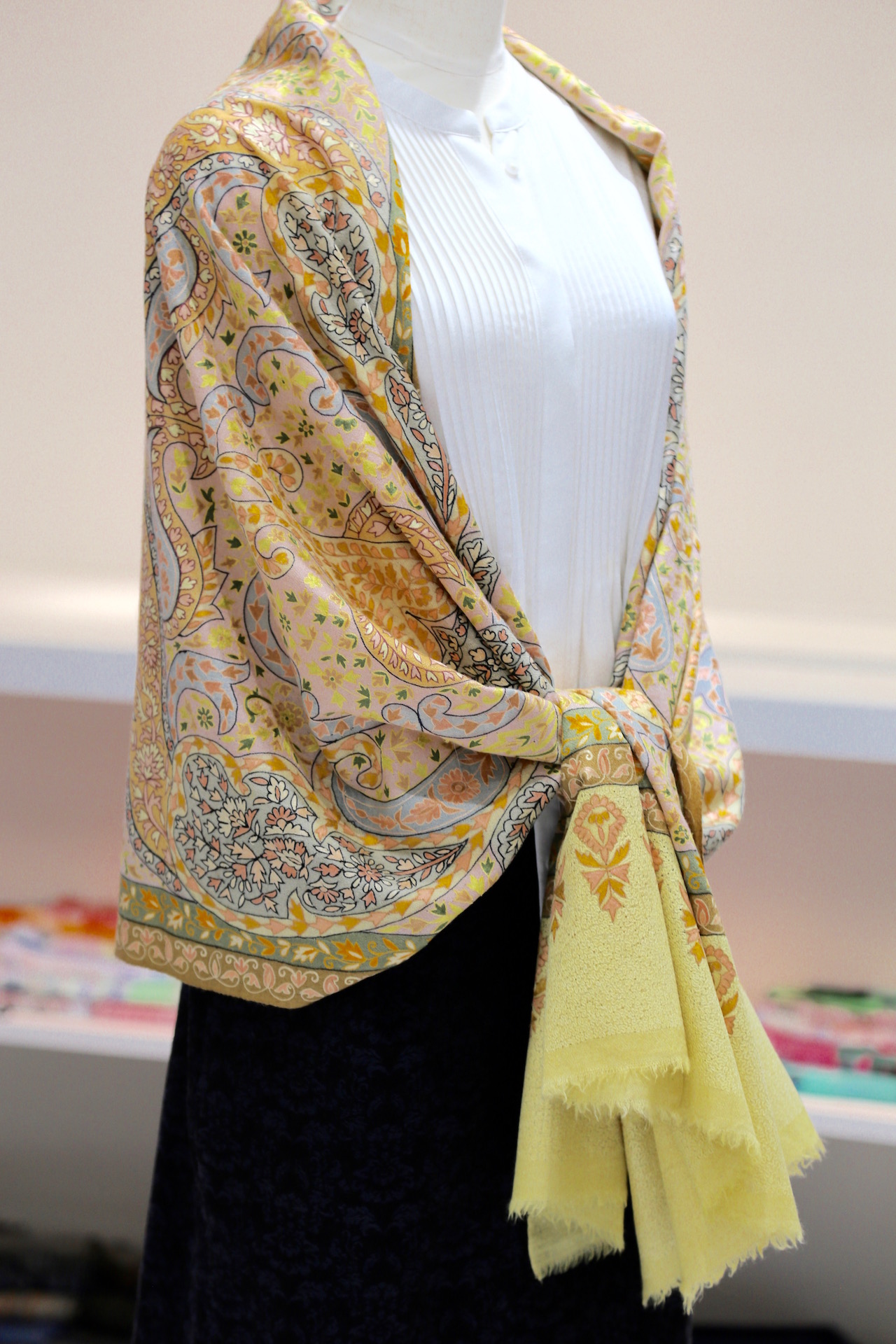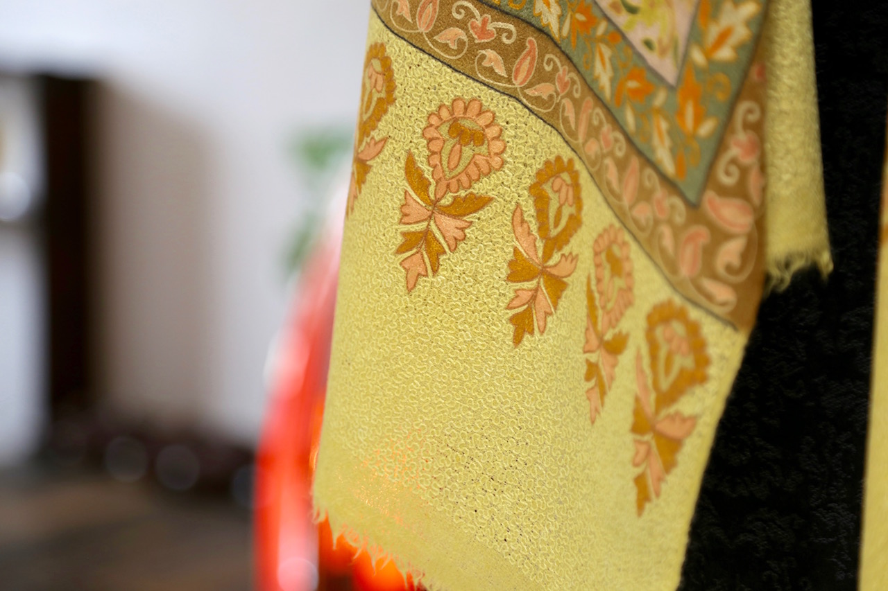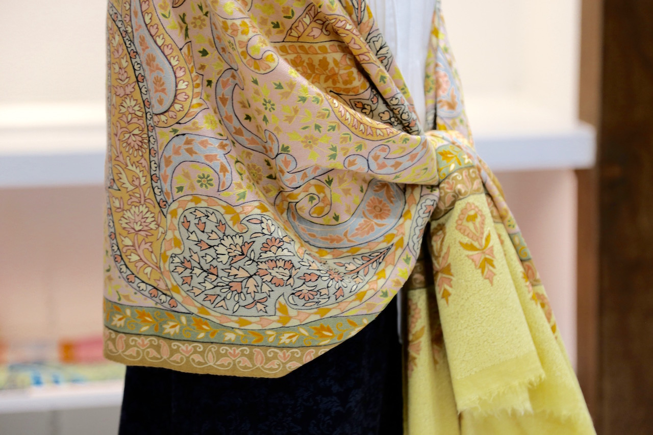 織り、刺繍、そして手描き、すべての手仕事で高い技量がなくては完成しない、カシミール織物の中でも非常に希少な存在です。