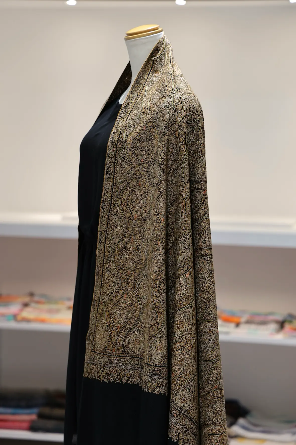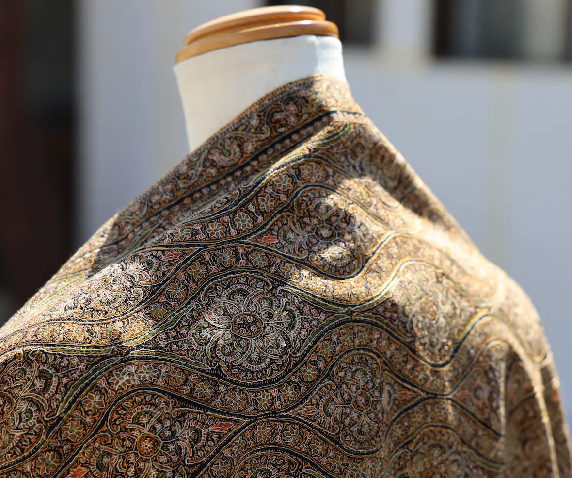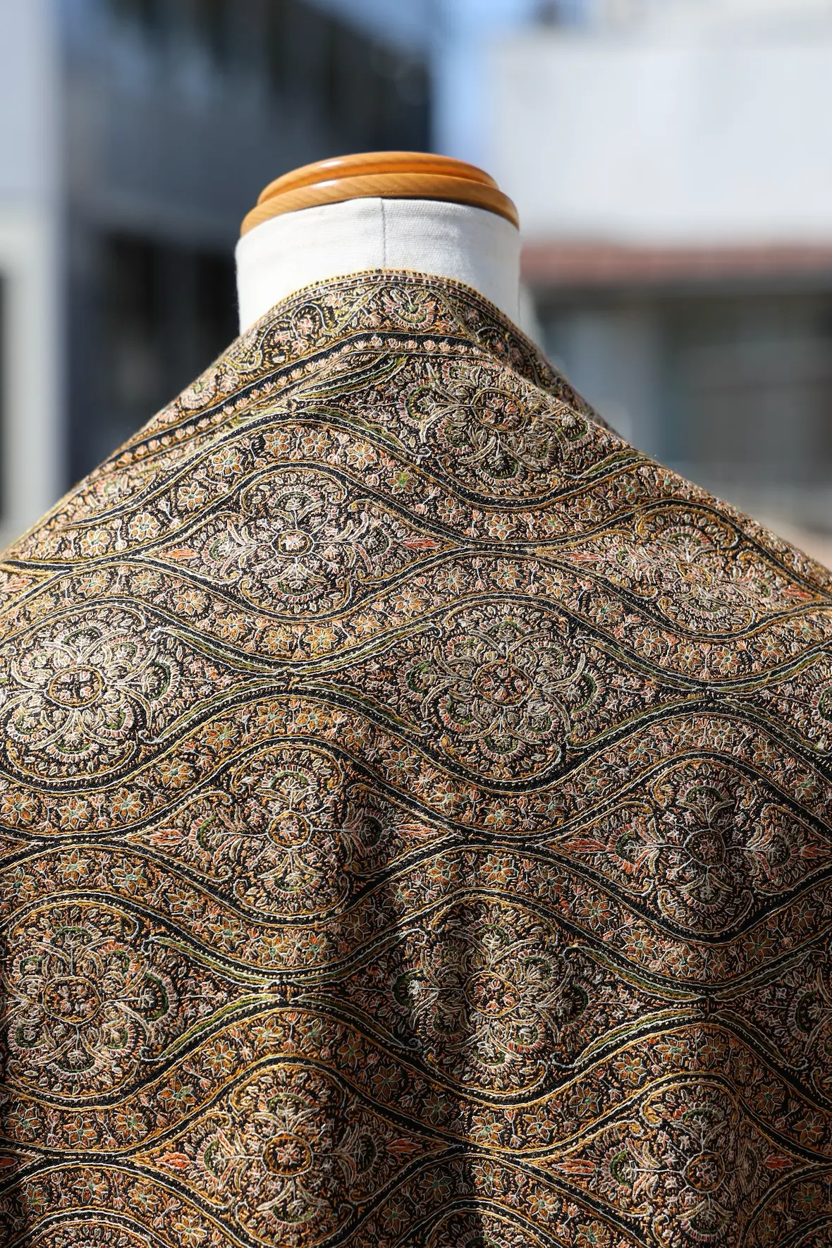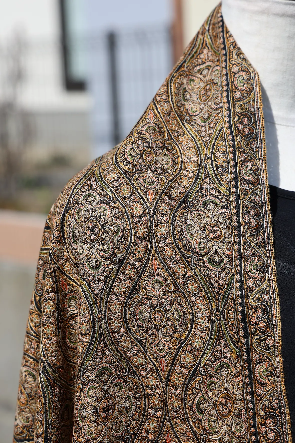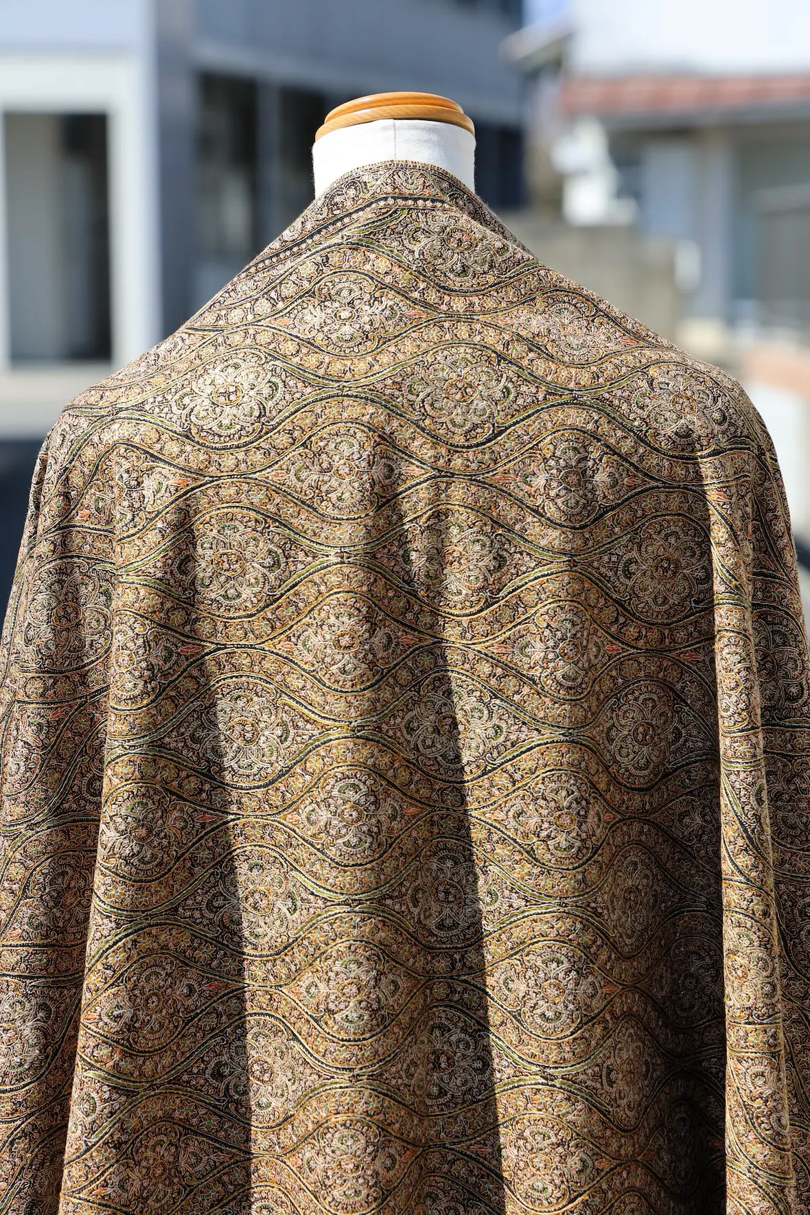 背面の自然なドレープと陰影の美しさも全面総刺繍ショールならでは。