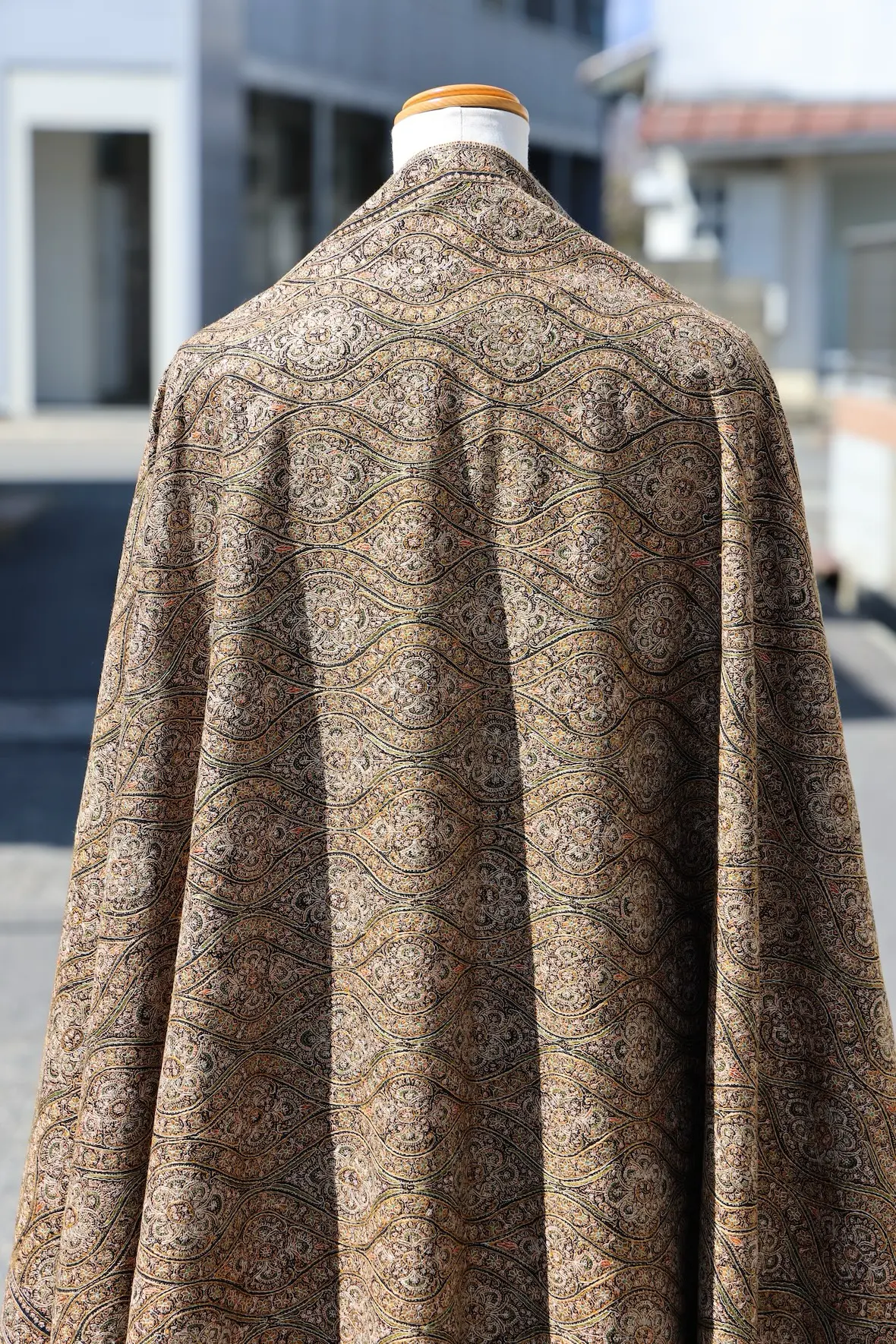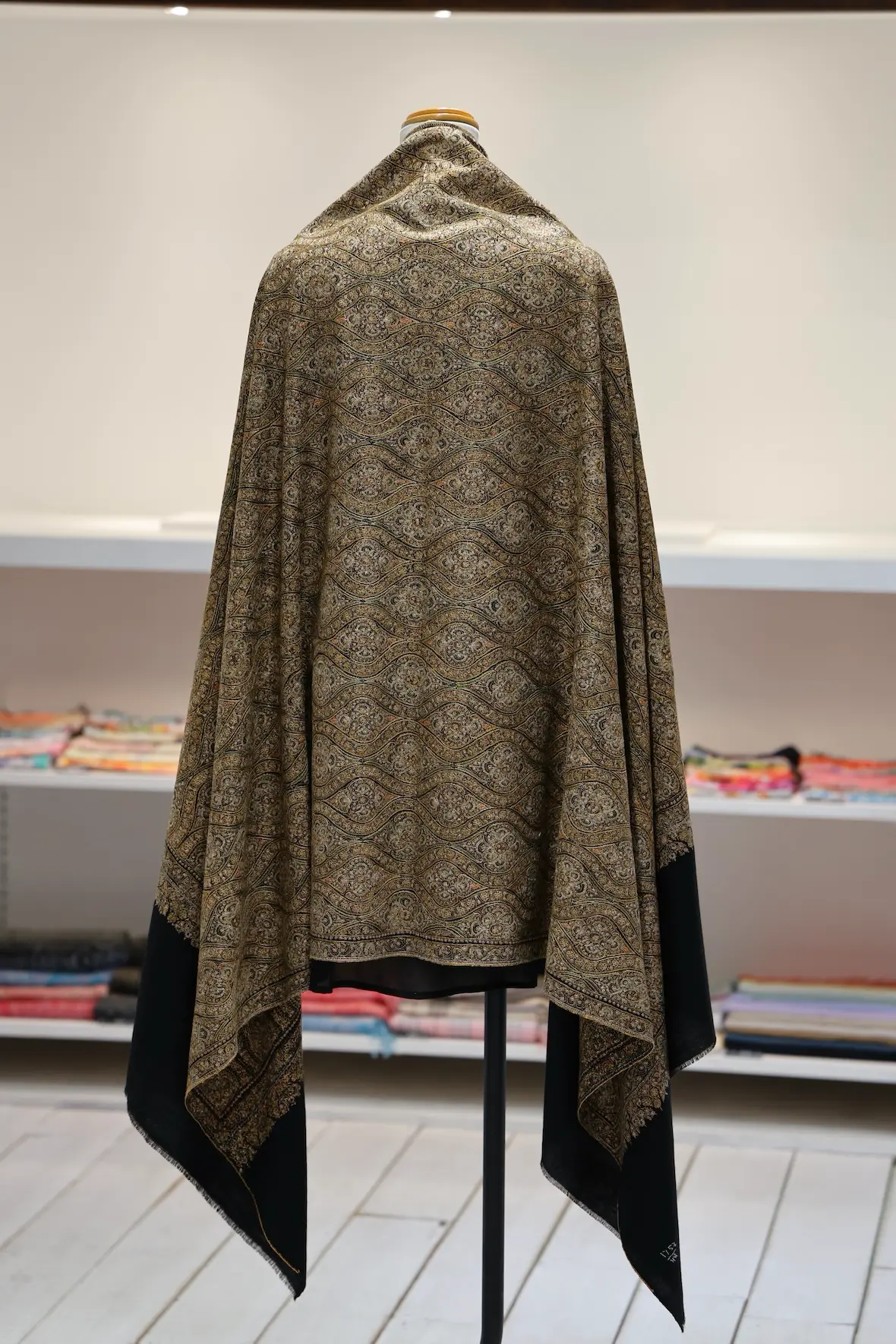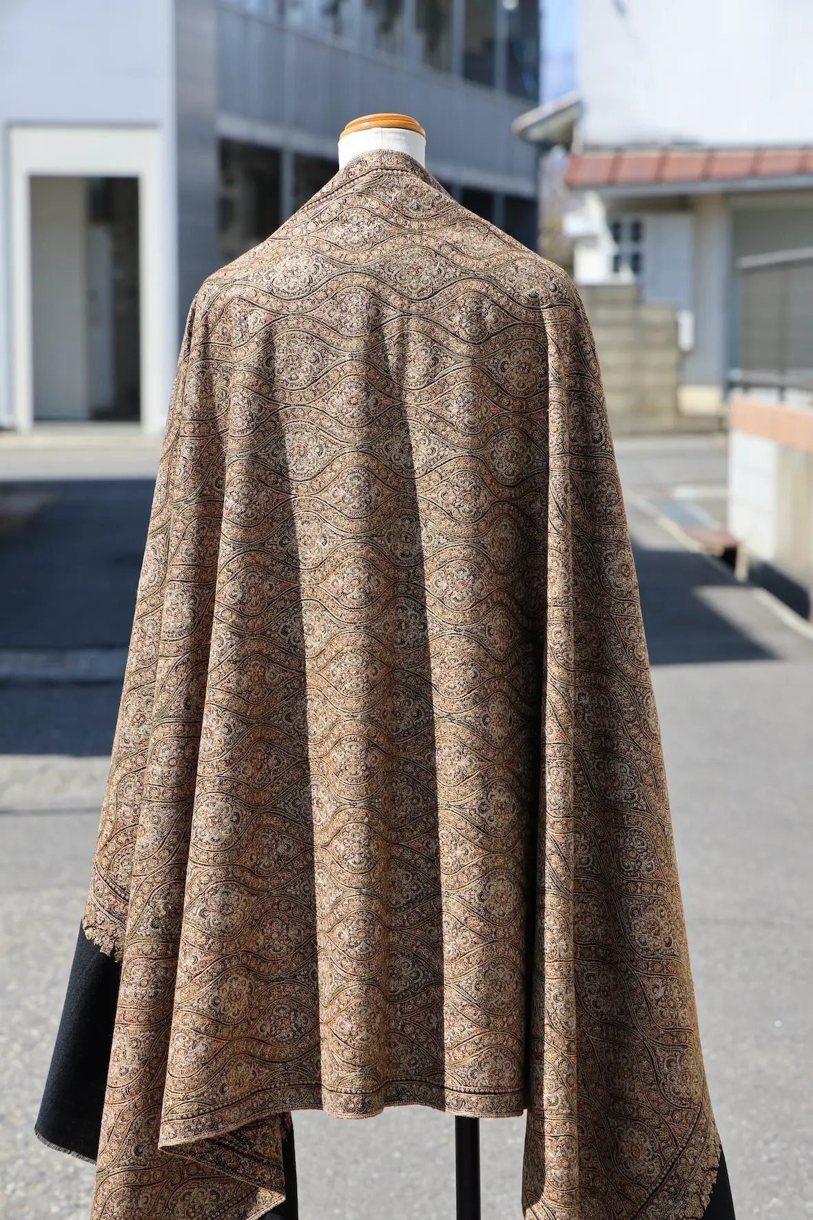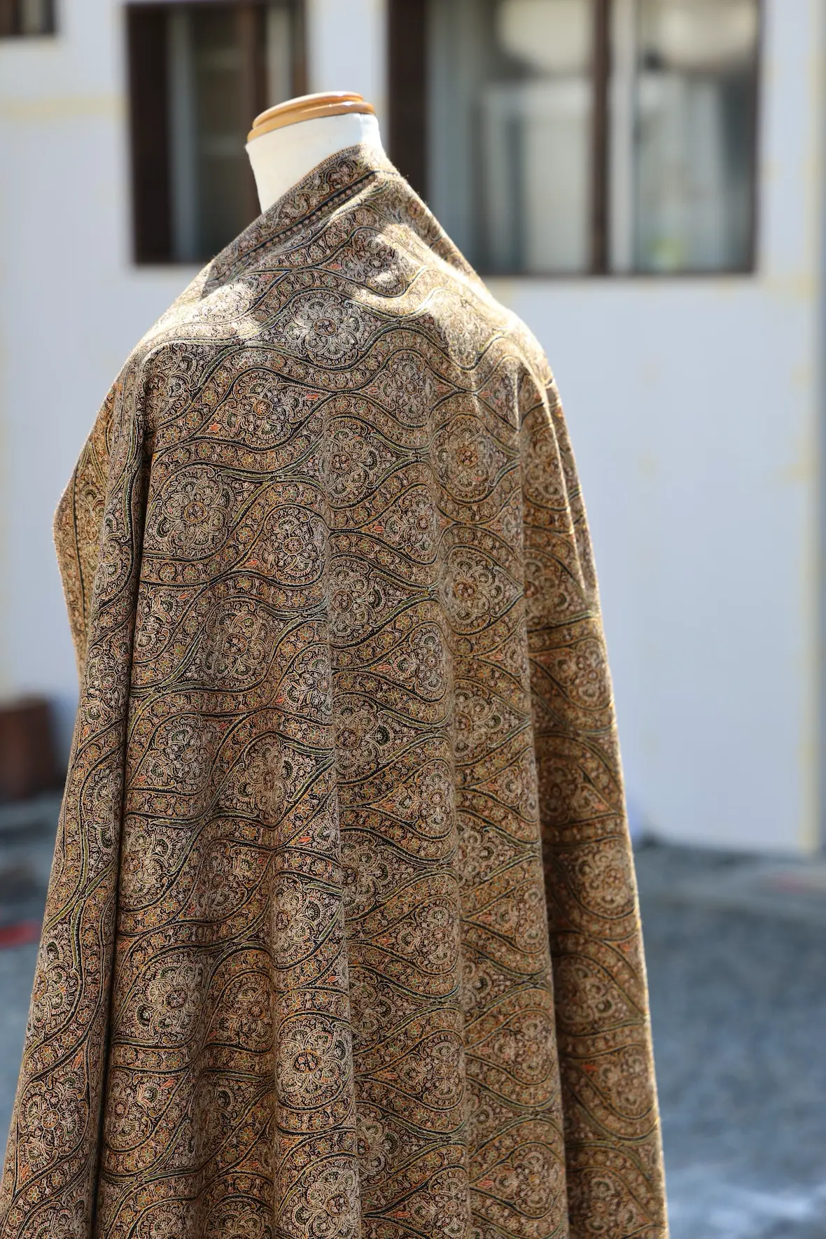 背面の自然なドレープと陰影の美しさも全面総刺繍ショールならでは。