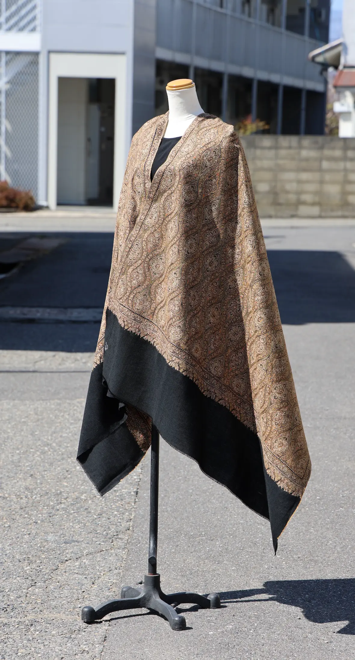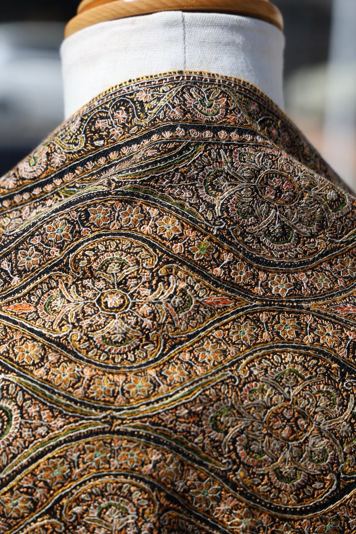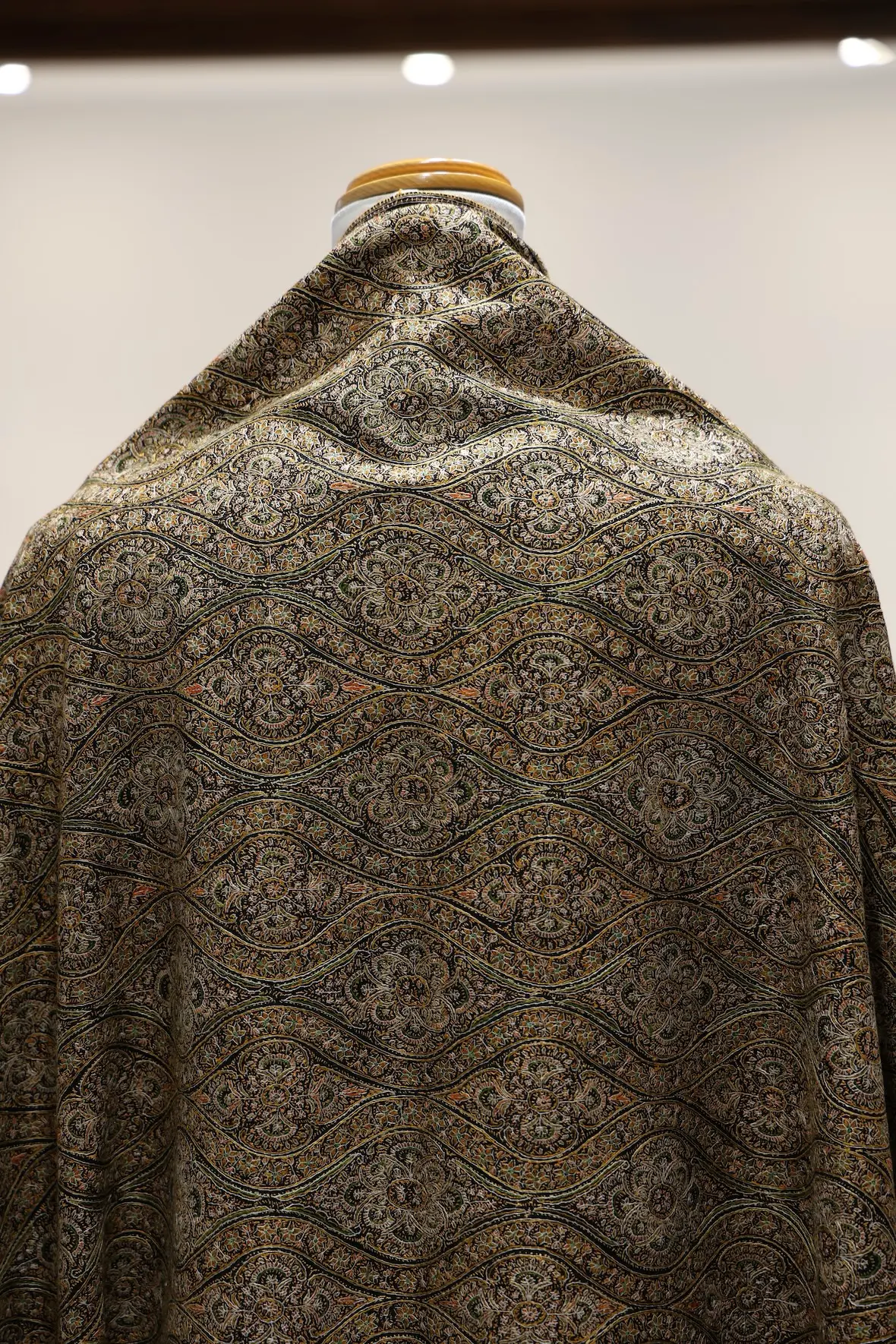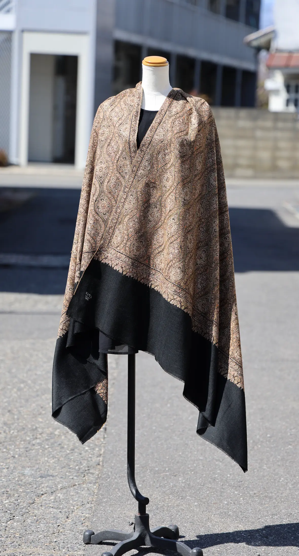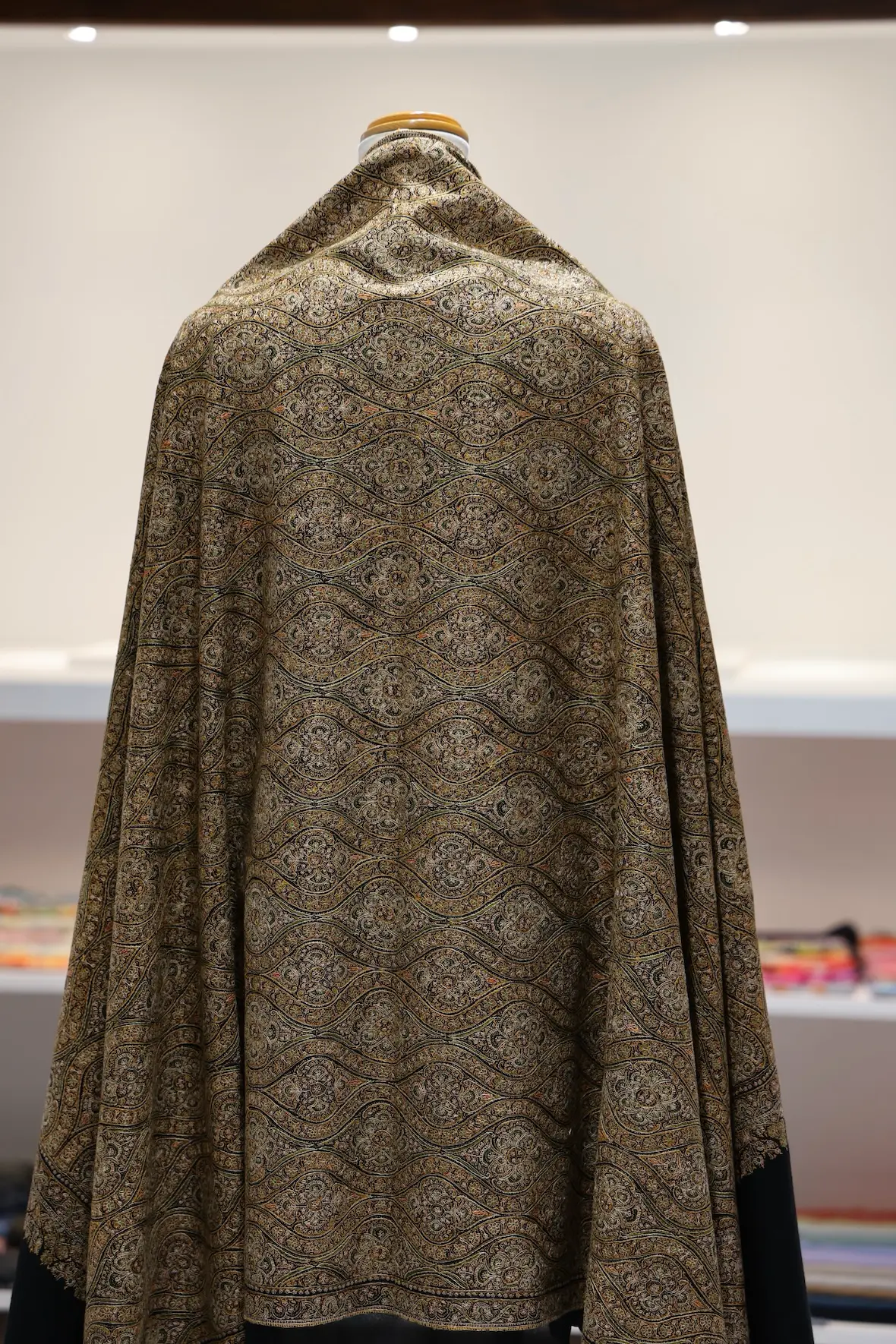 背面の自然なドレープと陰影の美しさも全面総刺繍ショールならでは。