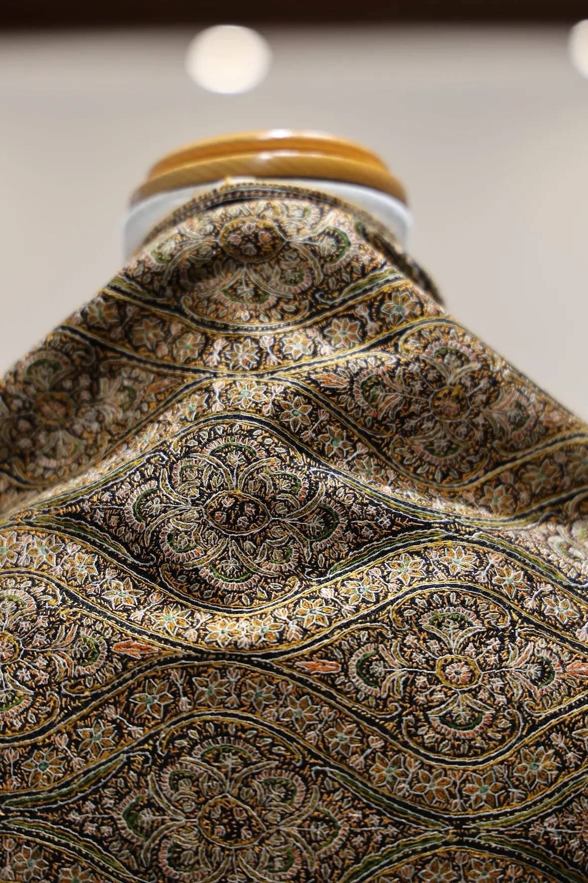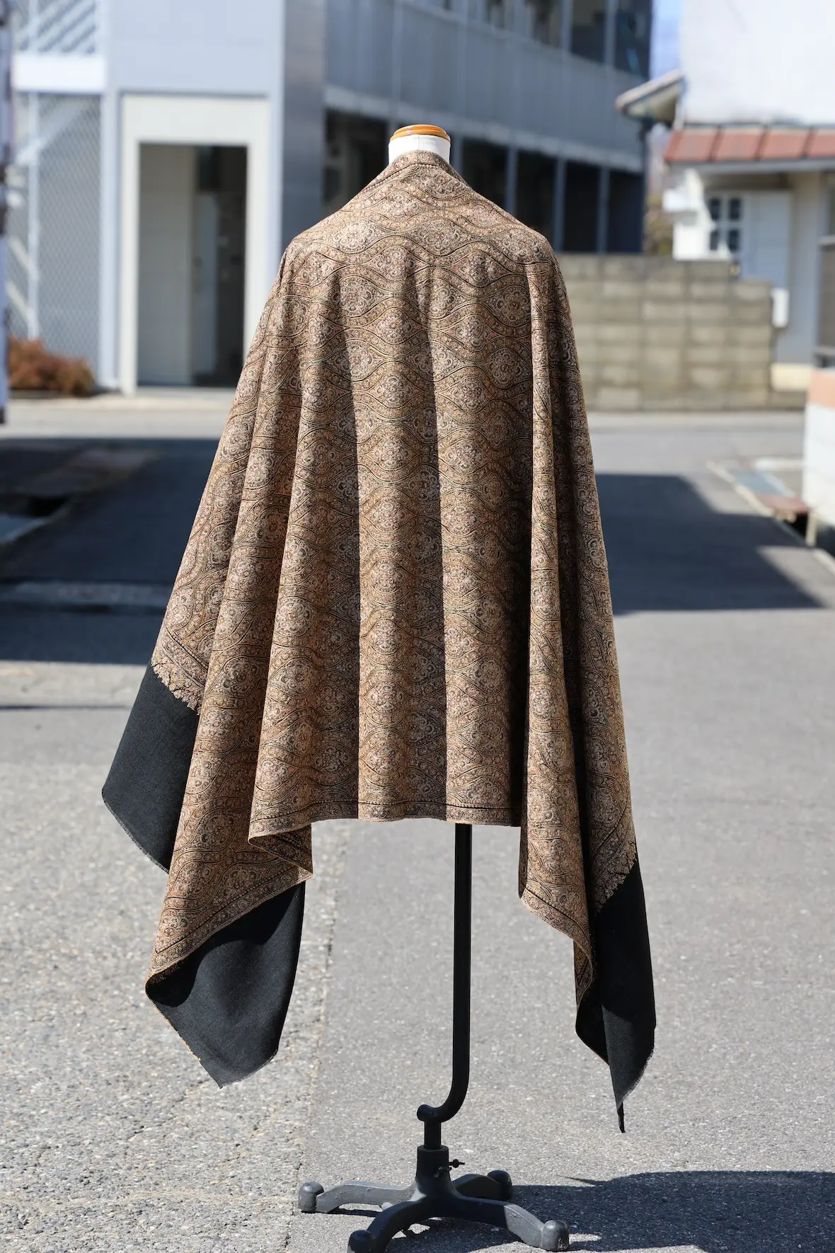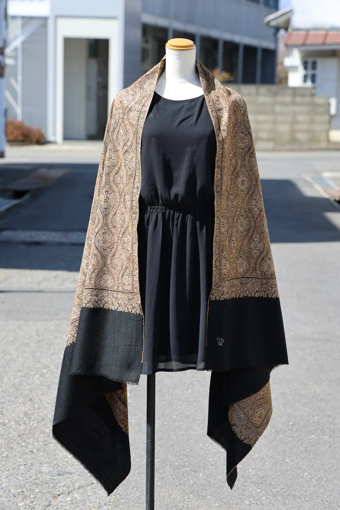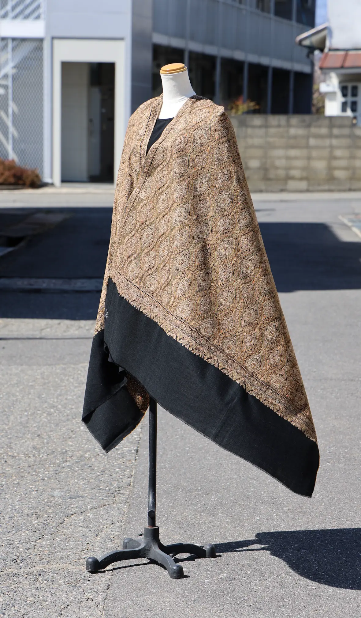 背面の自然なドレープと陰影の美しさも全面総刺繍ショールならでは。