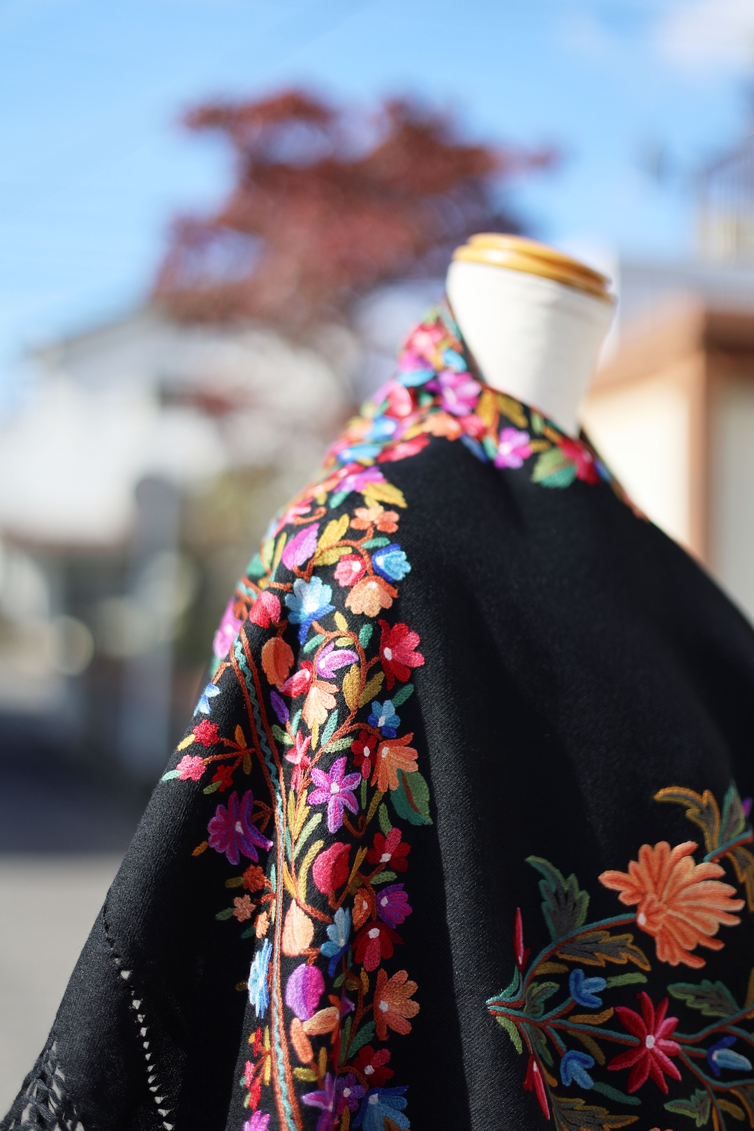 深みのあるベースカラーに色とりどりの華やかな立体刺繍が施されています。