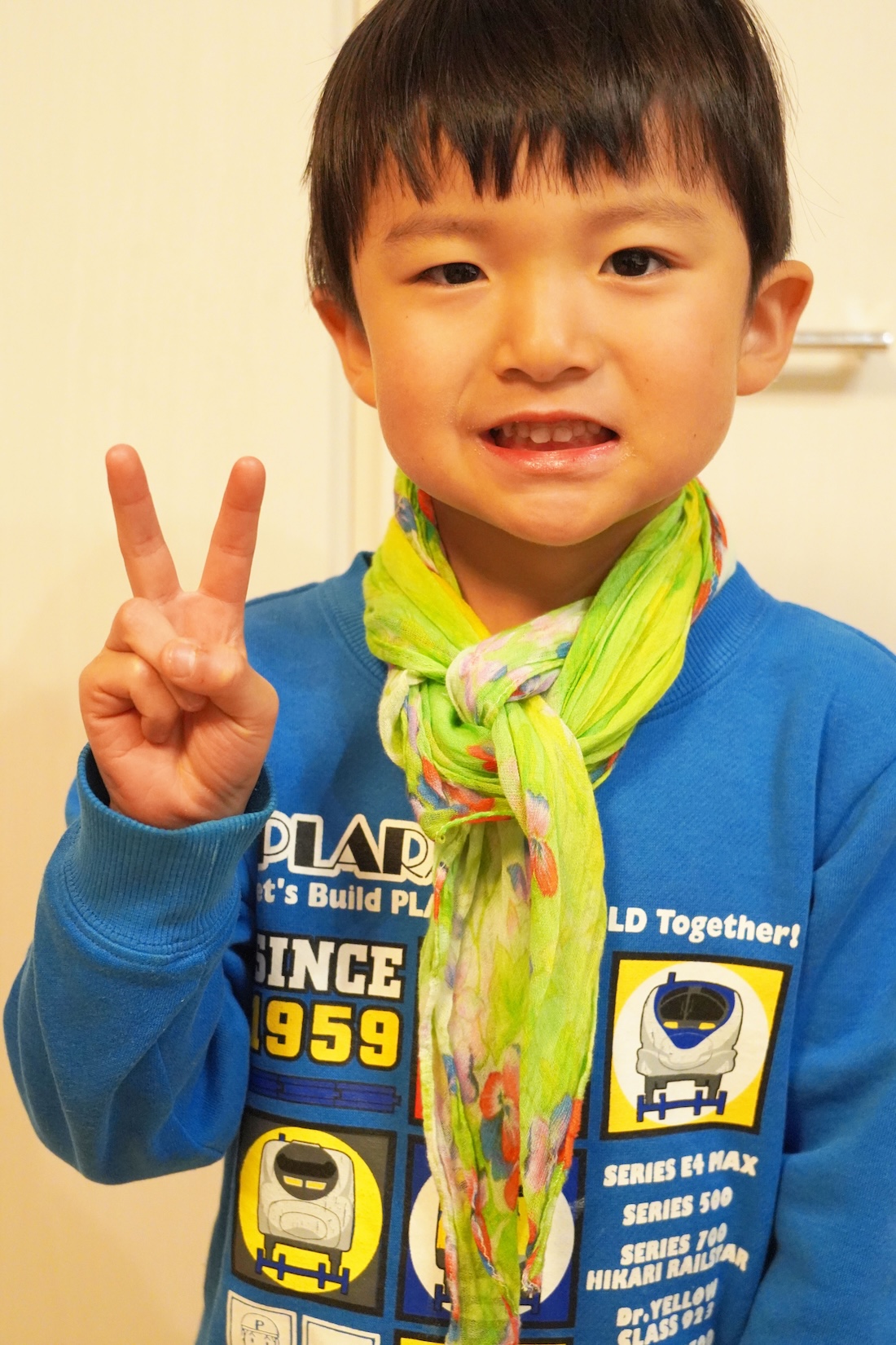 4歳の長男はさすがにどう巻いても通常のストールは巻けないので、これまた奥さんの使っているスカーフを巻いてあげました。