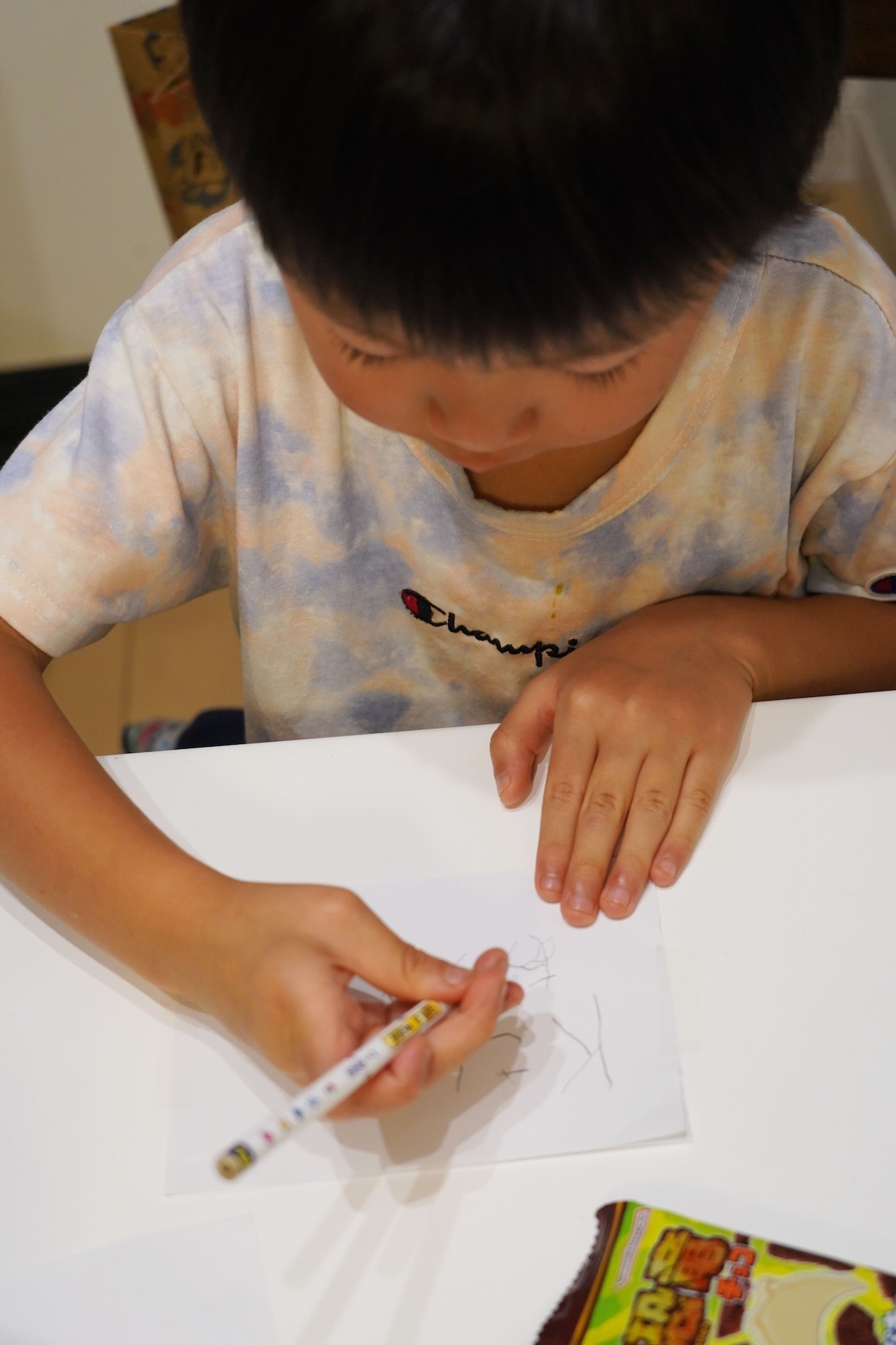 まずは鉛筆の持ち方から習わなければいけませんが、息子なりに真剣に書いていました 笑