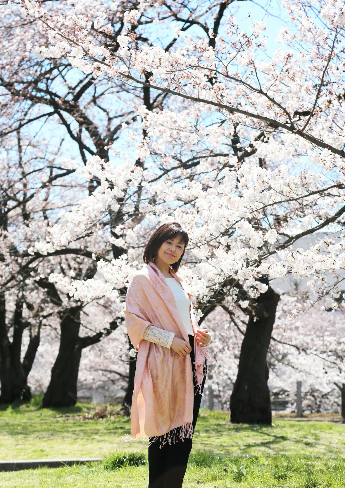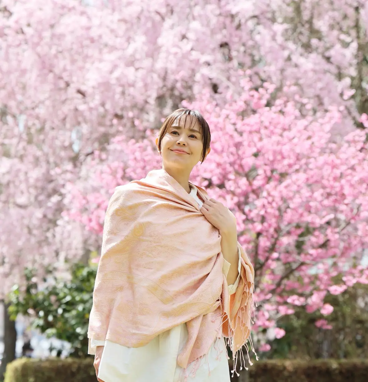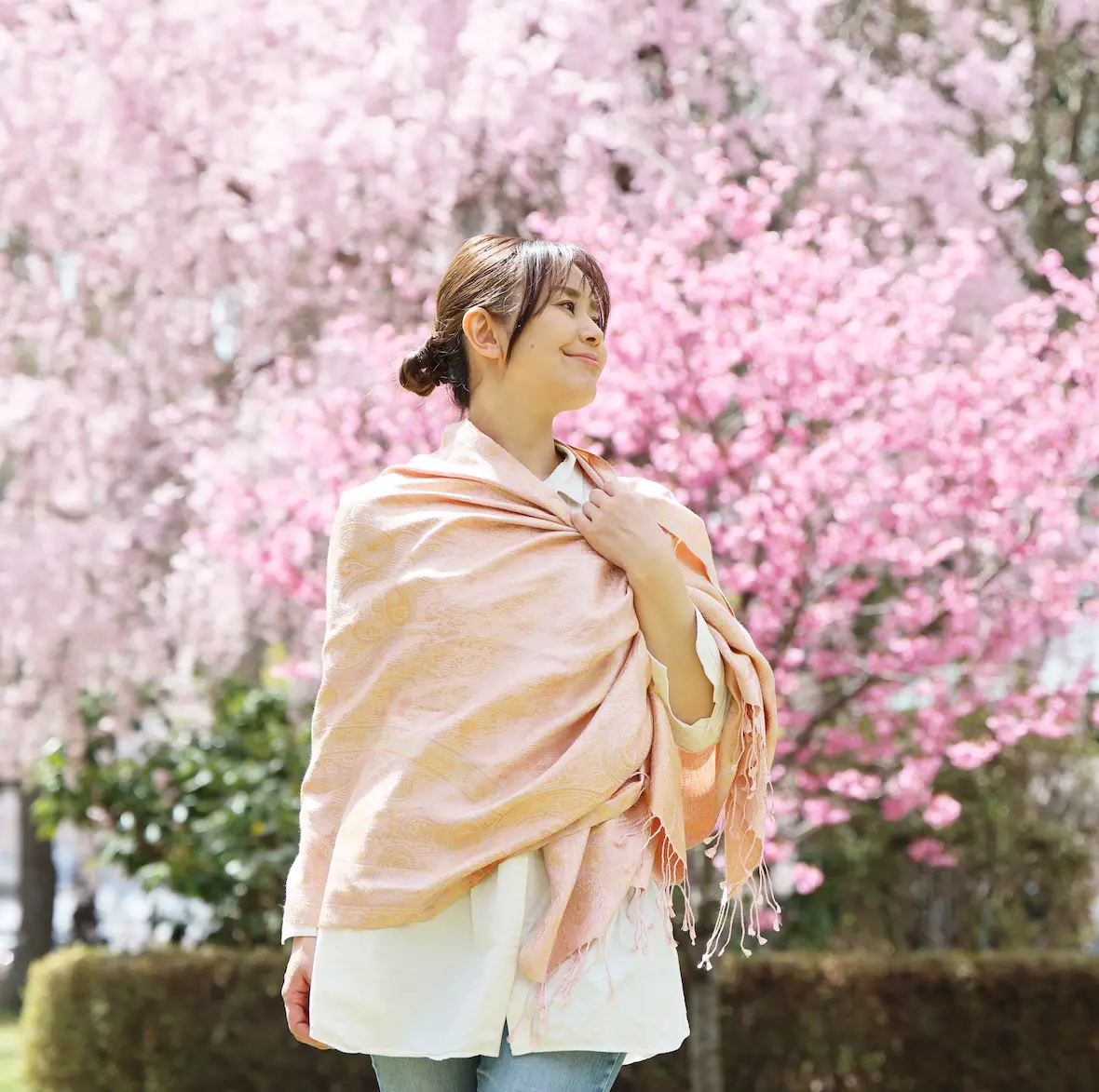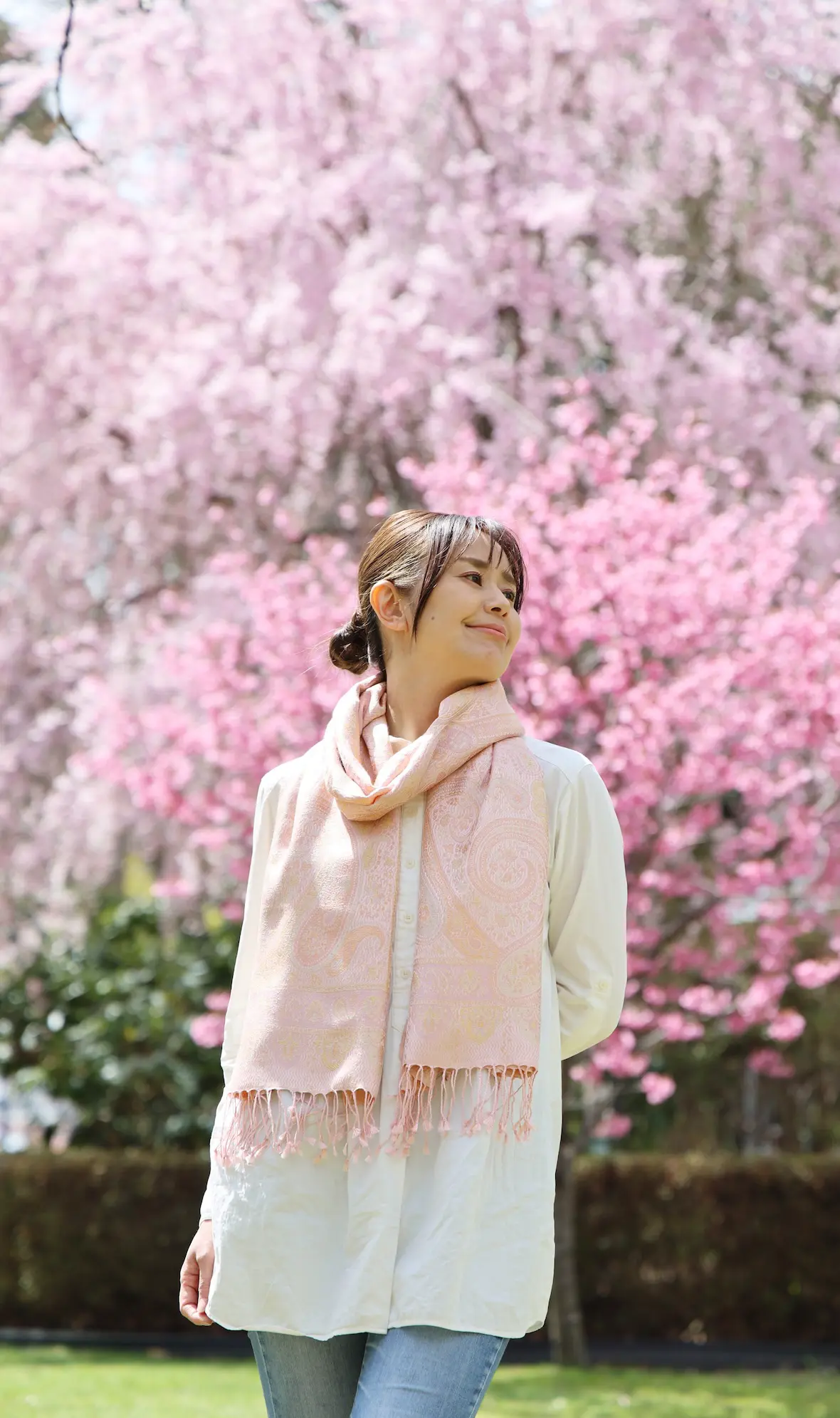 今回の写真は桜をバックにしたシーンが多くなりましたが、この色合いは春はもちろん、シーズンレスで使いやすい色に仕上がっています。