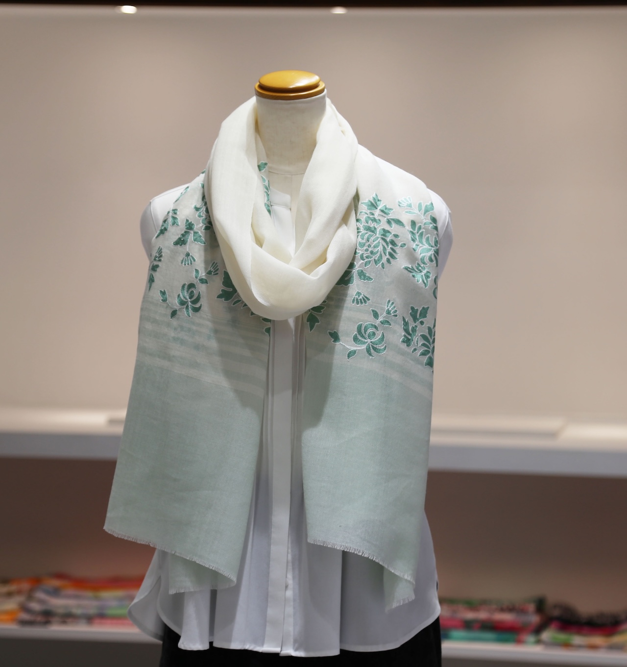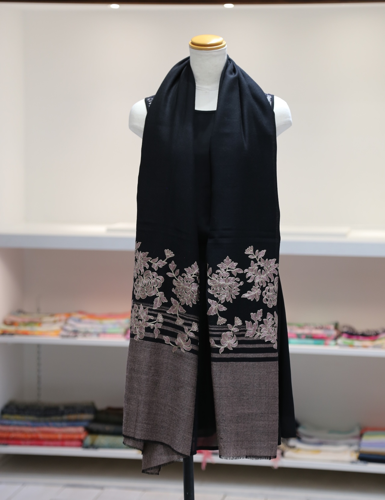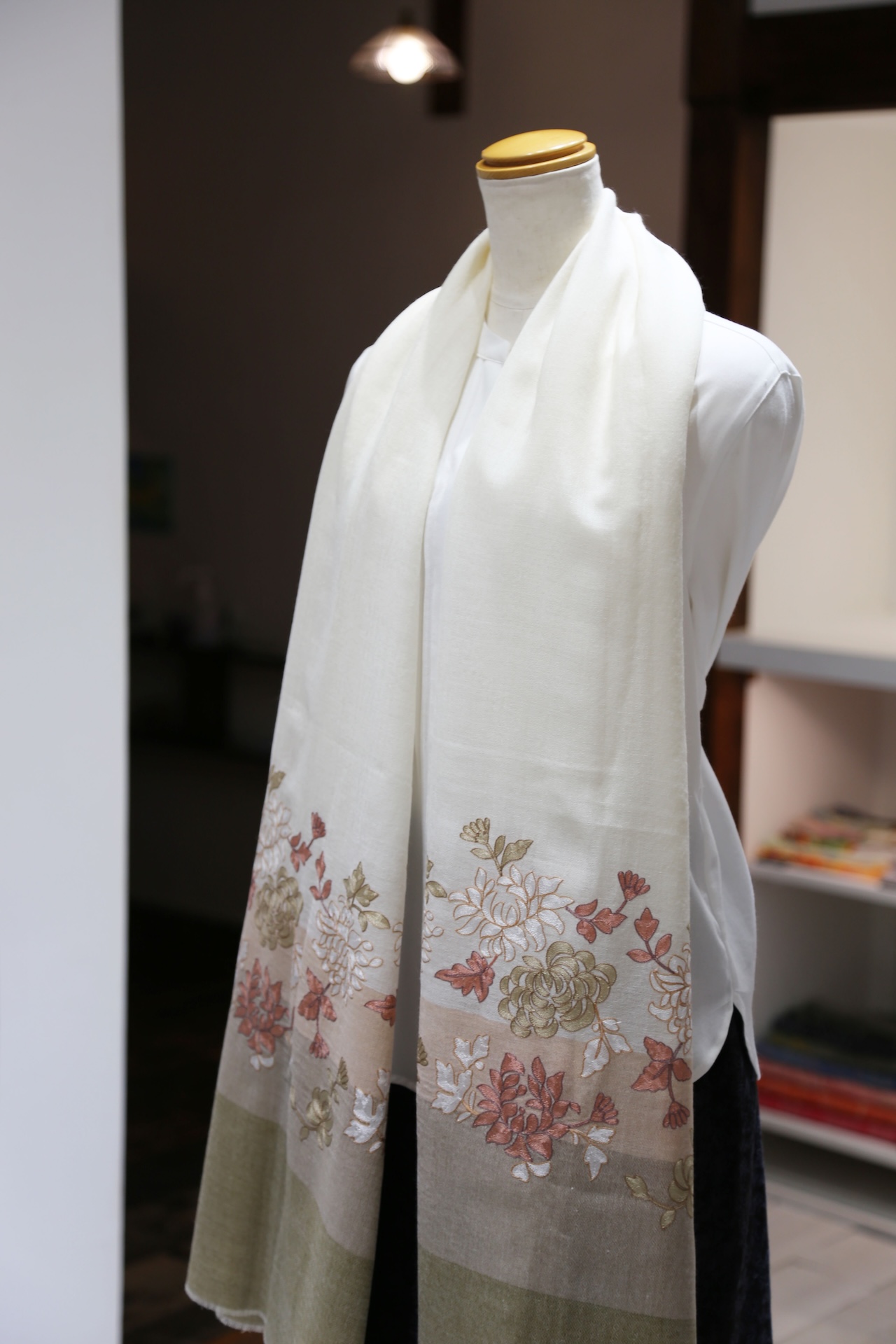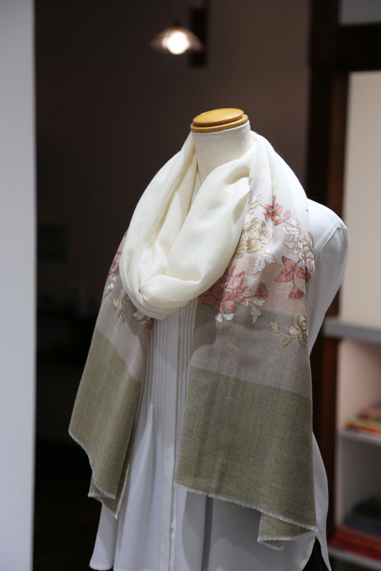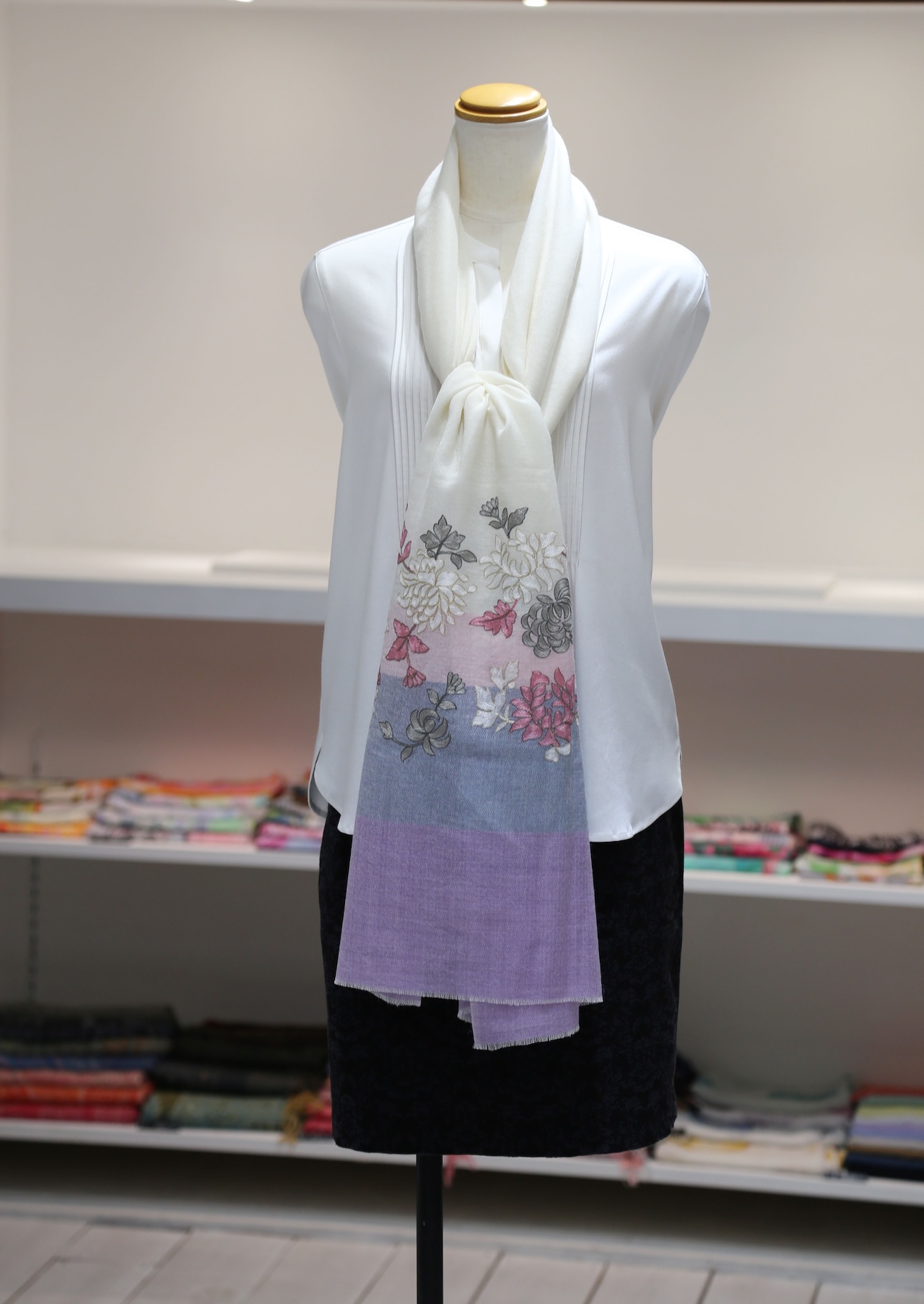 巻いても羽織っても、肩からかけても非常に見栄えますし、施されている刺繍の面積のバランスも良いのでとても扱いやすくなっています。