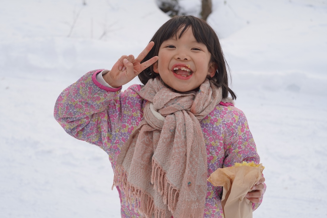 優しいおじさんが焼き芋のサイズをサービスしてくれ、これで子供たちはエネルギーチャージ 笑