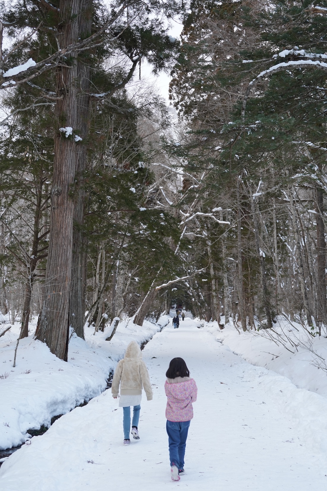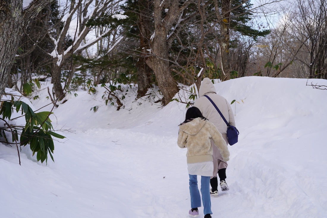 今回は行った時間が夕方だったのと、雪もかなり積もっていたので、子供たちが最後まで歩くのはきついだろうなーと。