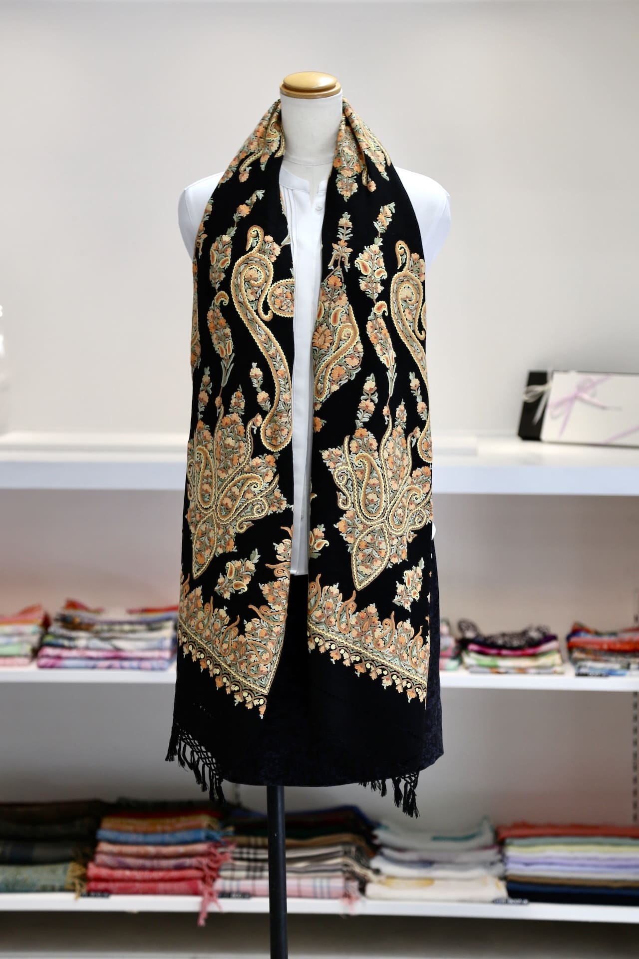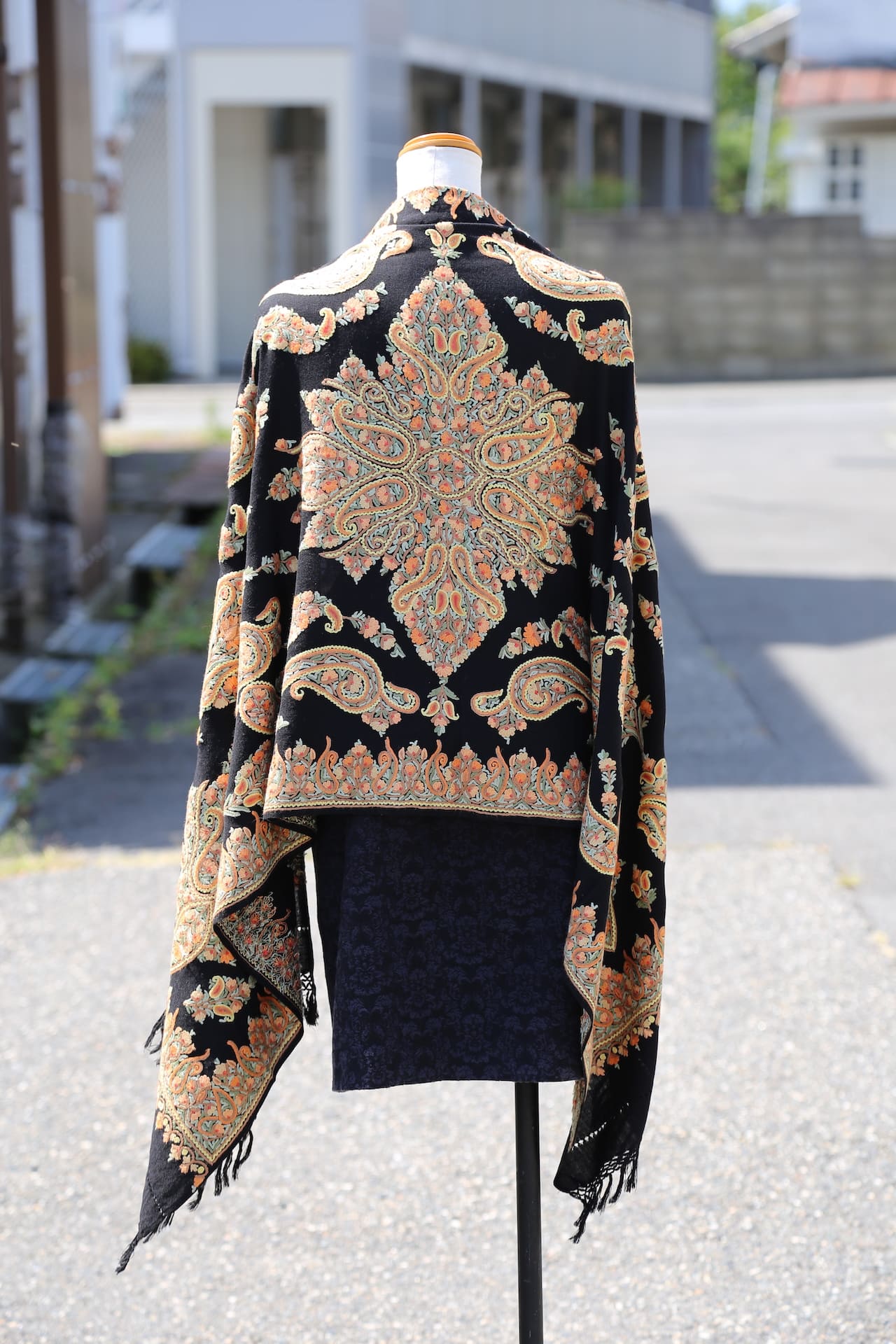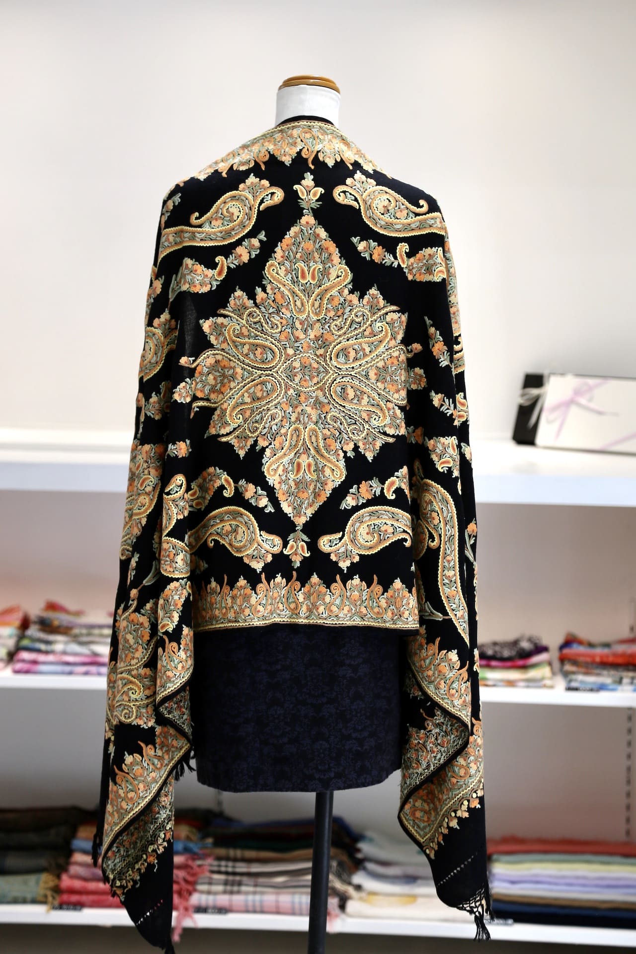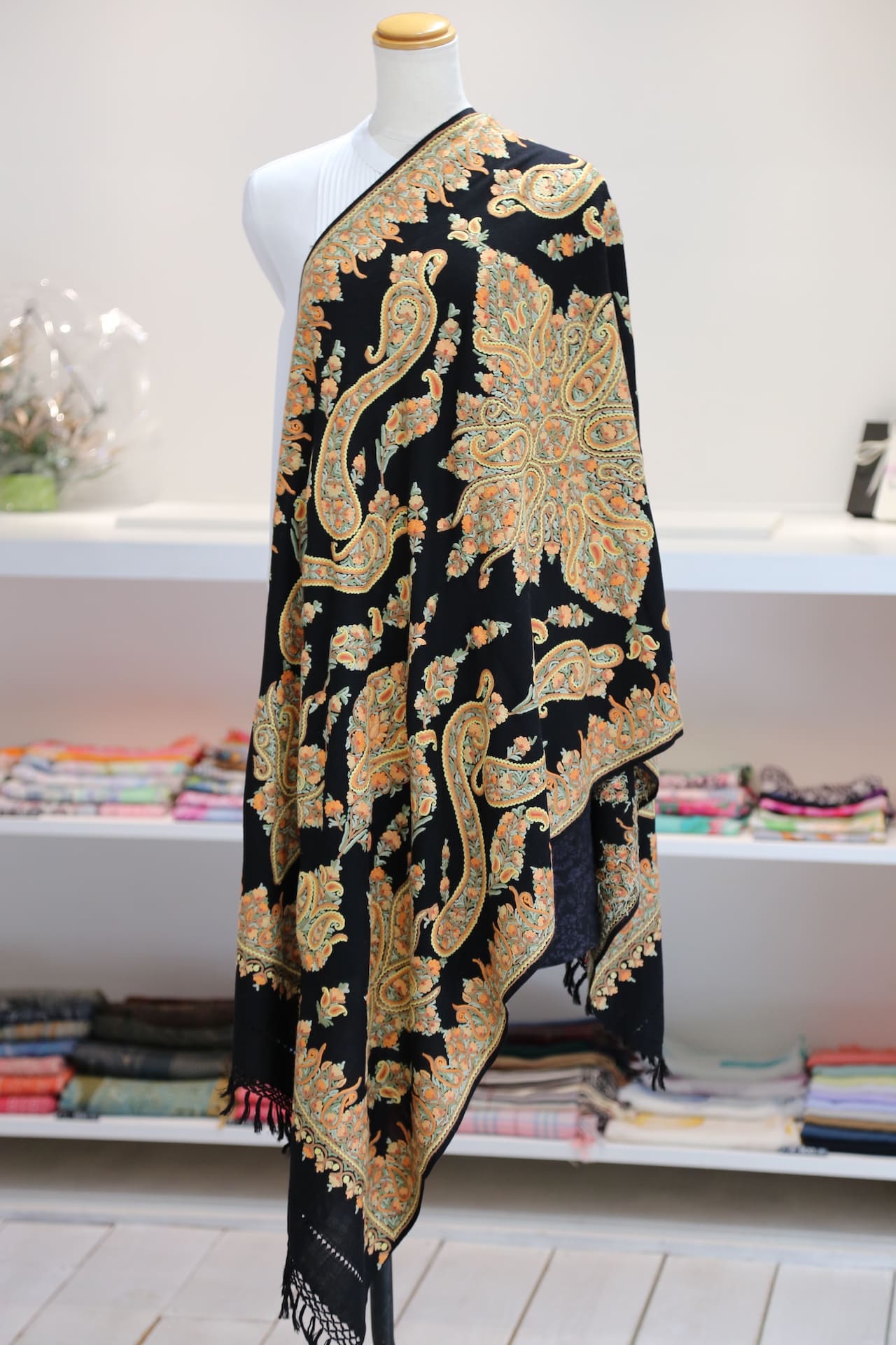 インドでこのストールを初めて見た時も、この色柄と緻密な刺繍にため息が出ました。
