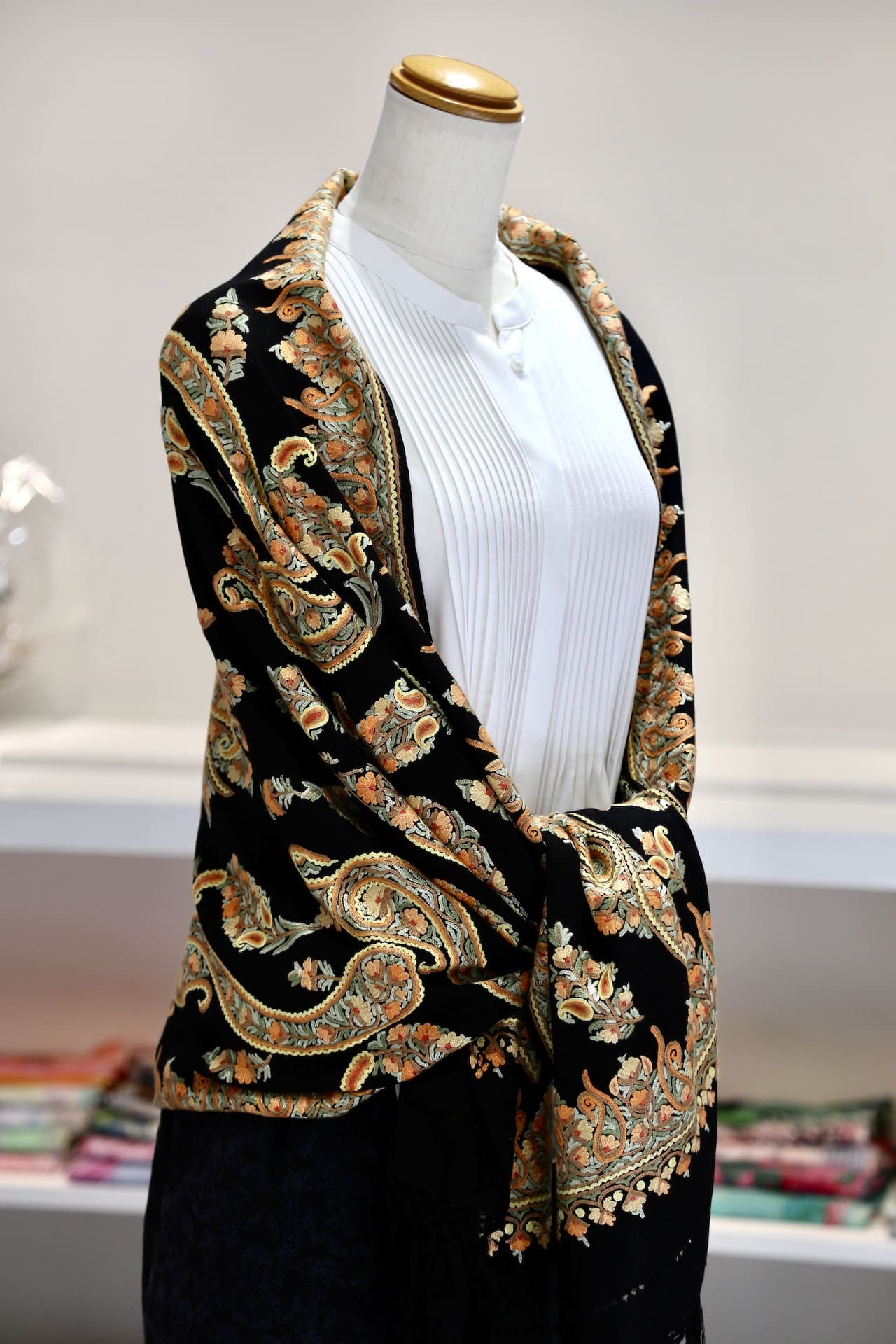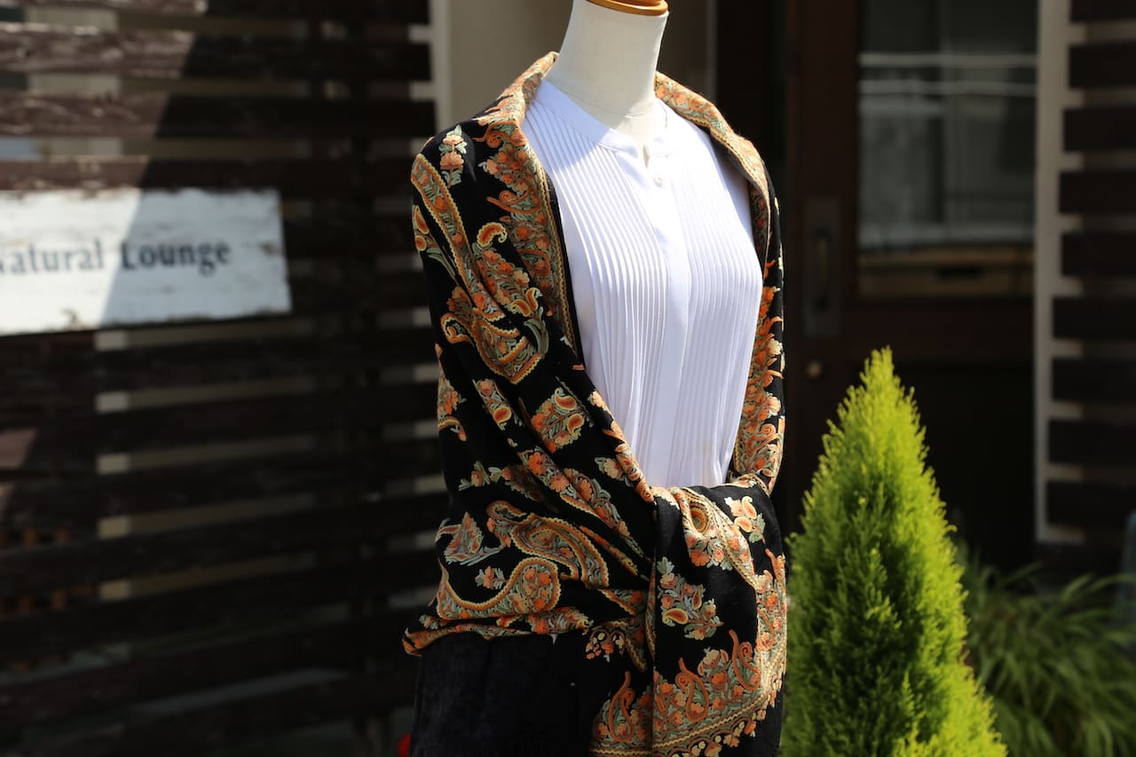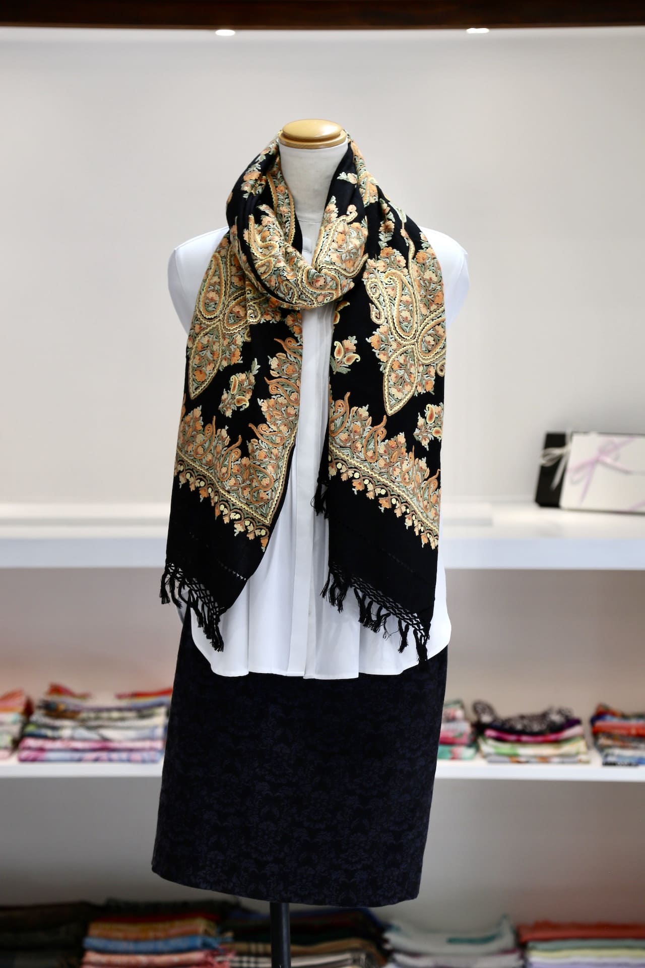 インドでこのストールを初めて見た時も、この色柄と緻密な刺繍にため息が出ました。