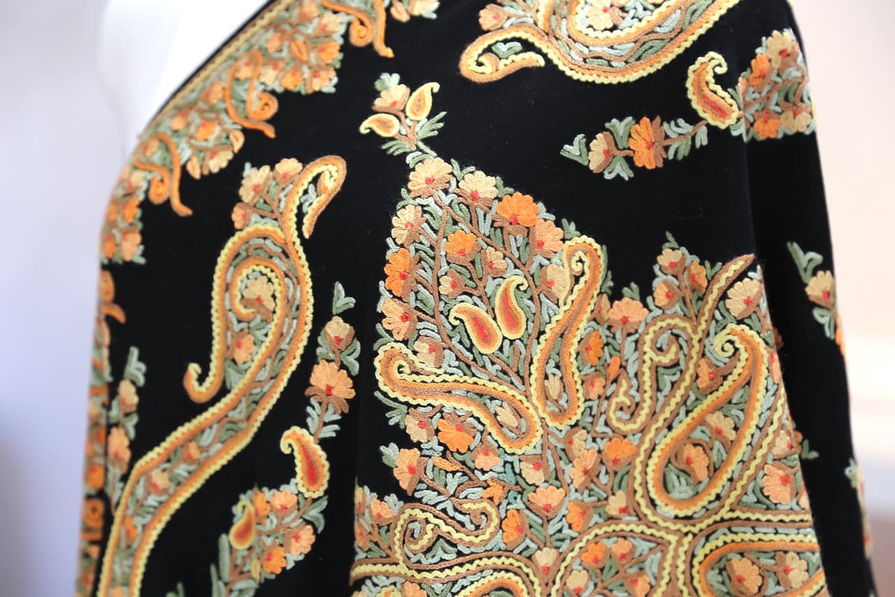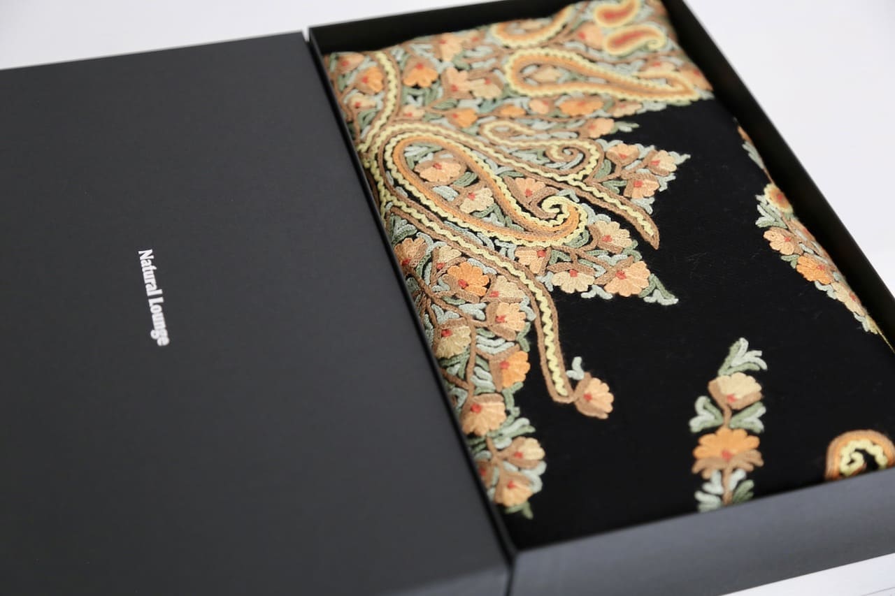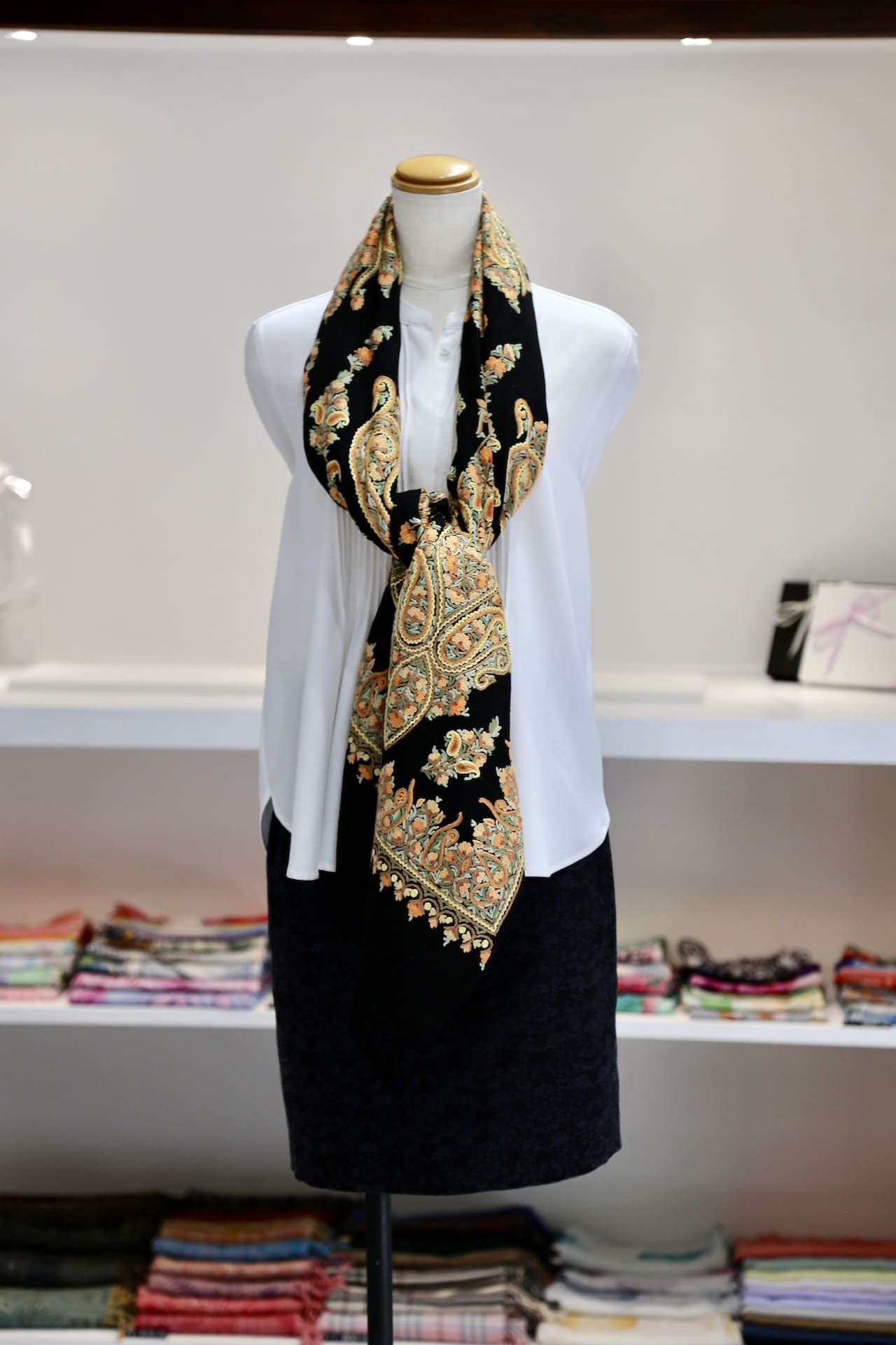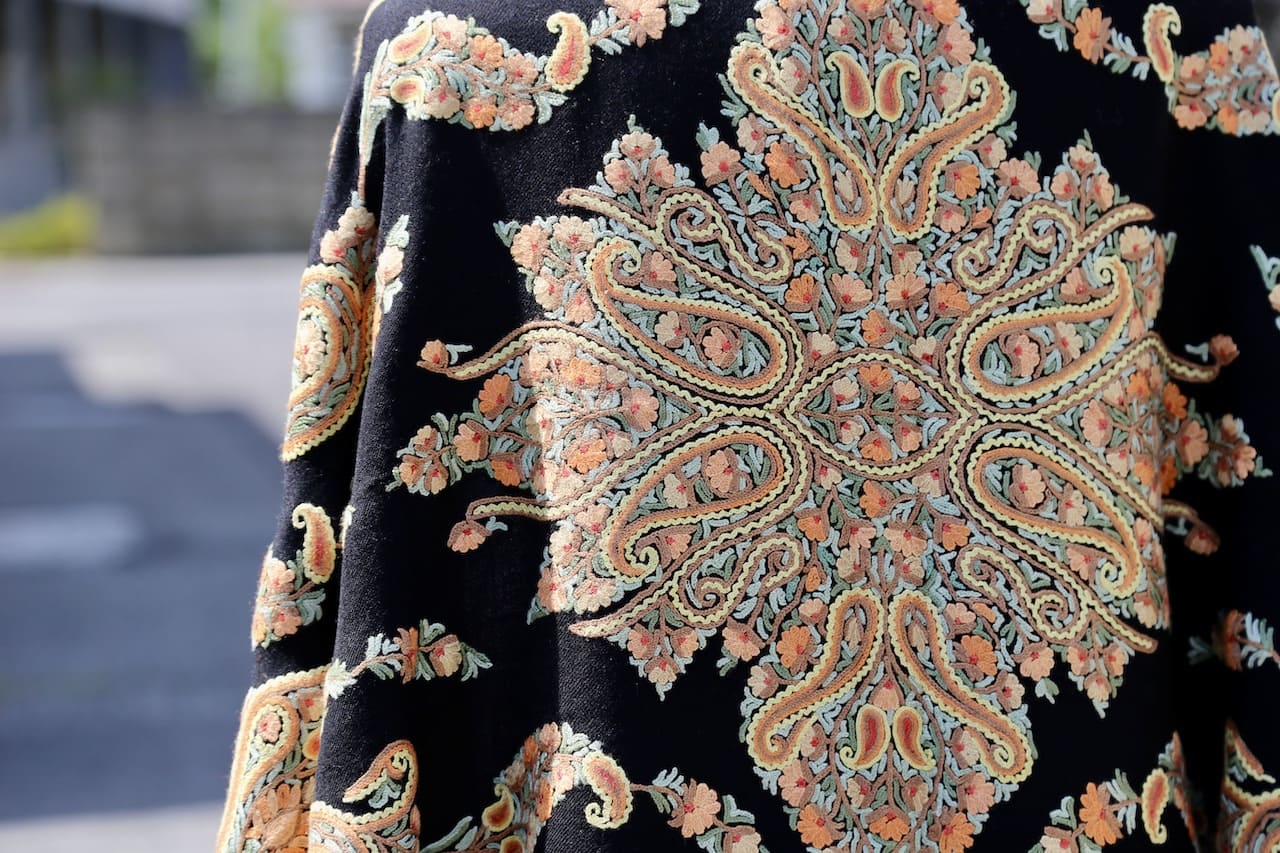 インドでこのストールを初めて見た時も、この色柄と緻密な刺繍にため息が出ました。