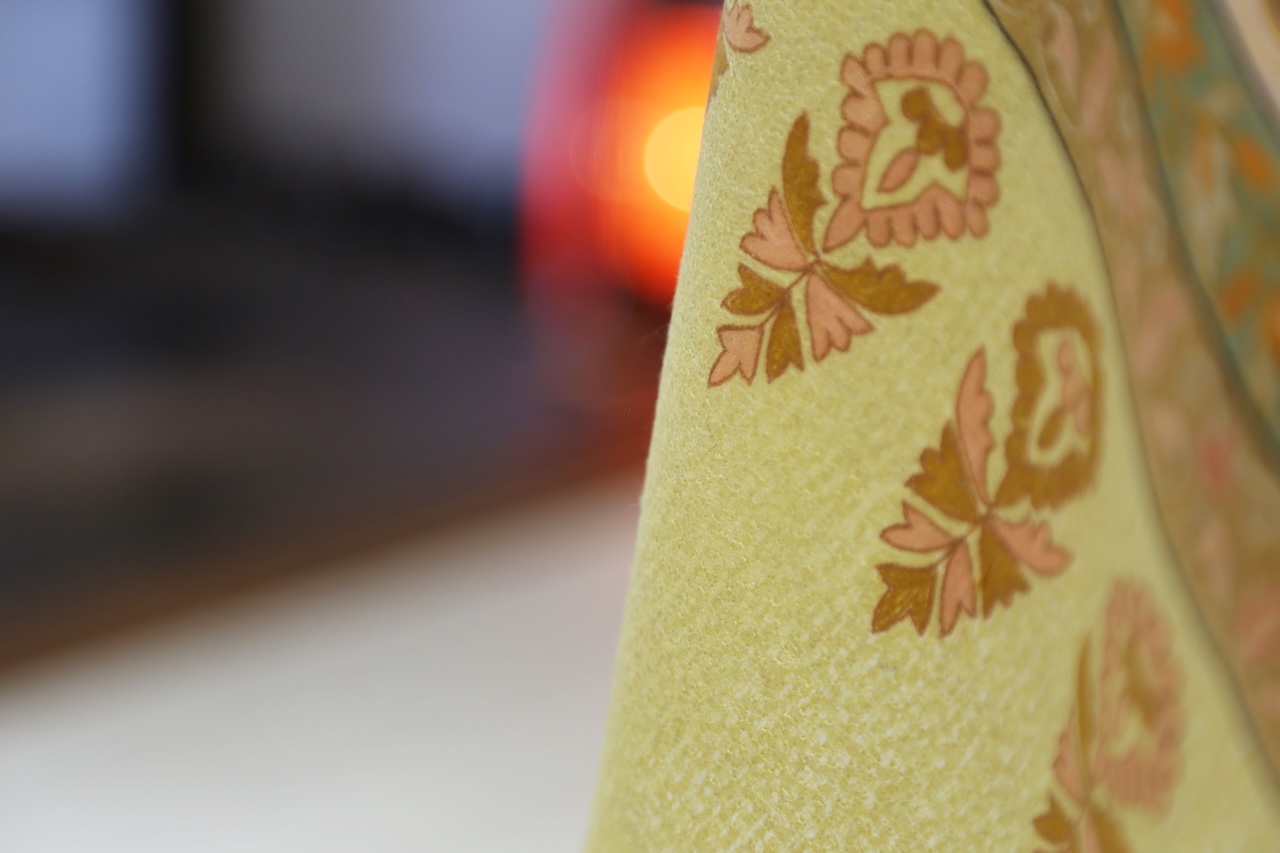 ベースカラーも黄蘗色、黄金色、ベージュ、スカイグレイ、パステルピンク、百緑、サンフラワーなどの多種多様のカラーで構成されていて、さらに刺繍糸もゴールド、マリーゴールド、サンライト、金糸雀、シェルピンク、エバーグリーン、オフホワイトと数えきれないほど。