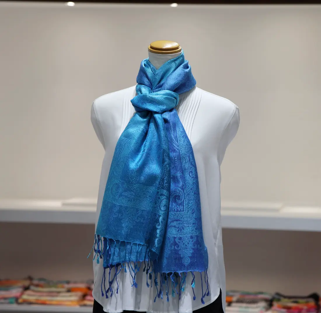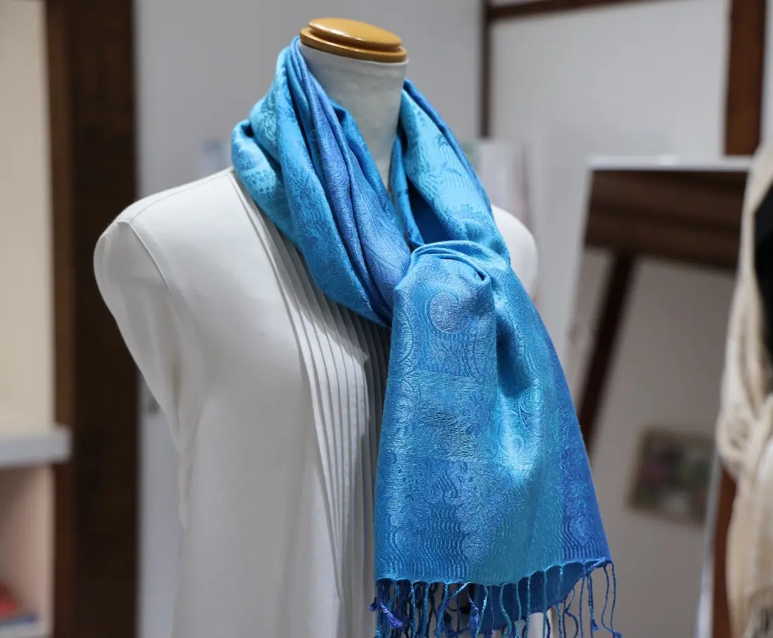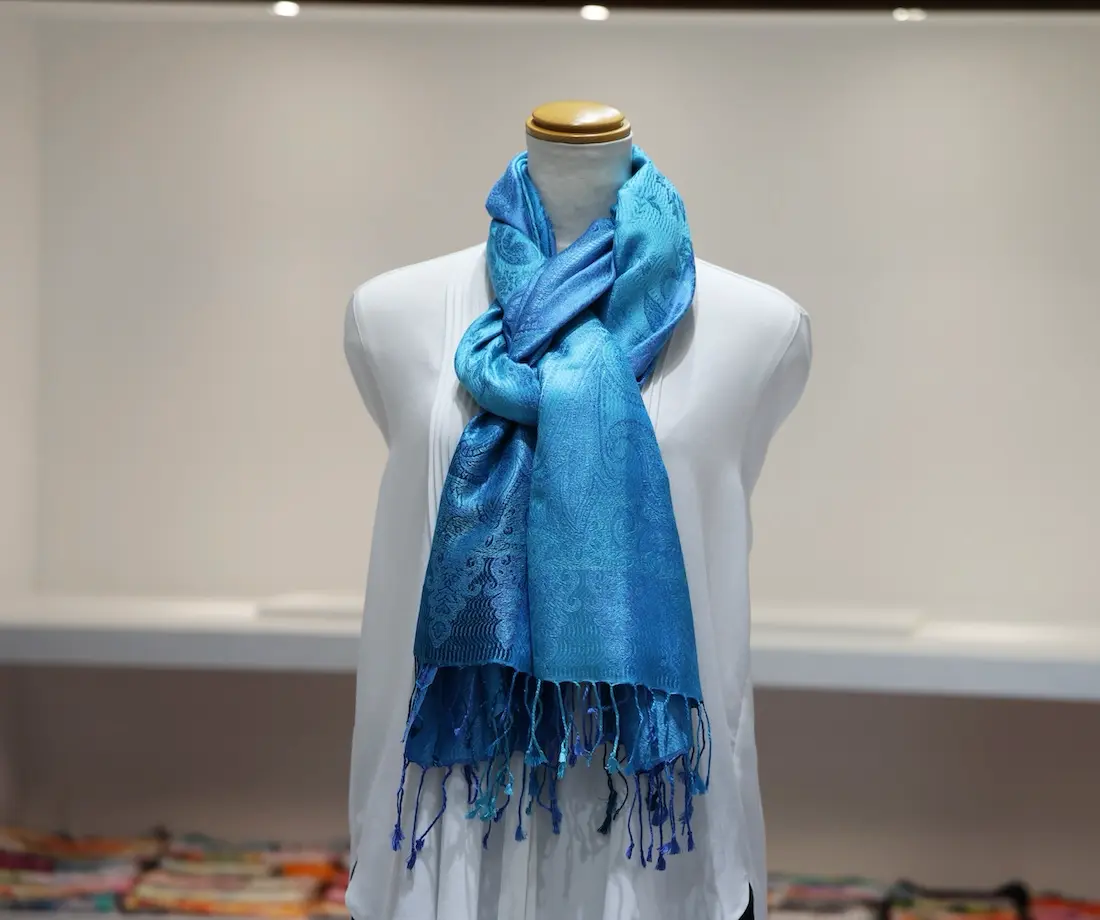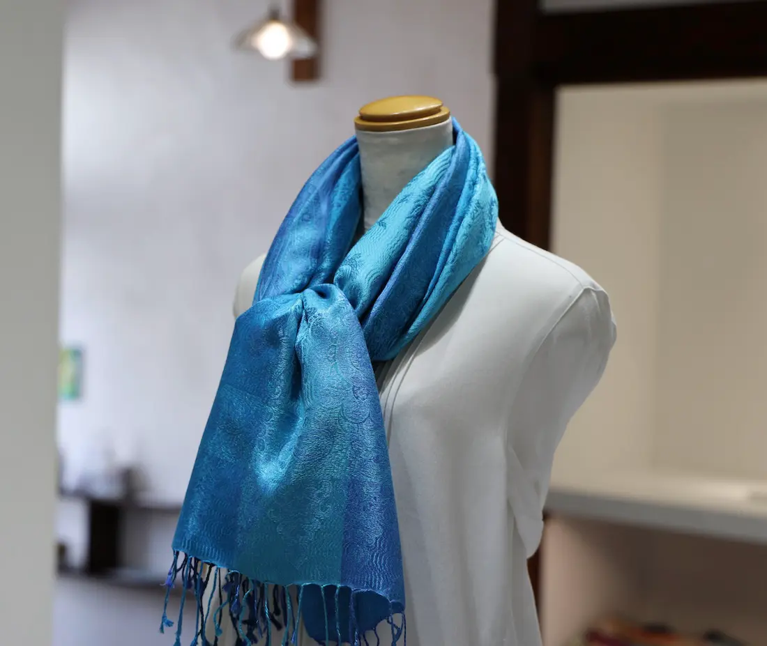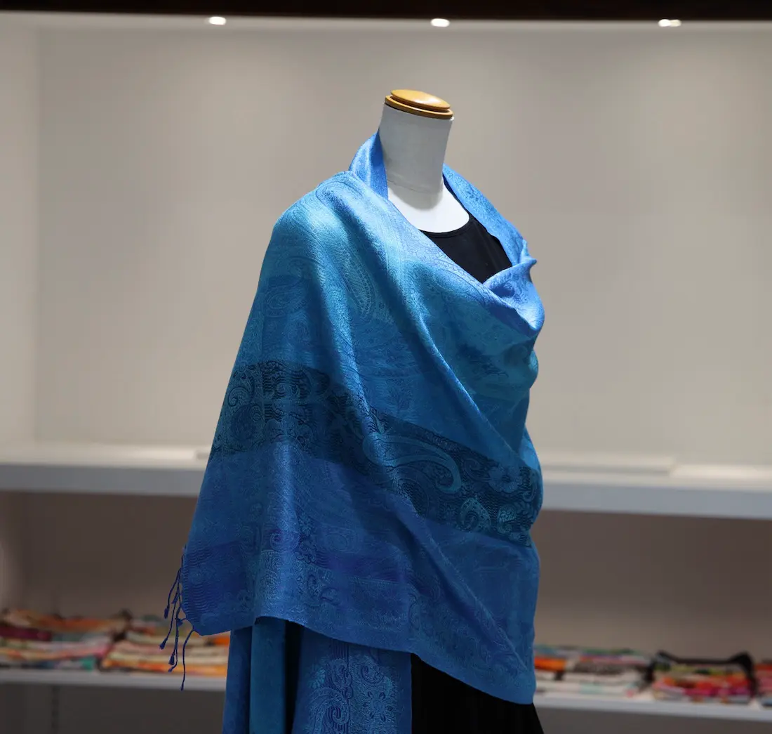 通常の単色ではなく、トーンの異なる複数のブルーカラーで構成されているところもこのストールならではの一つの特徴になります。