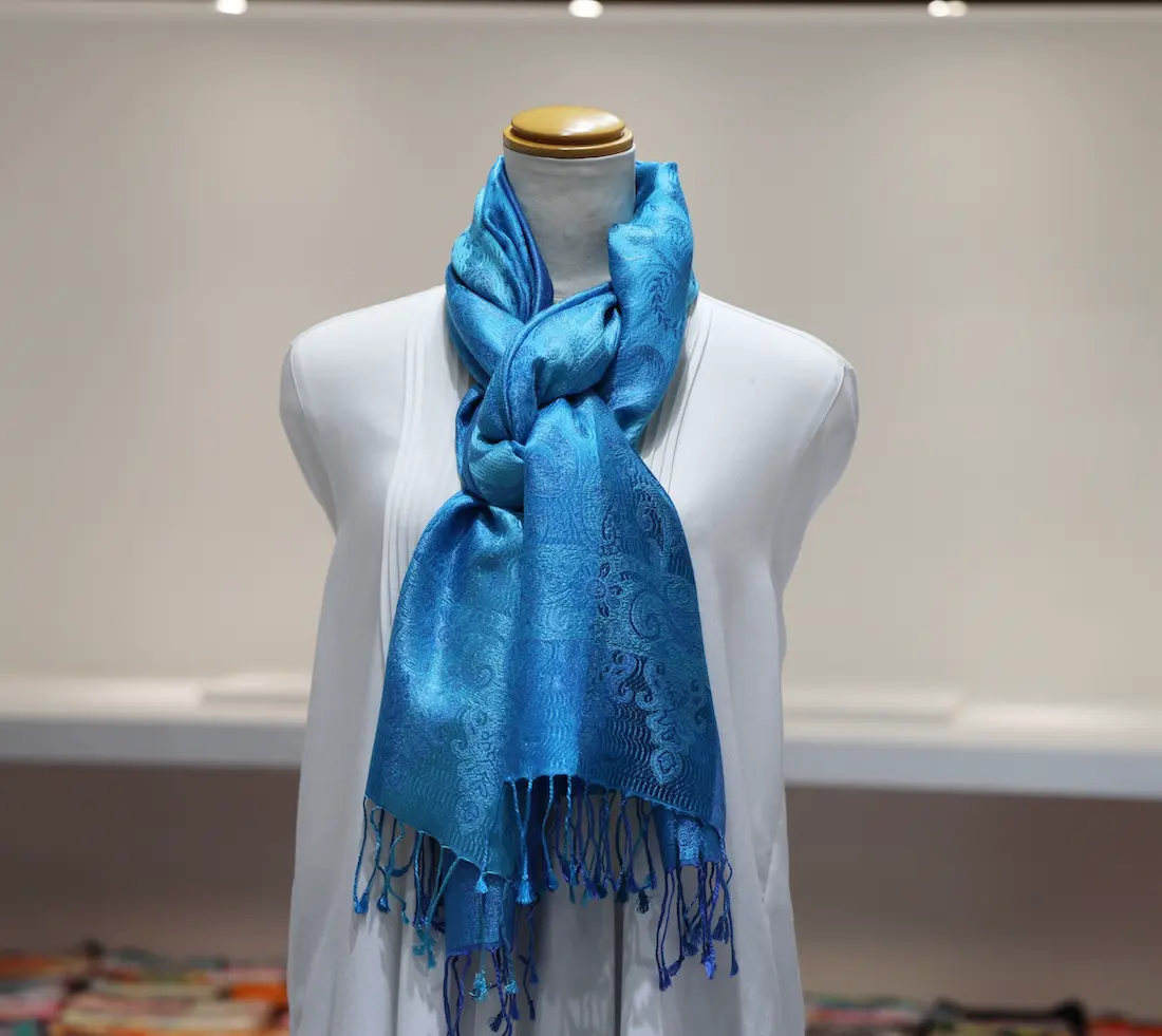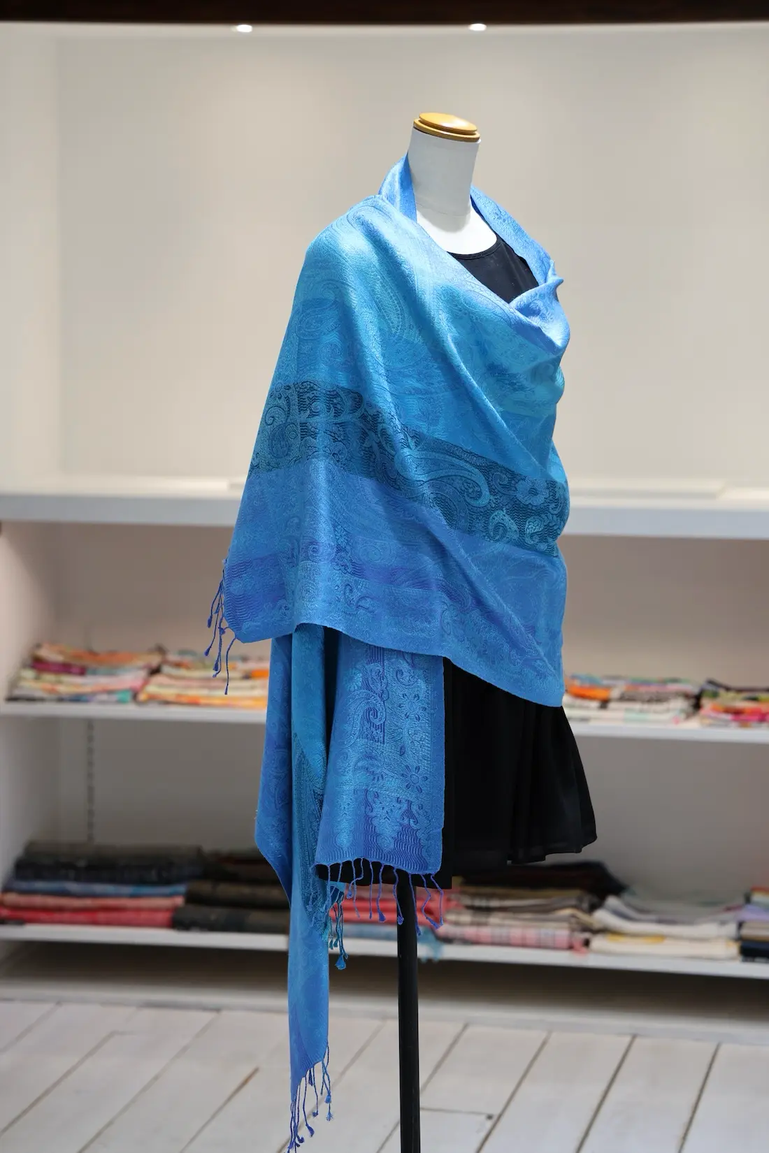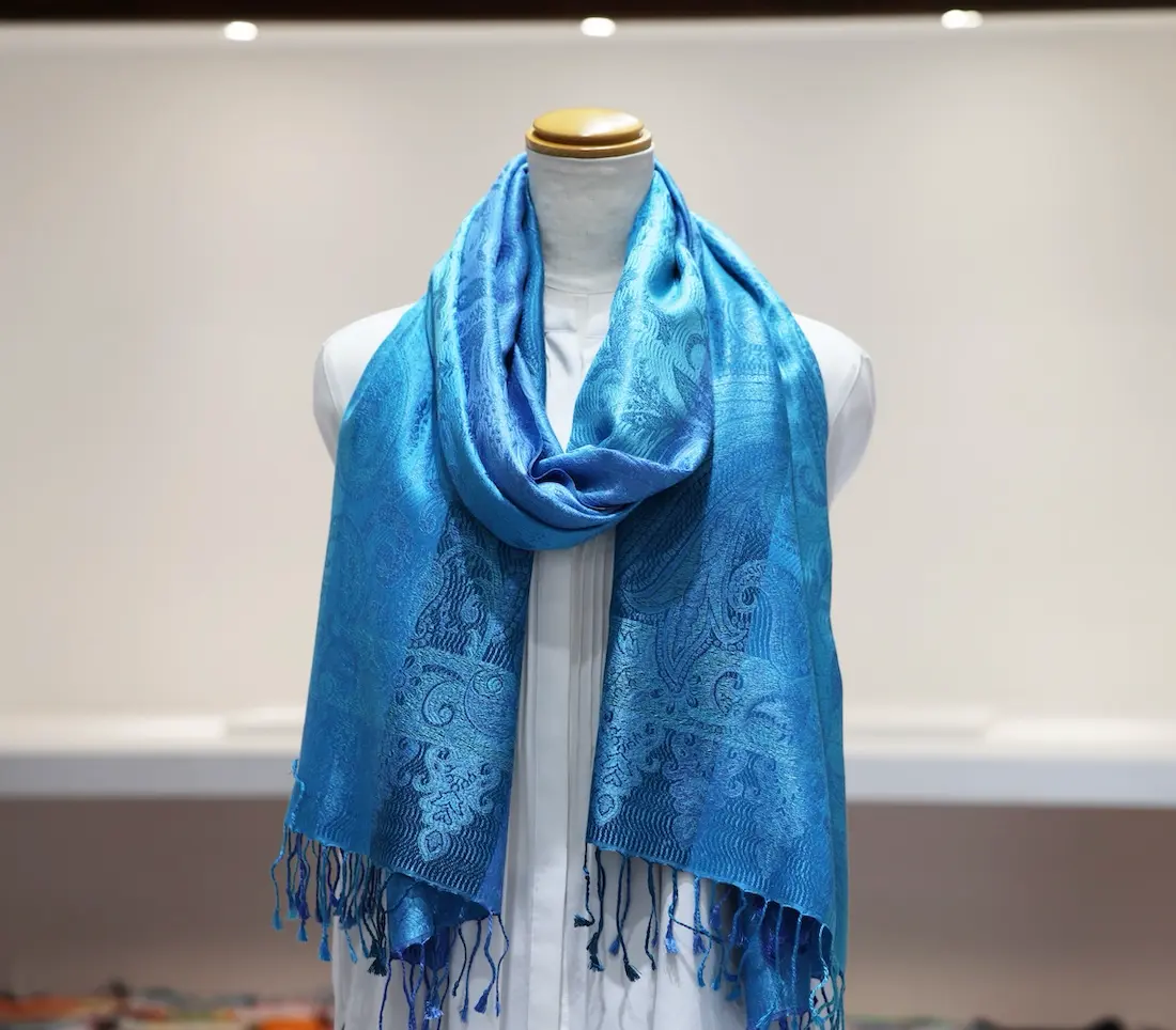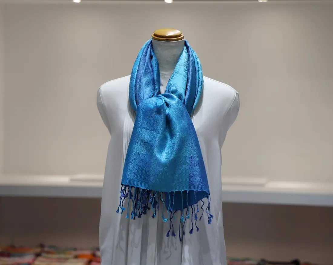 通常の単色ではなく、トーンの異なる複数のブルーカラーで構成されているところもこのストールならではの一つの特徴になります。