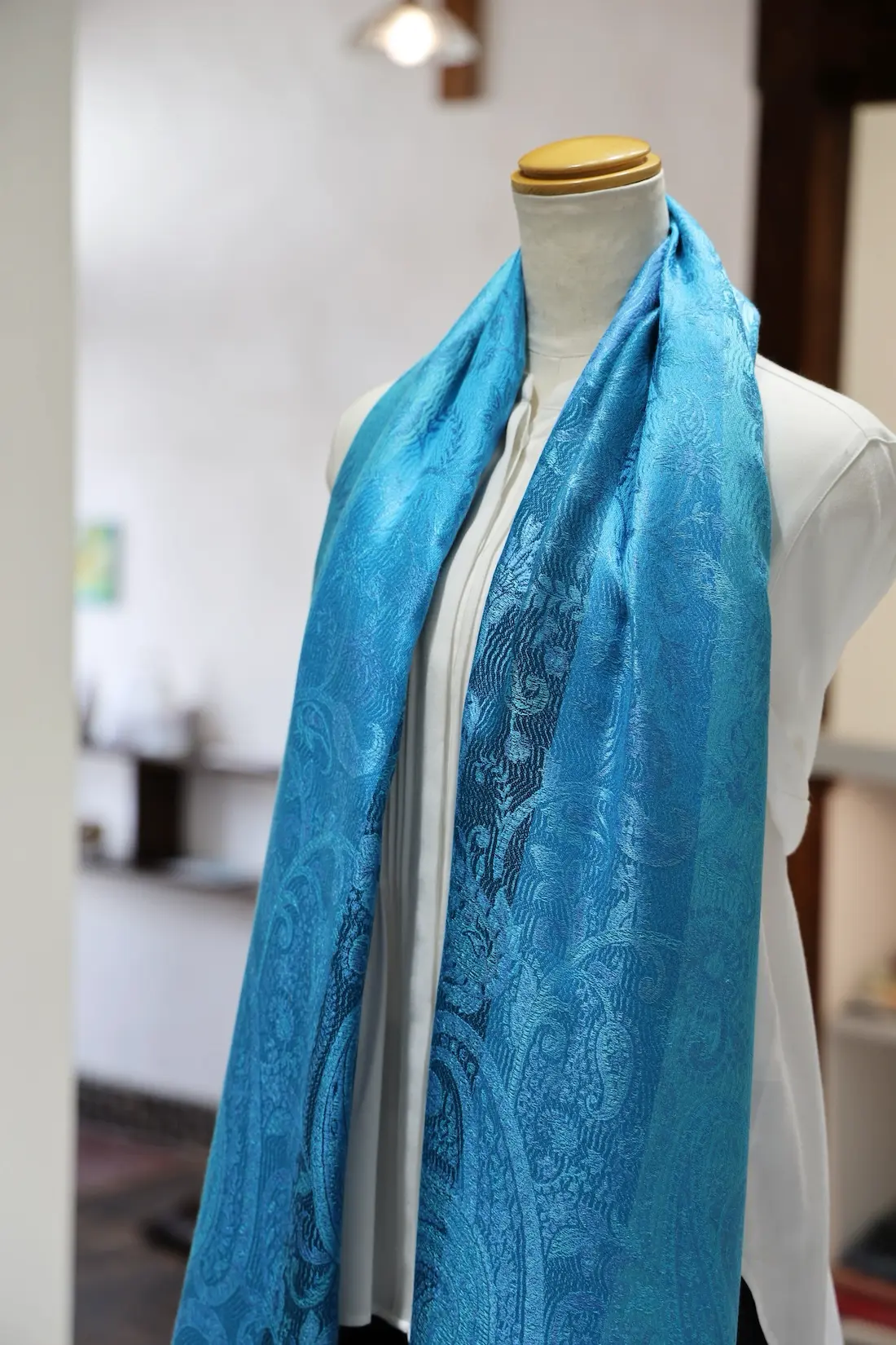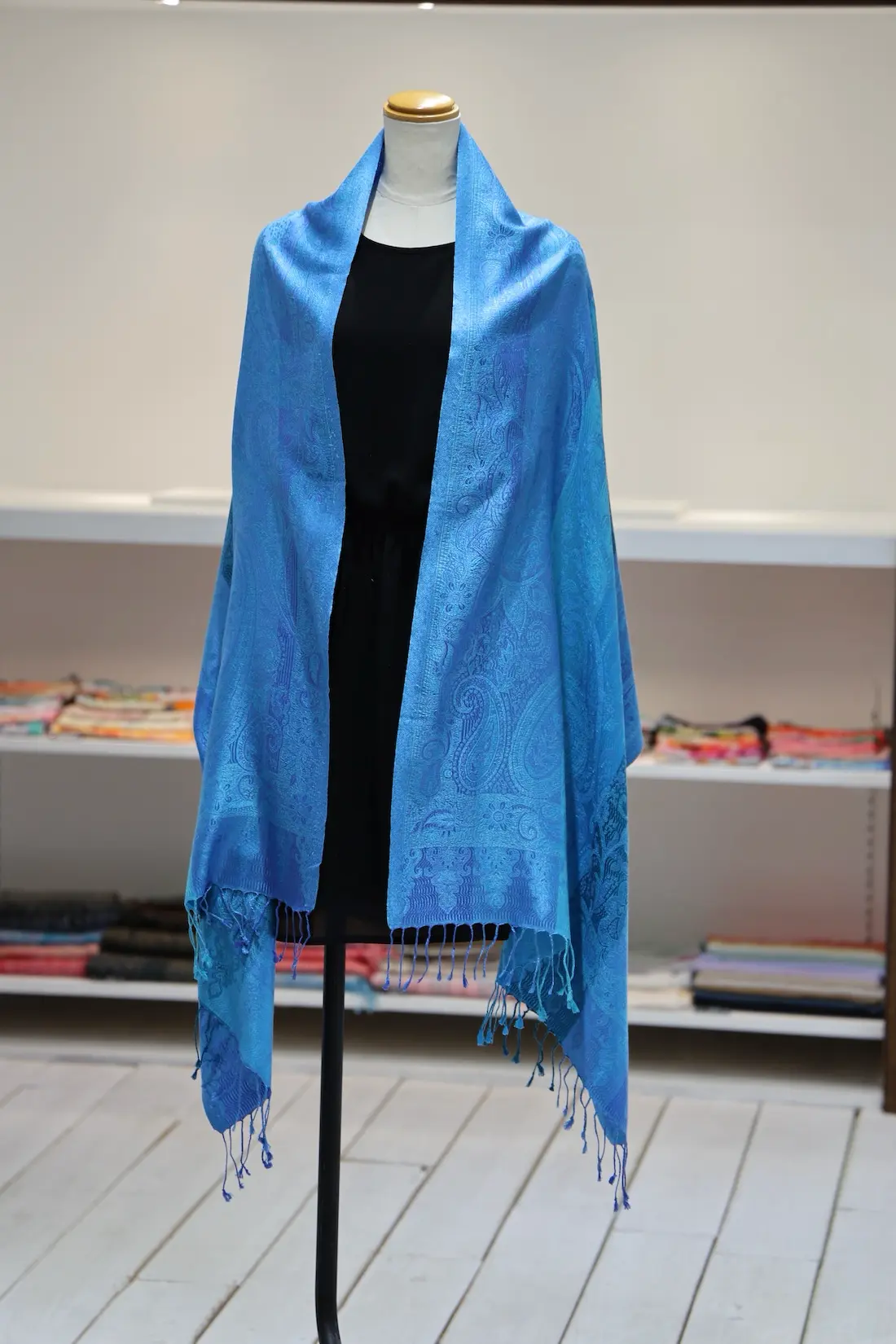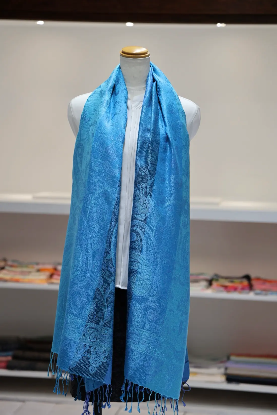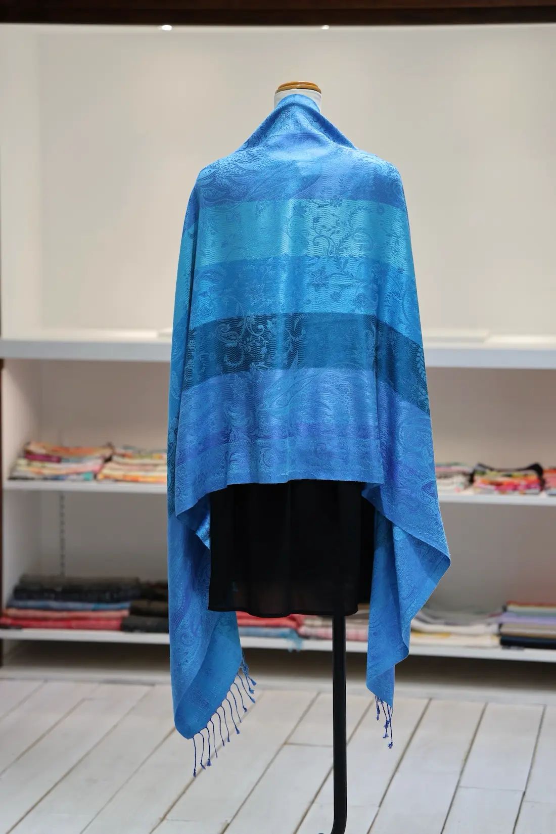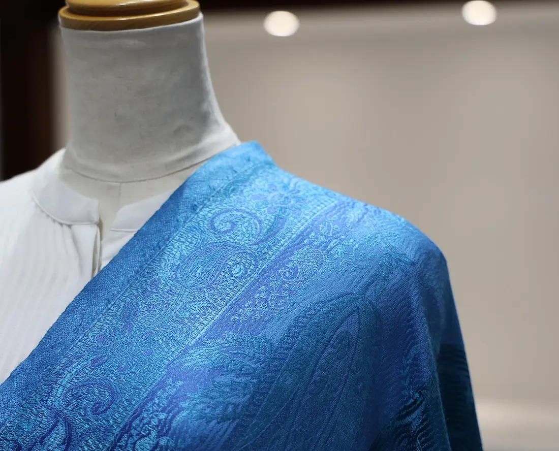 通常の単色ではなく、トーンの異なる複数のブルーカラーで構成されているところもこのストールならではの一つの特徴になります。