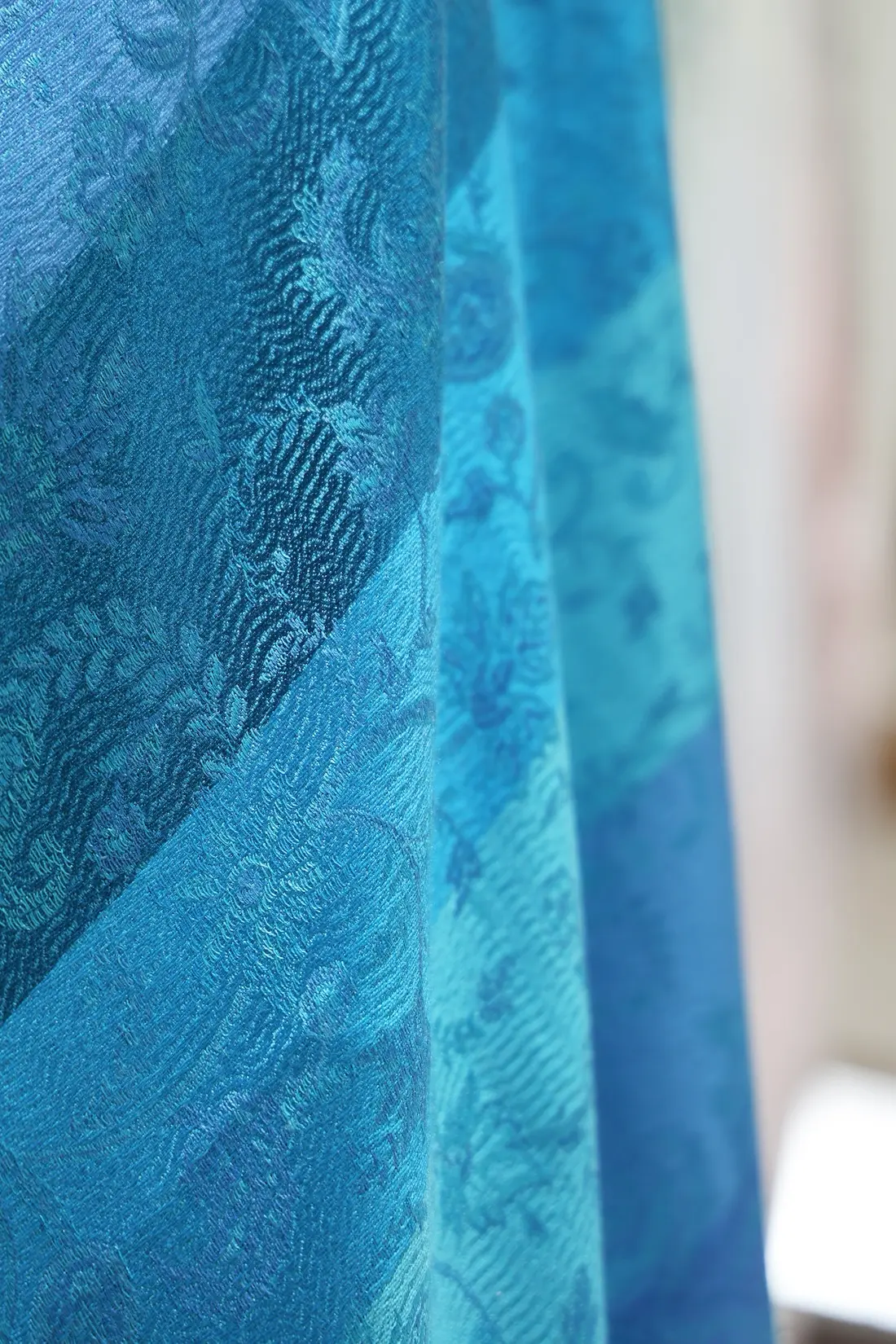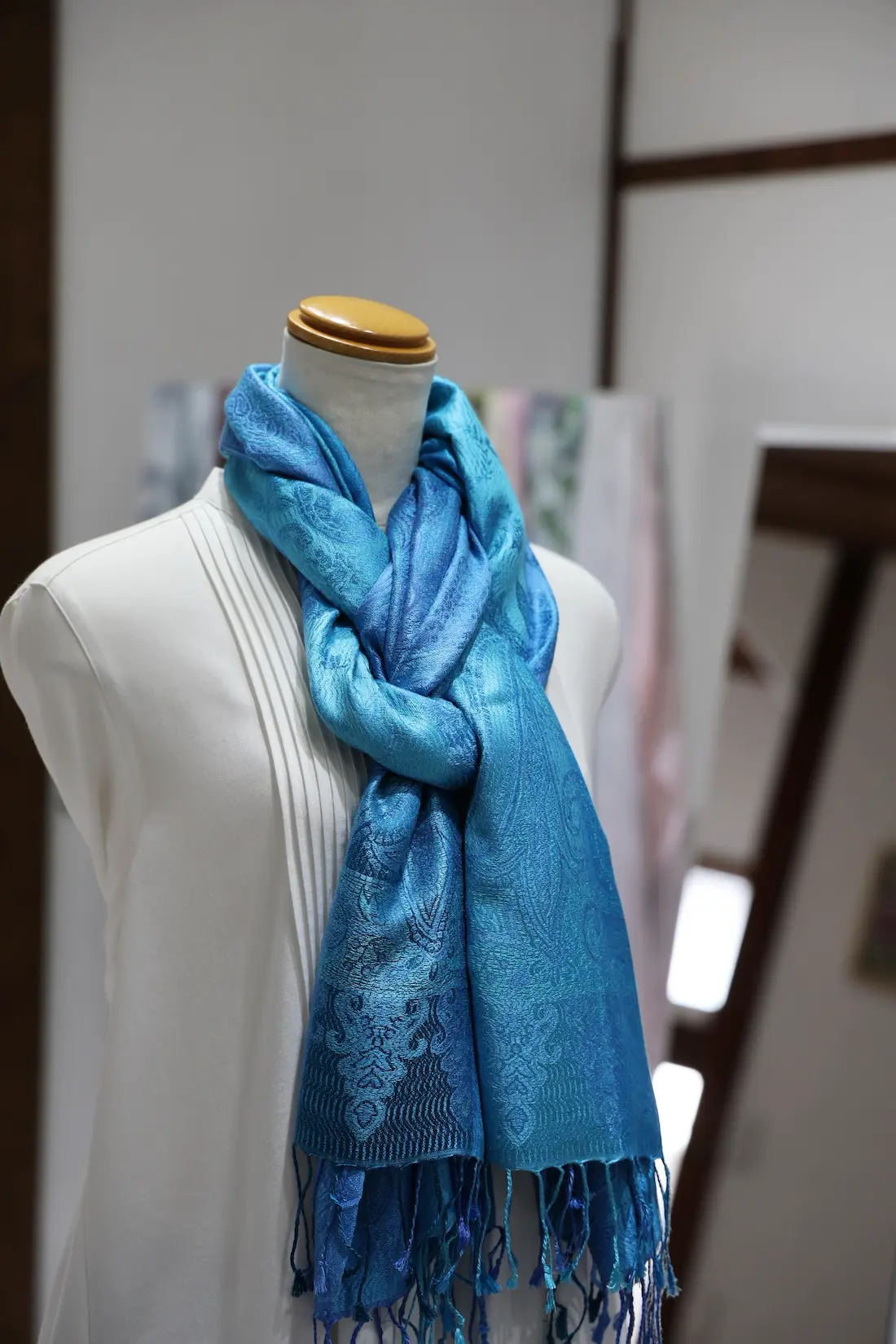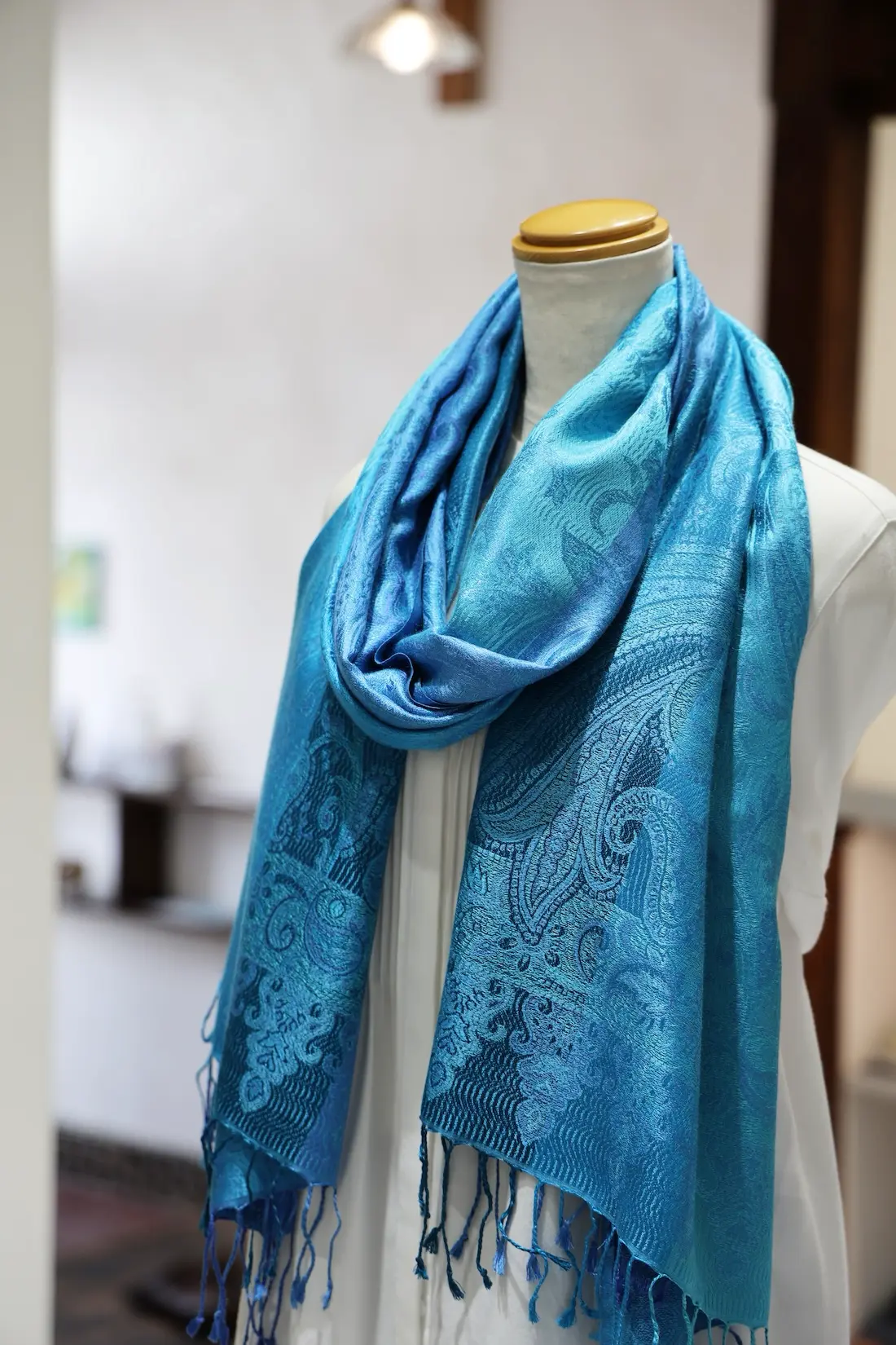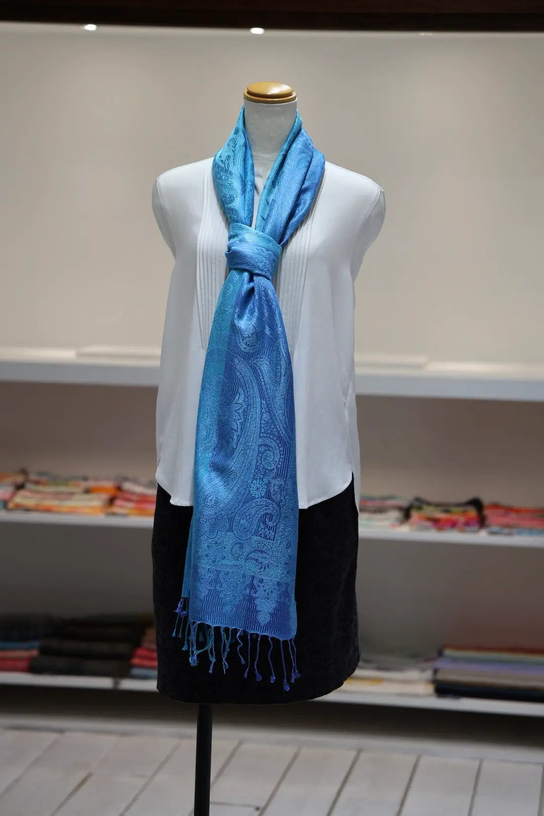 通常の単色ではなく、トーンの異なる複数のブルーカラーで構成されているところもこのストールならではの一つの特徴になります。