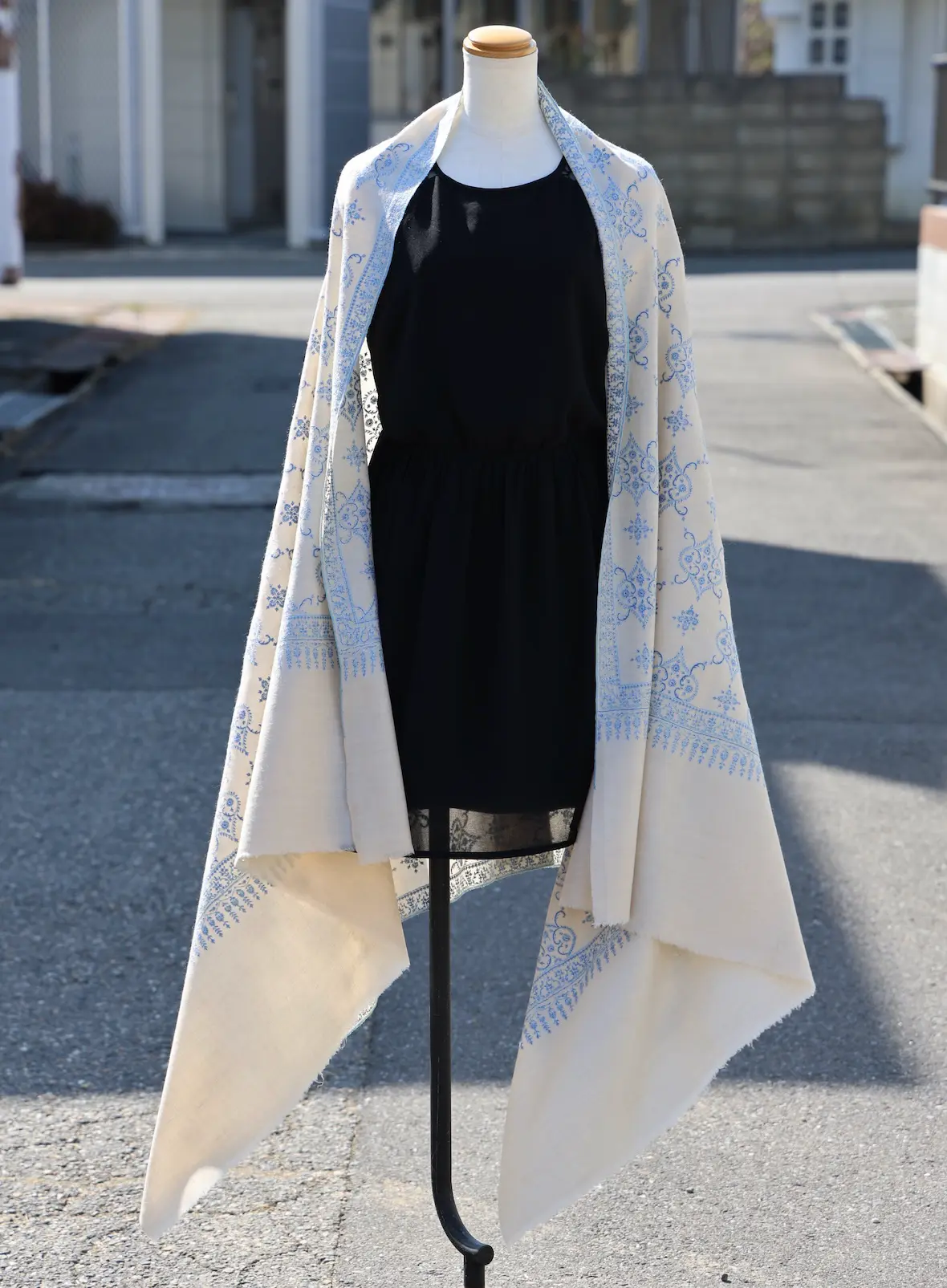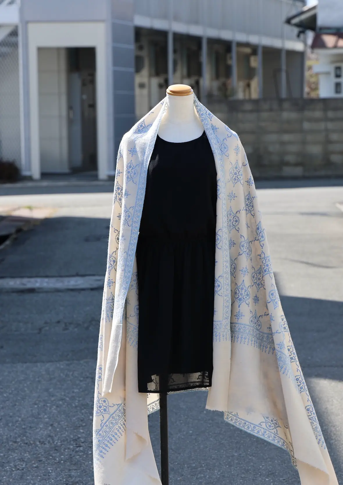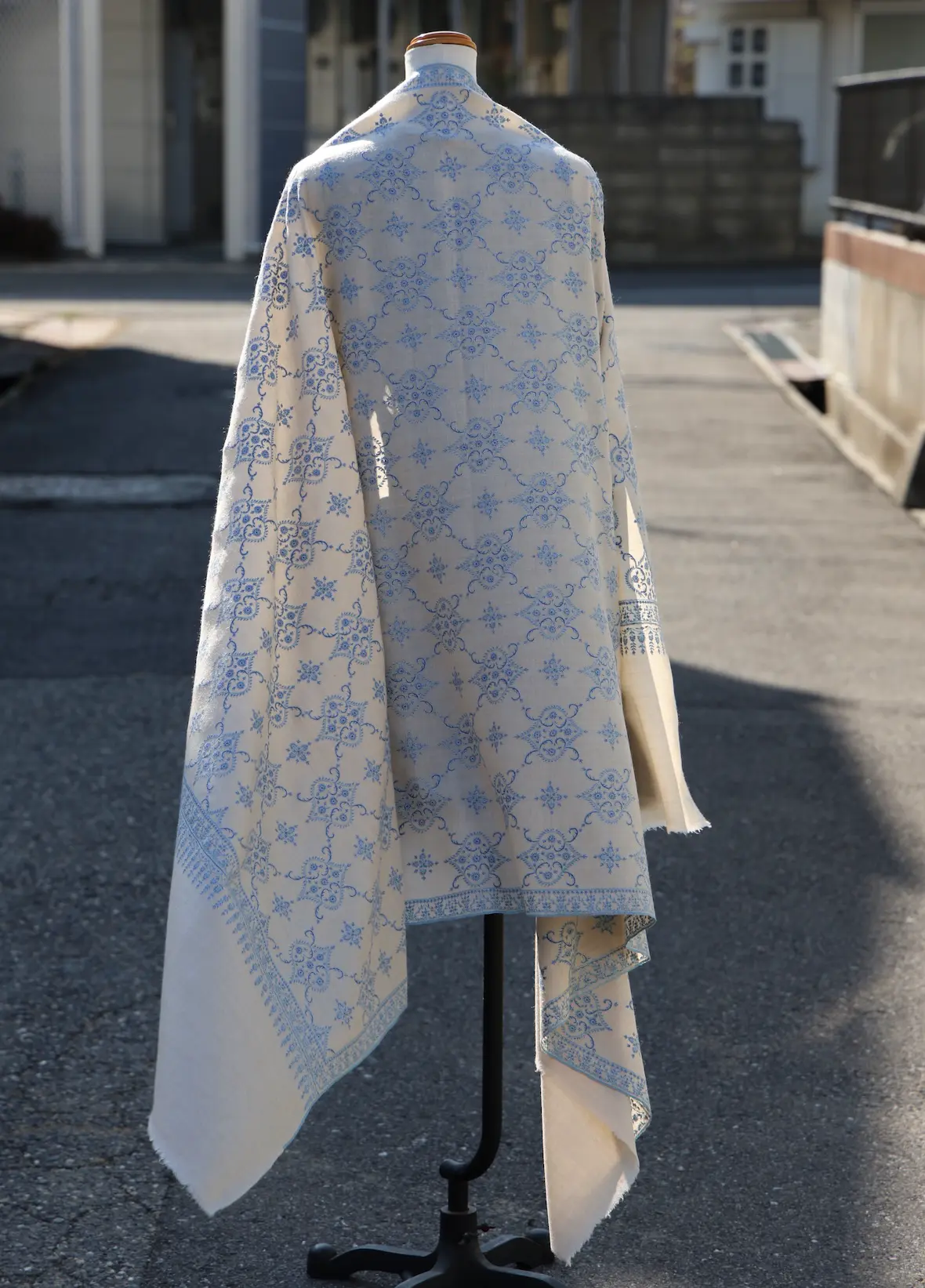このショールは色糸をあえて絞り、ロイヤルブルー&スカイブルー&白藍色が使われています。