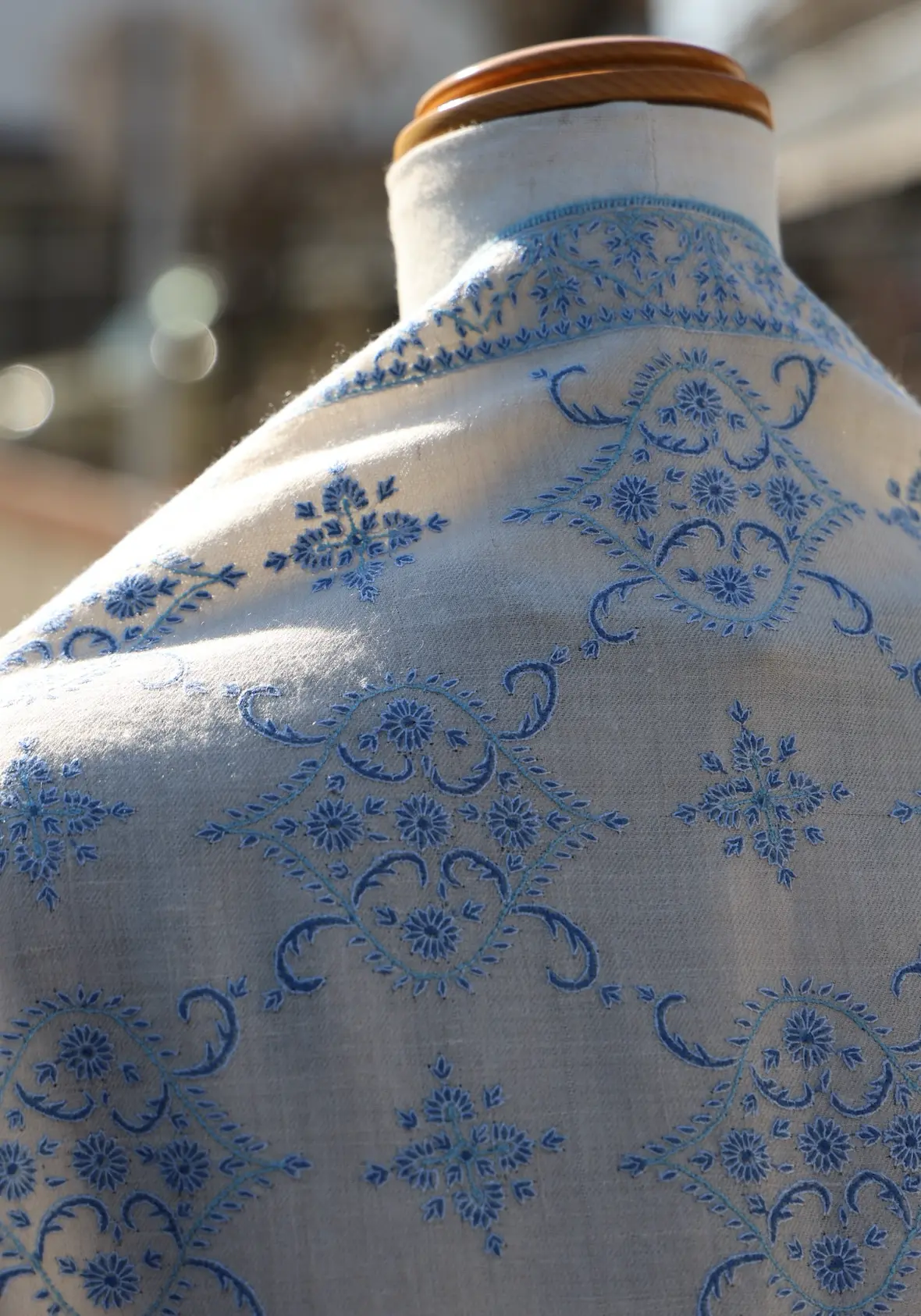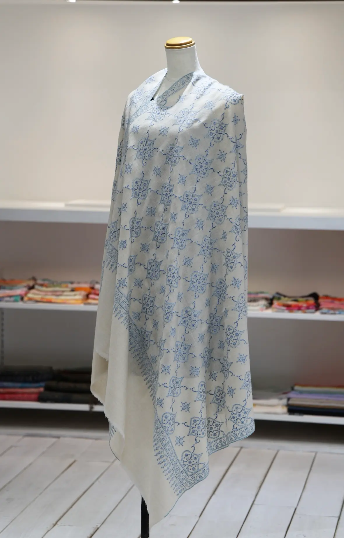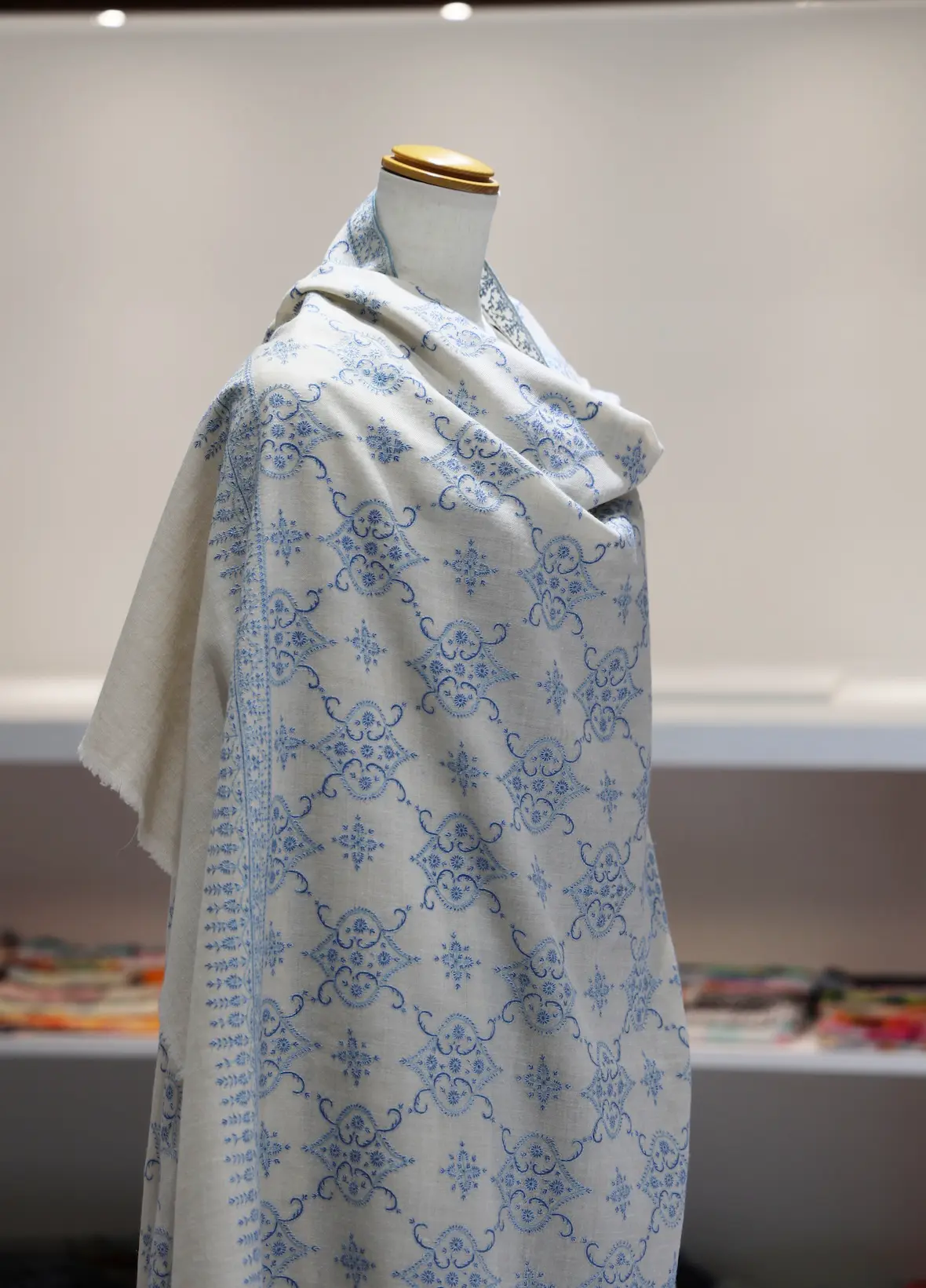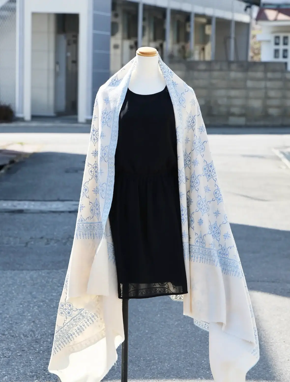 このショールは色糸をあえて絞り、ロイヤルブルー&スカイブルー&白藍色が使われています。