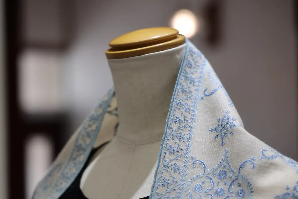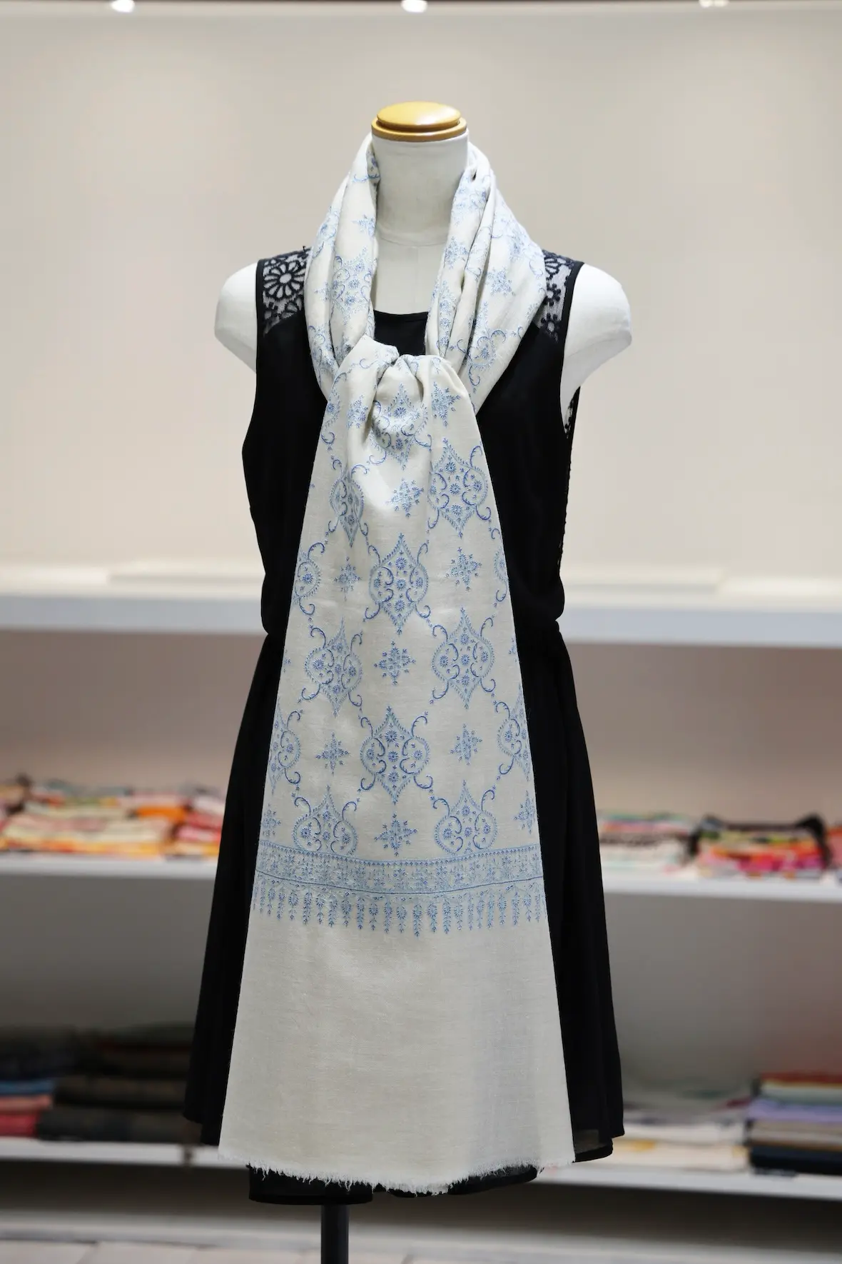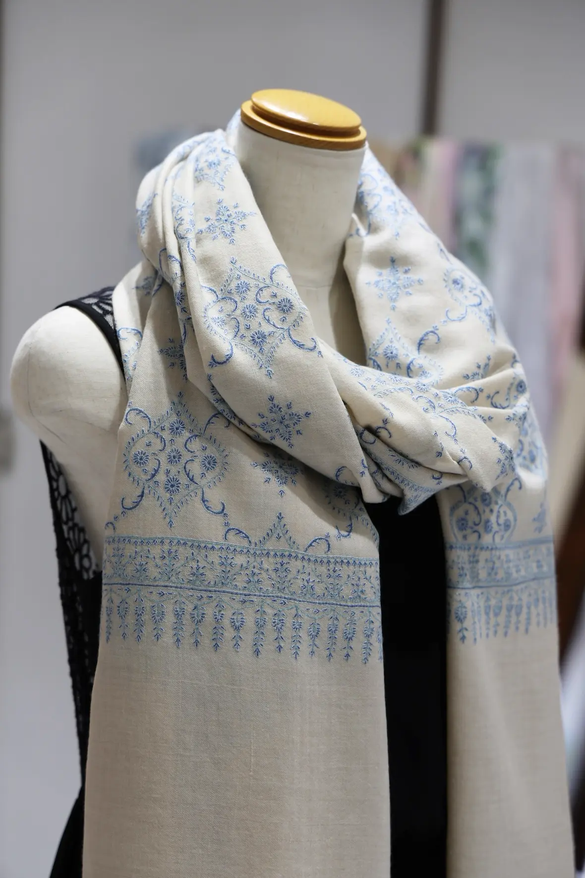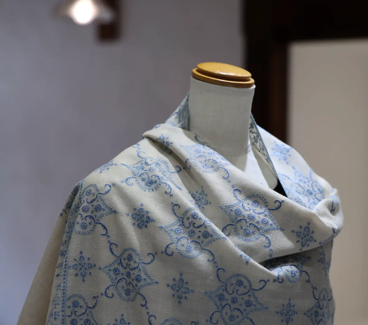 多色使いの手刺繍ストールも素晴らしいですが、あえて色数を抑えた引き算のデザインもとても上品です。