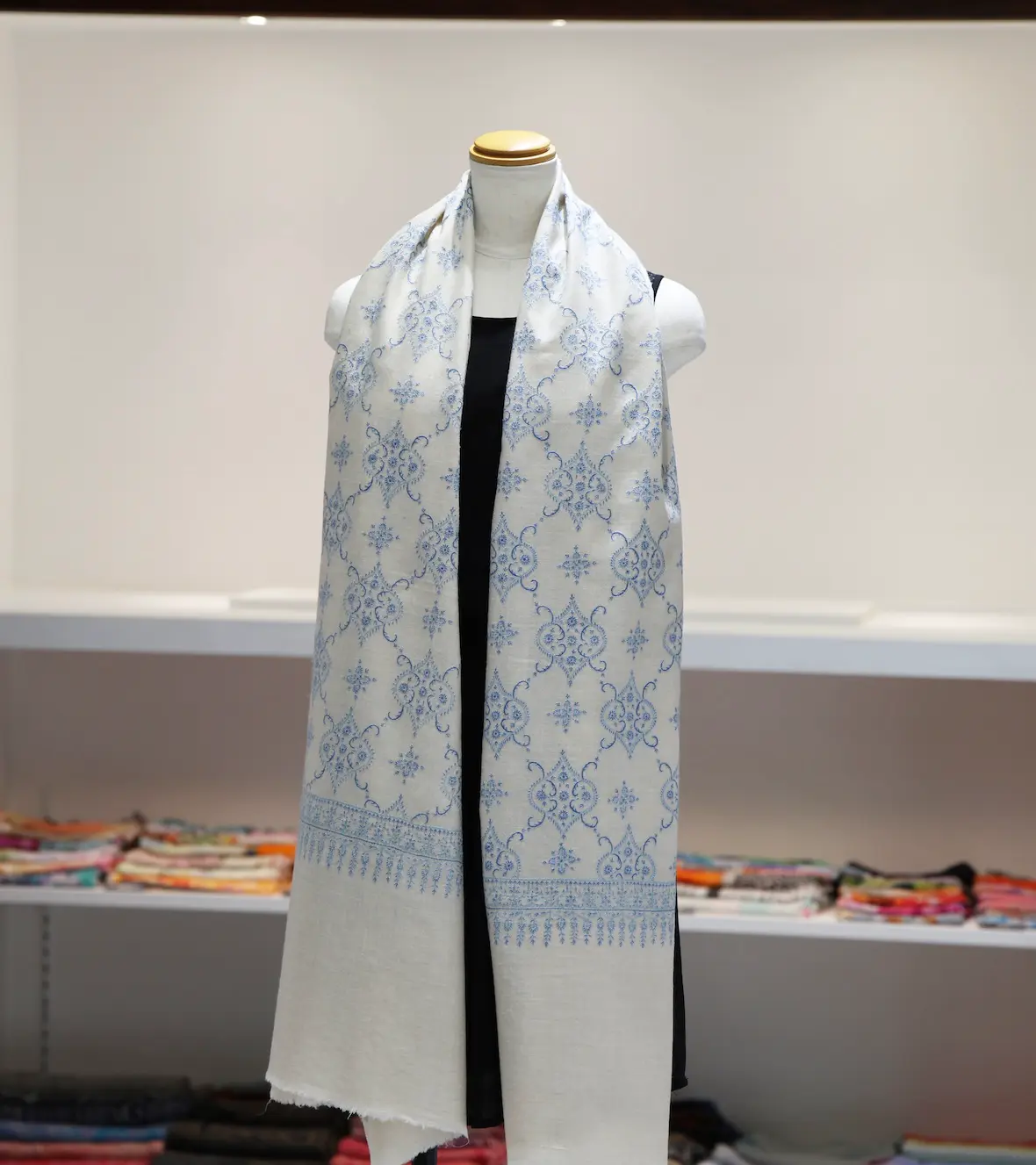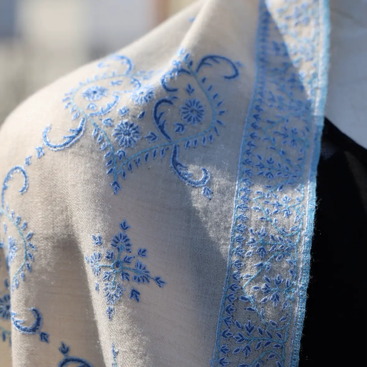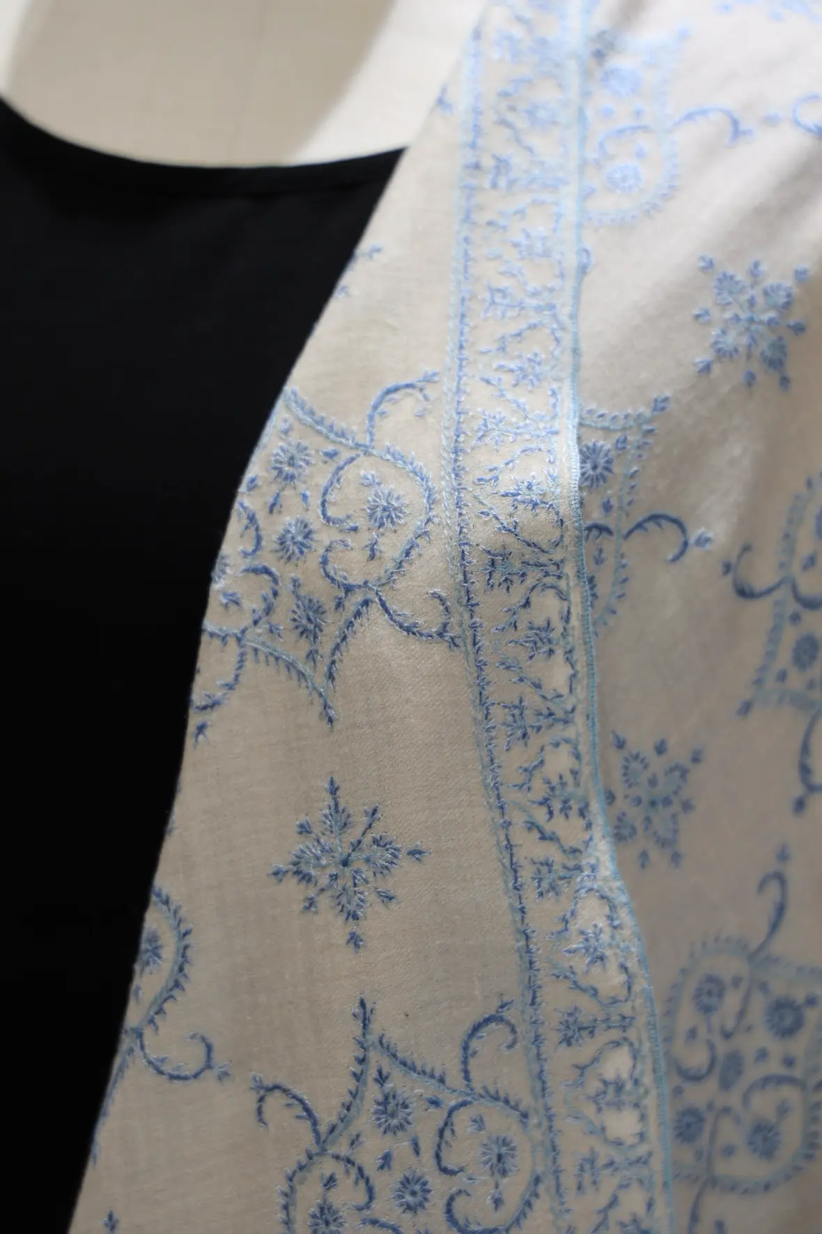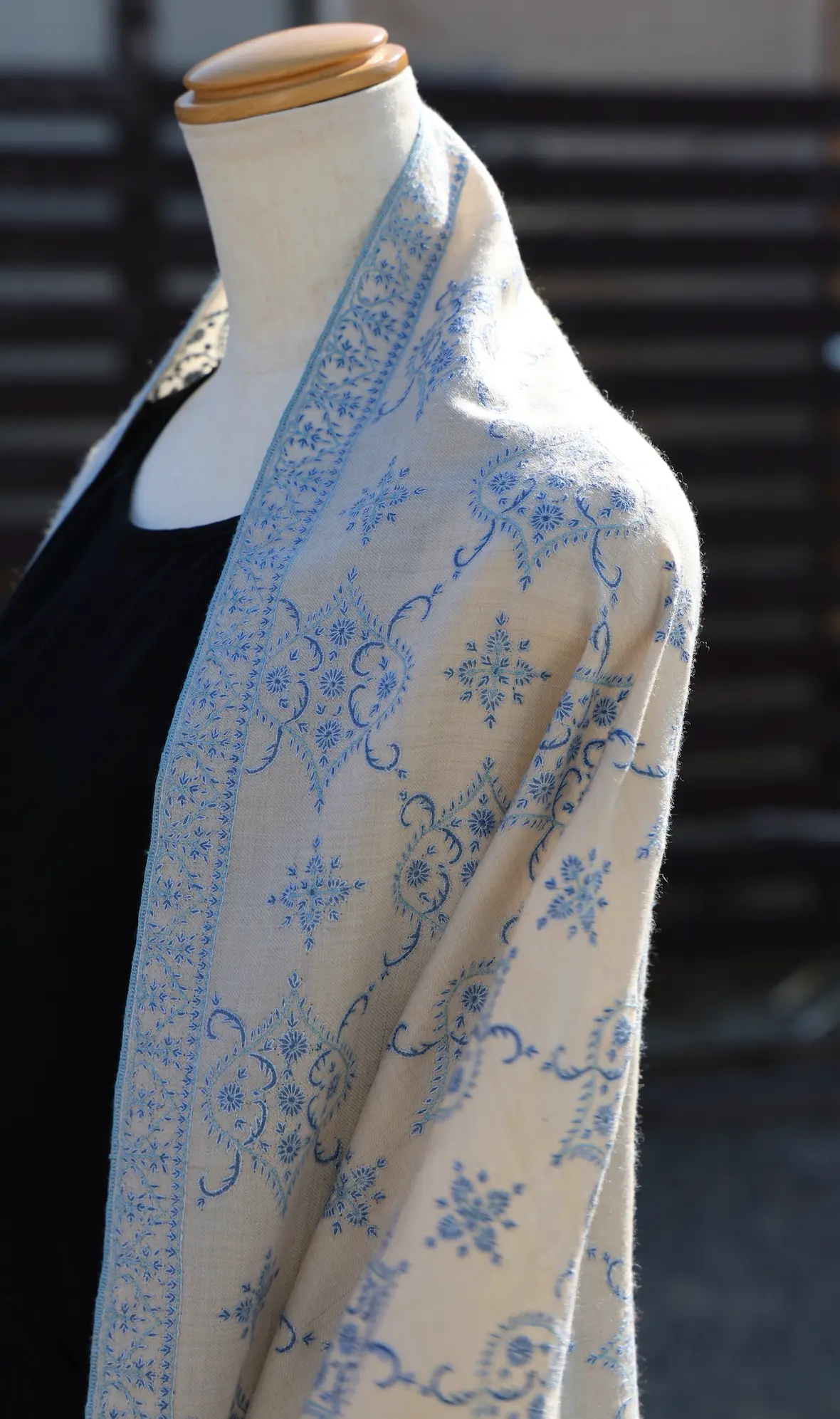 多色使いの手刺繍ストールも素晴らしいですが、あえて色数を抑えた引き算のデザインもとても上品です。