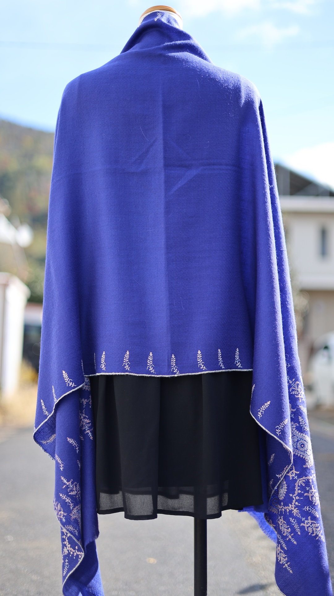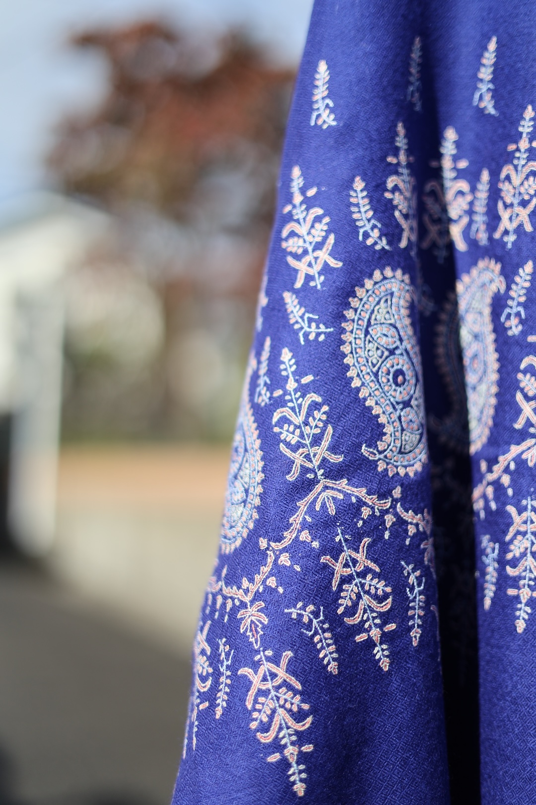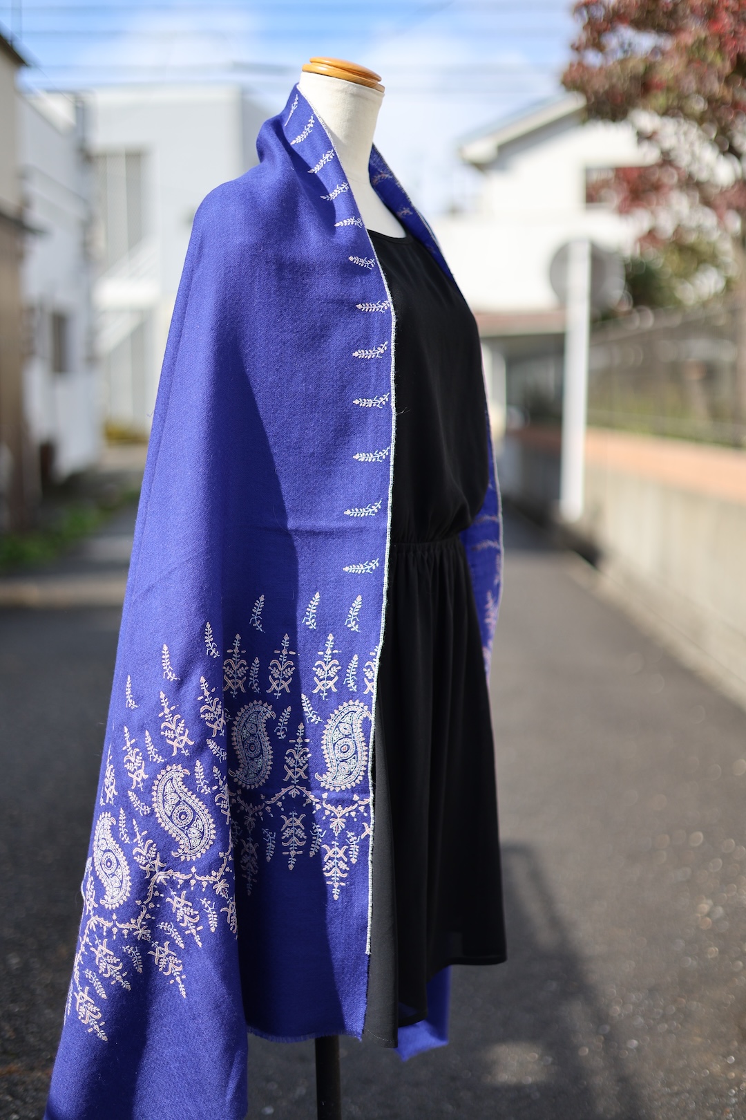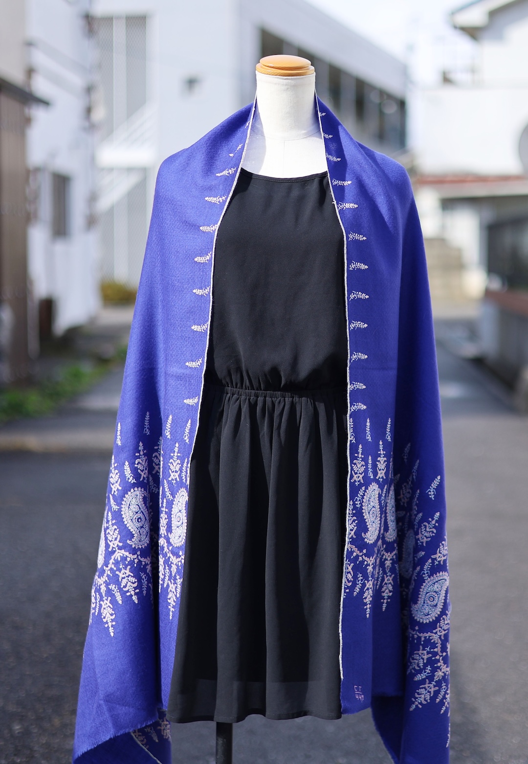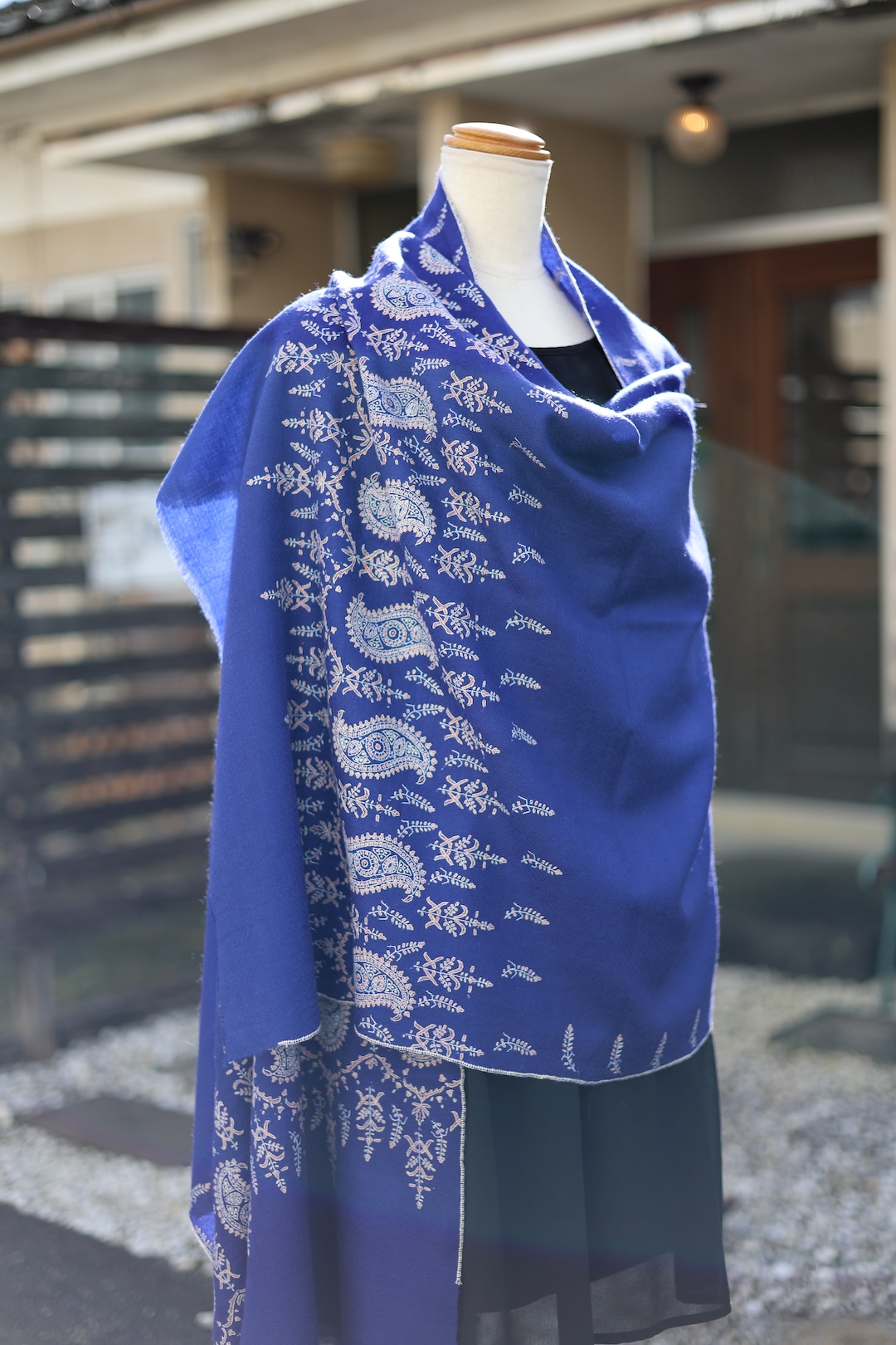 次は美しい瑠璃紺にバランスよく繊細な手刺繍が施されたストール。