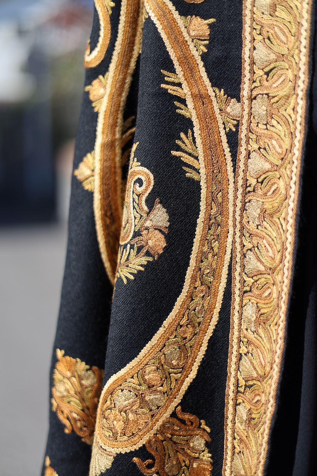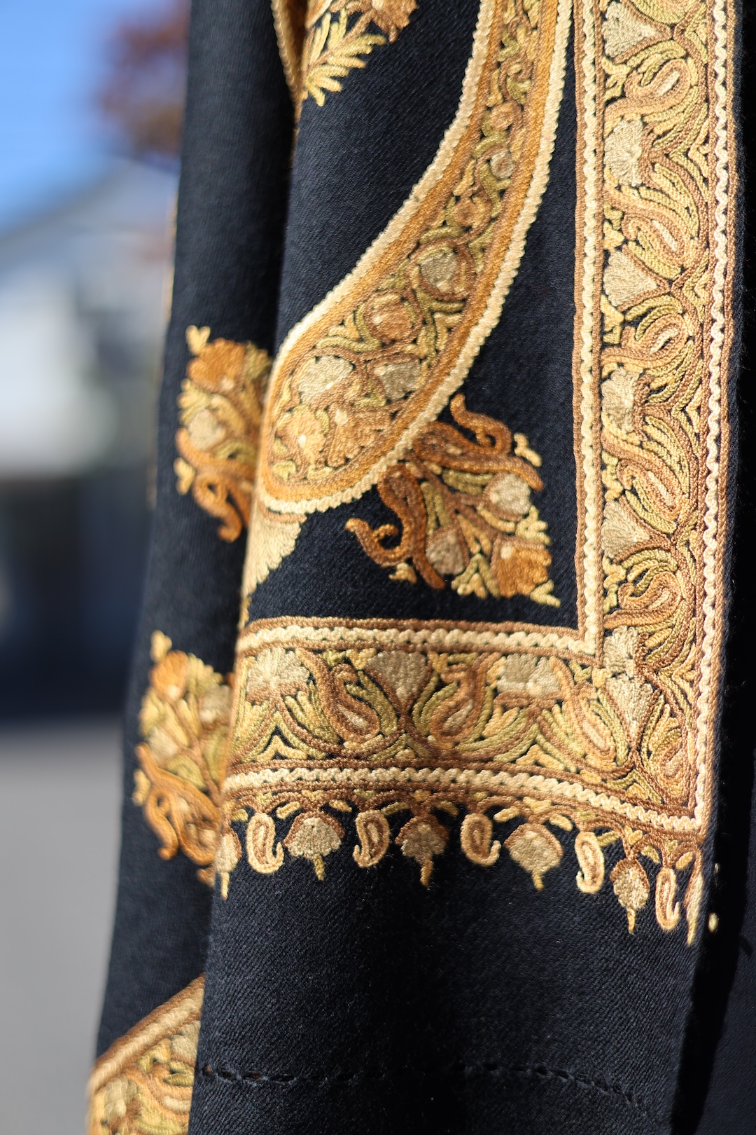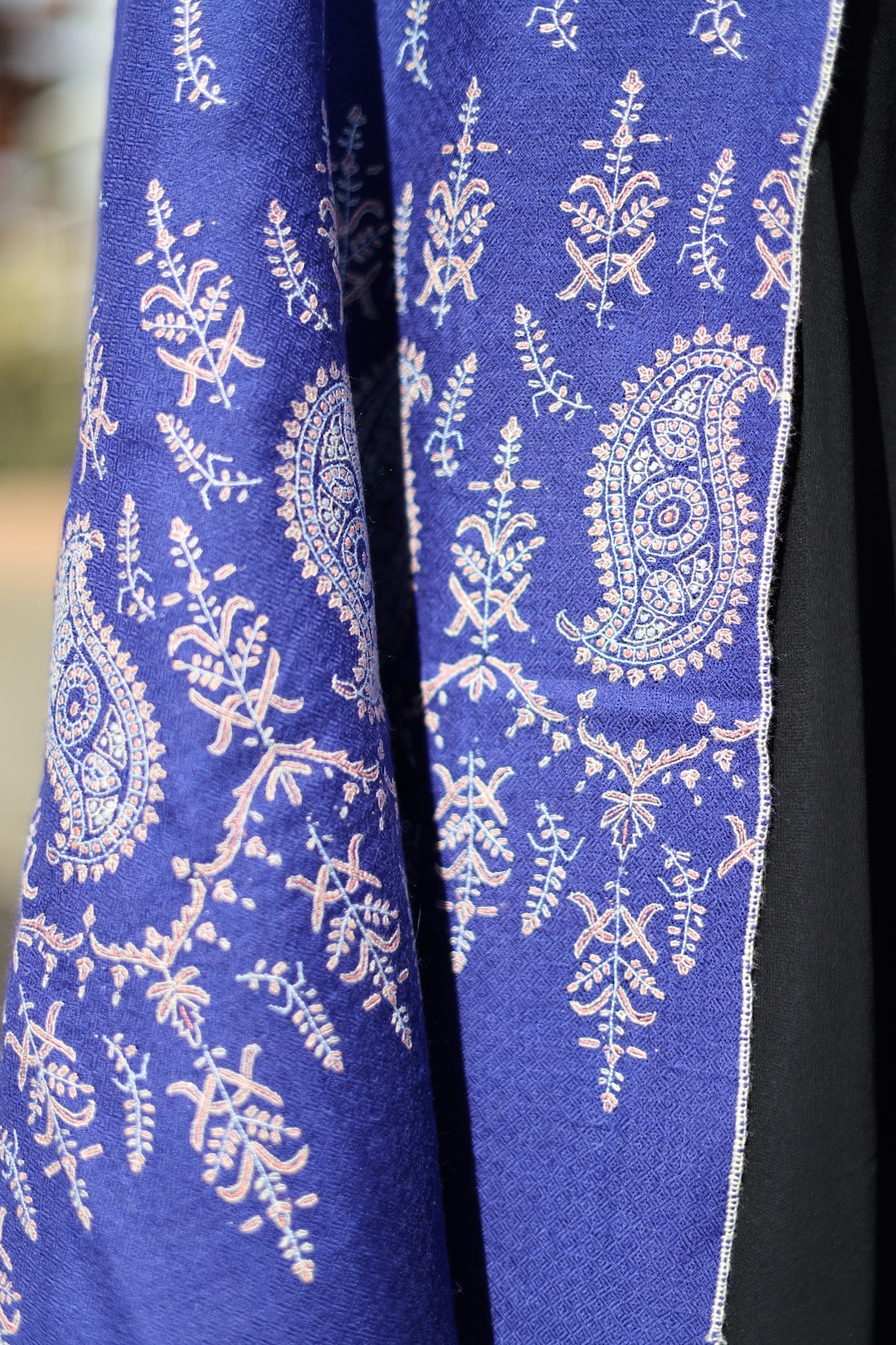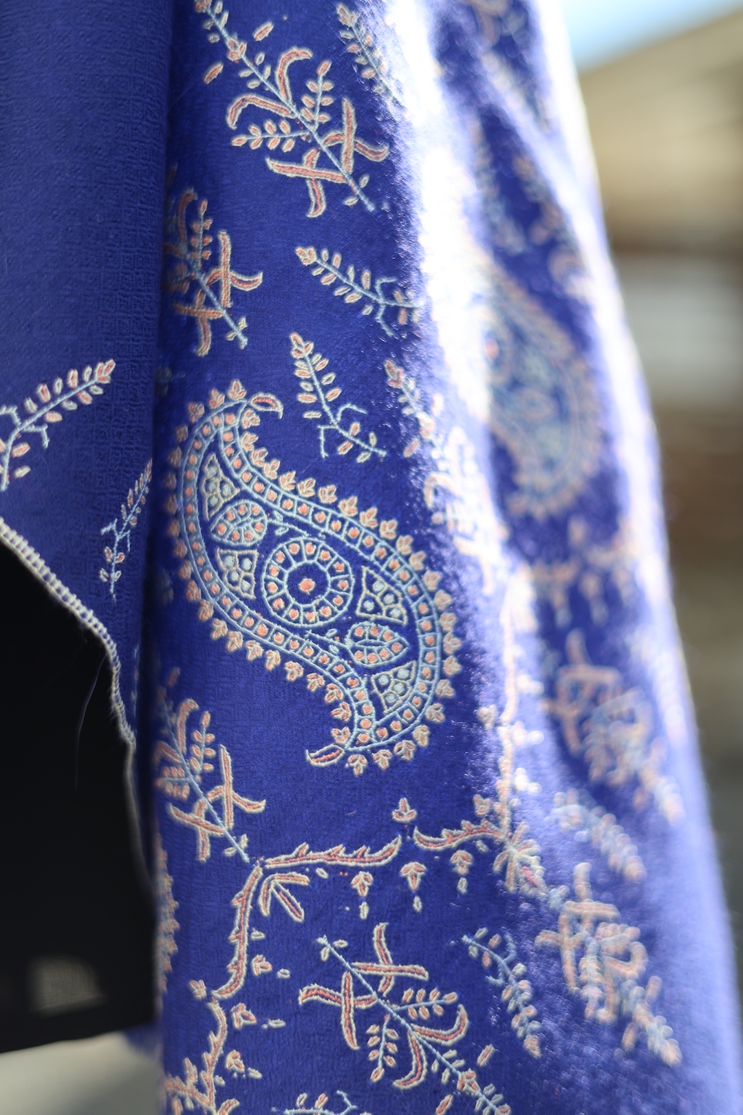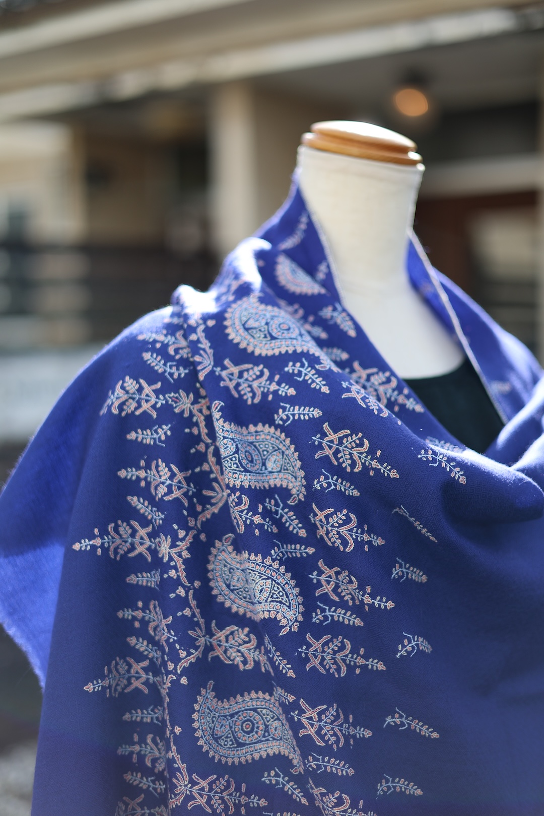 次は美しい瑠璃紺にバランスよく繊細な手刺繍が施されたストール。