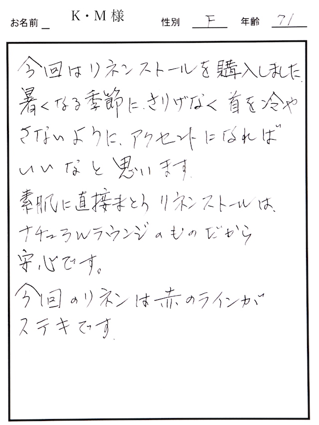 素肌に直接まとうリネンストールは、ナチュラルラウンジのものだから安心です。