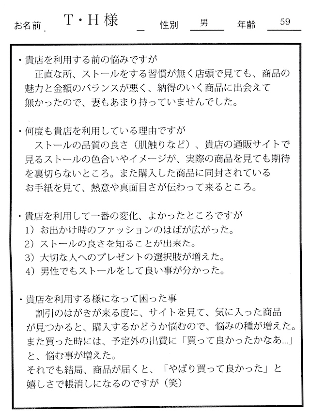 ストールの品質の良さ(肌触りなど)、貴店の通販サイトで見るストールの色合いやイメージが、実際の商品を見ても期待を裏切らないところ。
