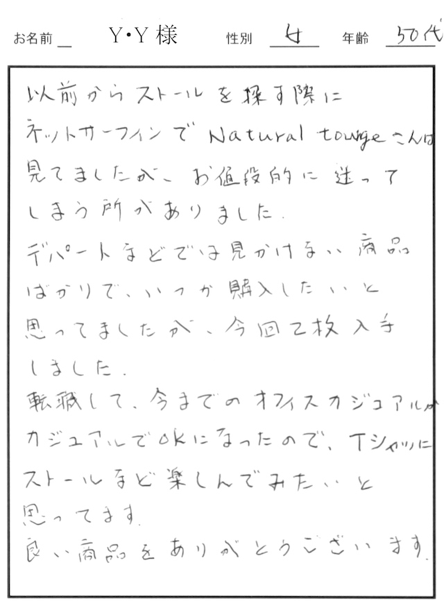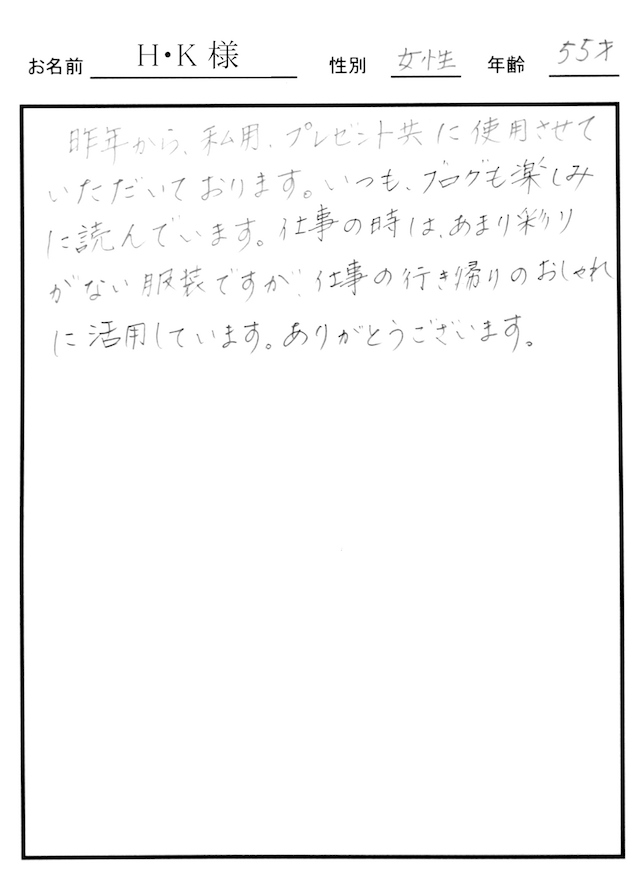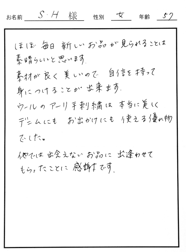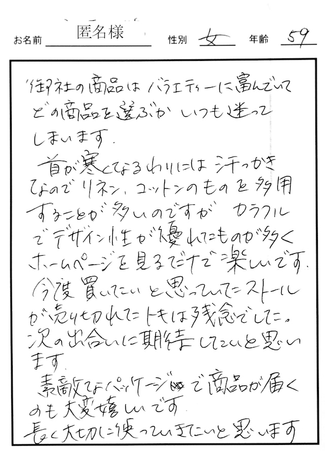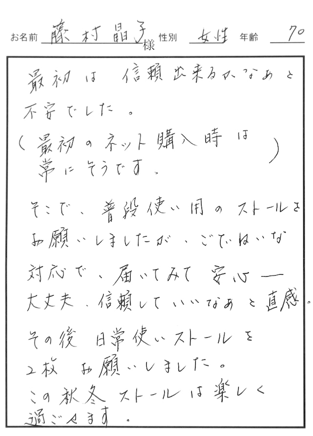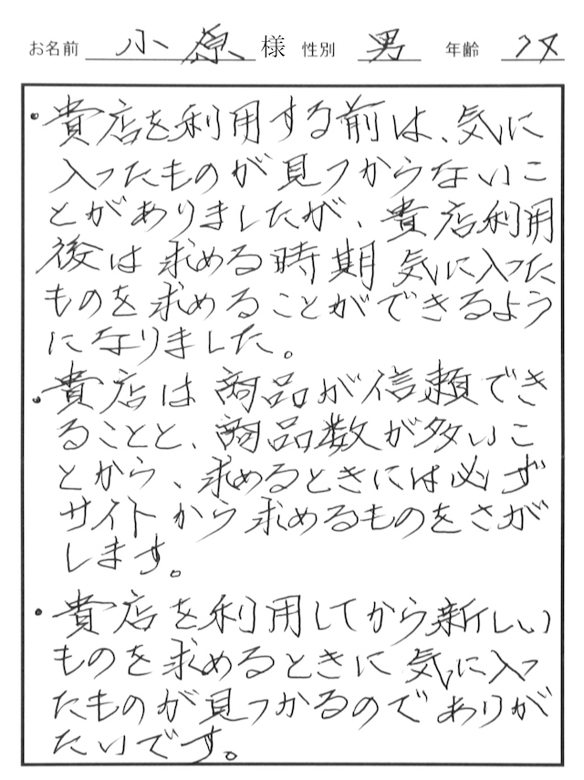 貴店の丁寧な商品の仕入、扱い等々、とても信頼しています。