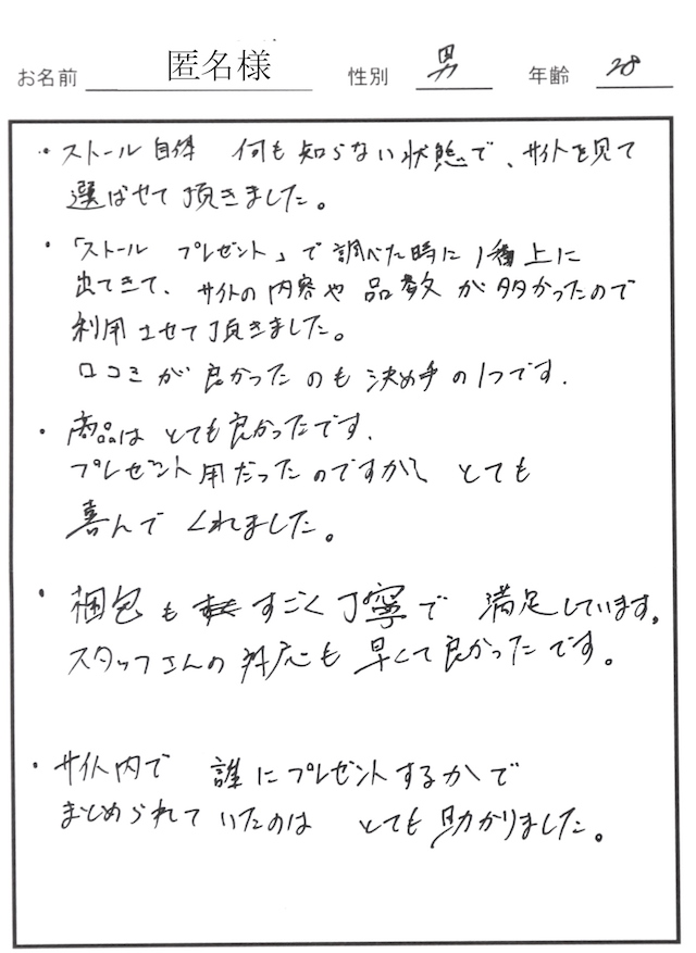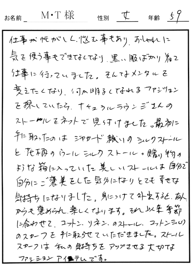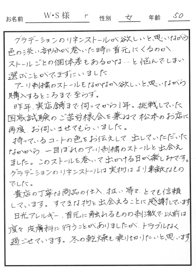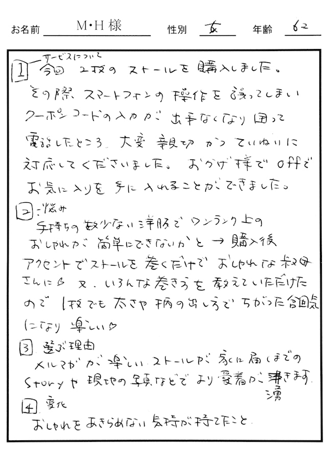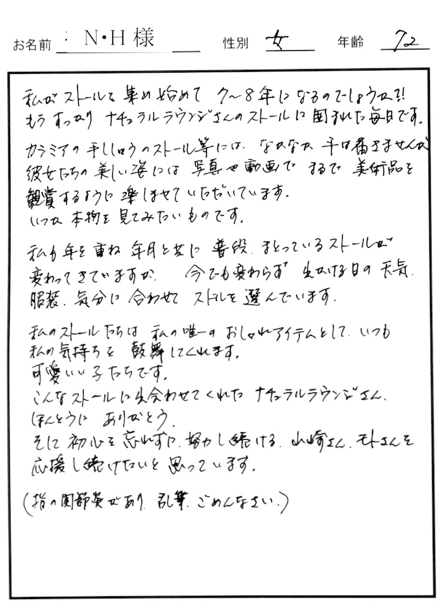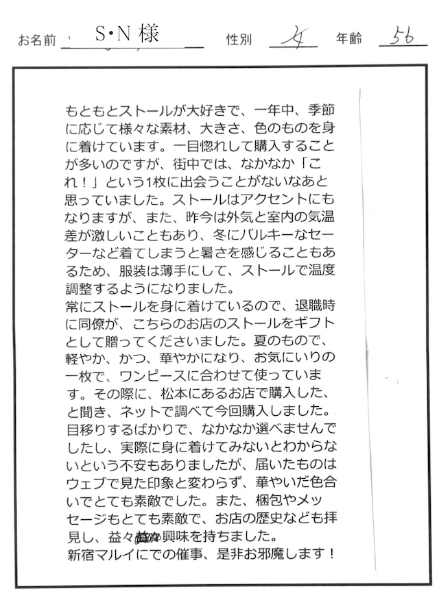 貴店の丁寧な商品の仕入、扱い等々、とても信頼しています。