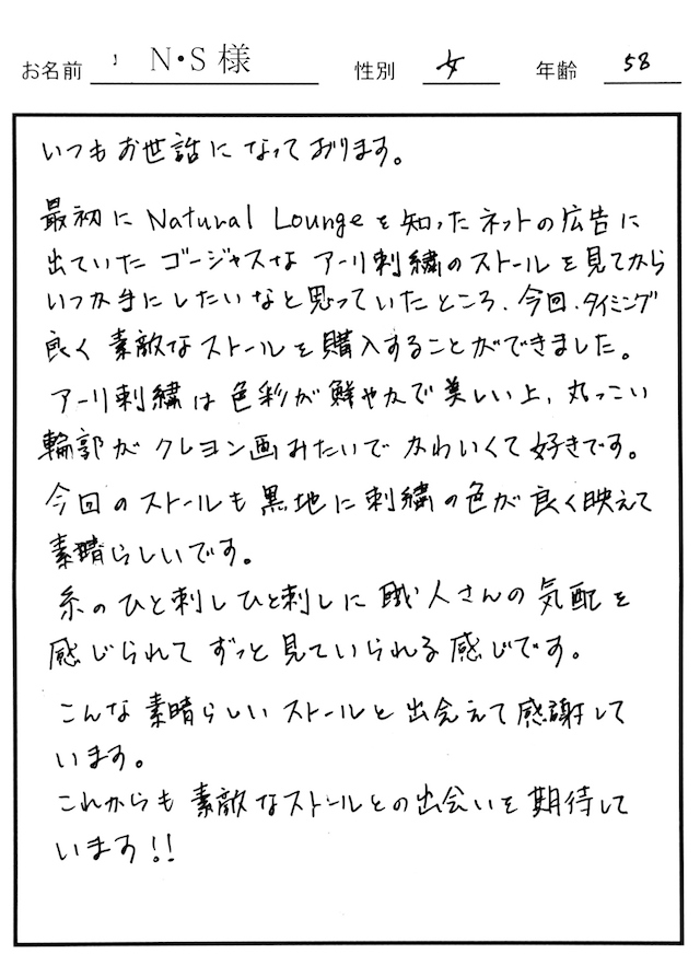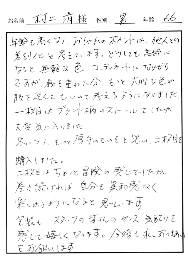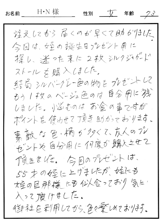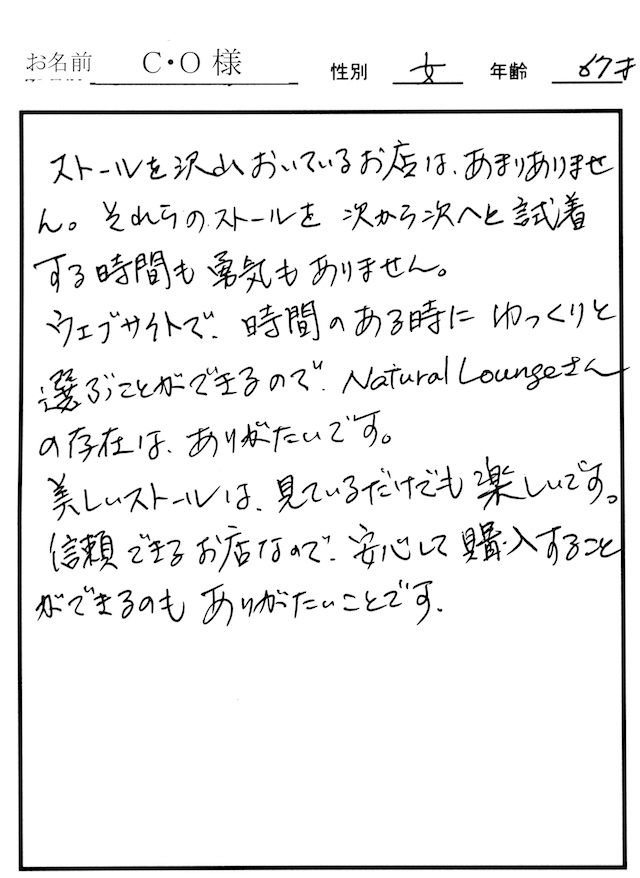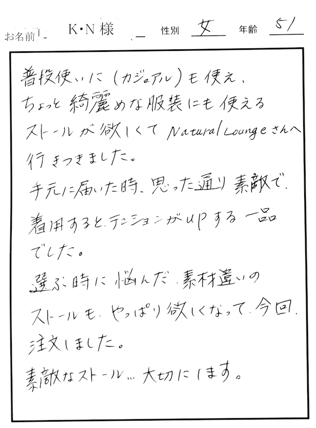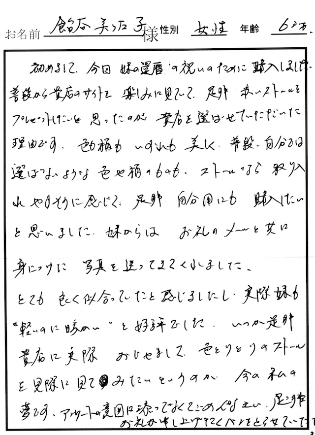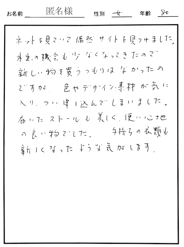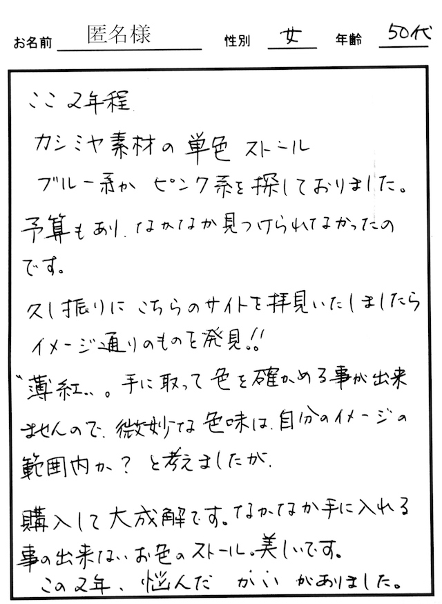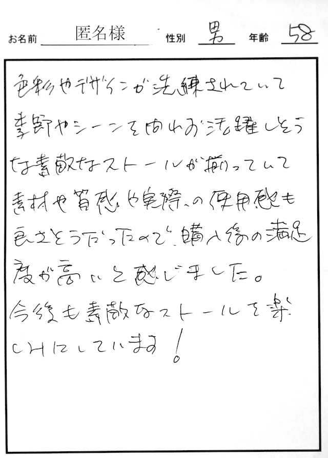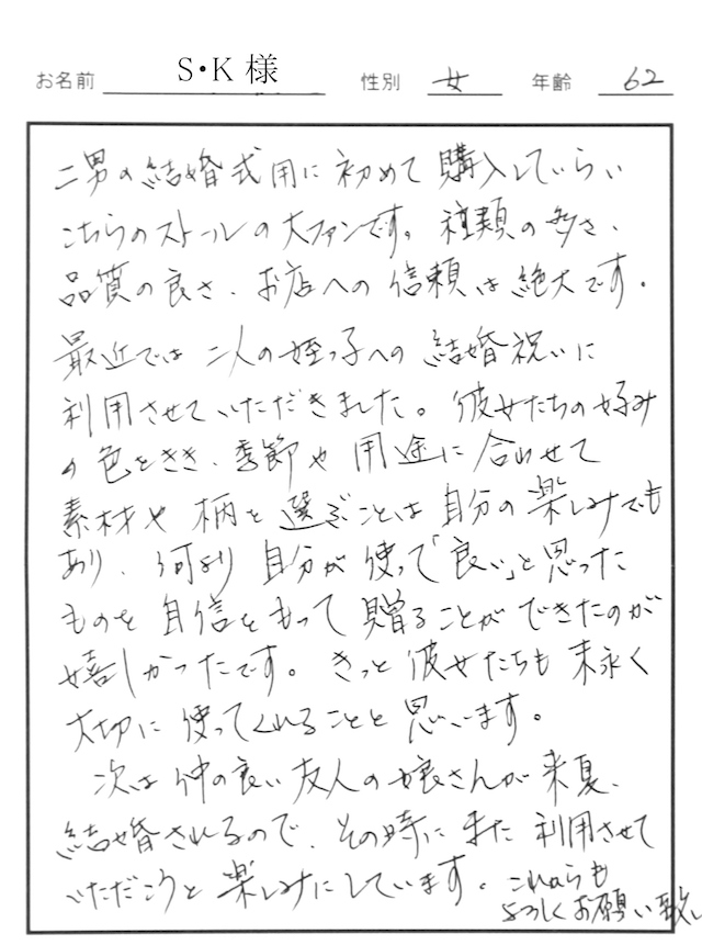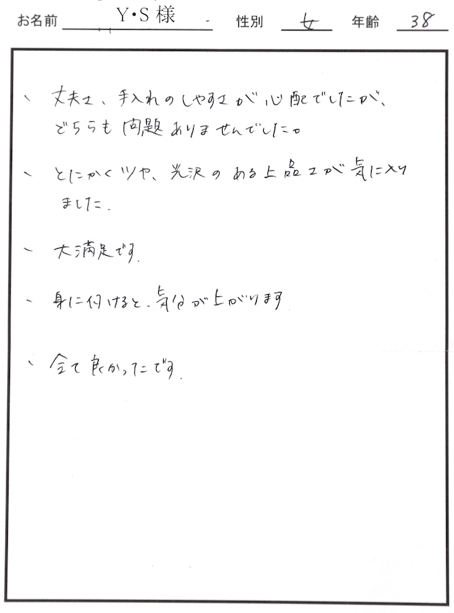 届いた時の色合いや質の良さに感動した事は忘れられないです。