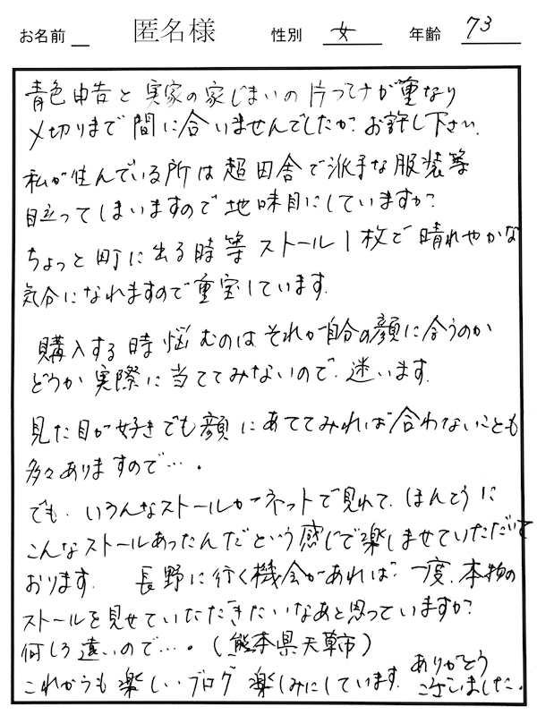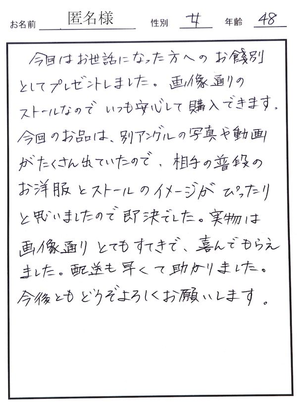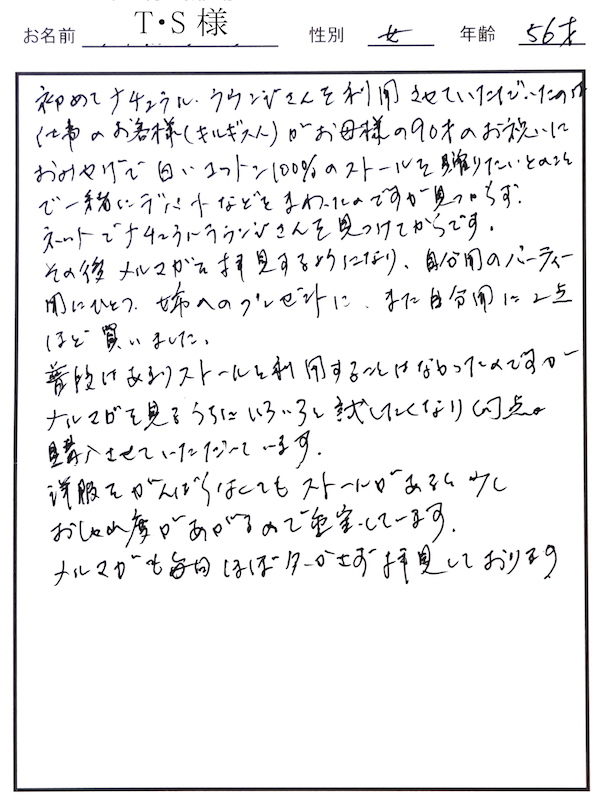買わせて頂いたストールは全て大満足です。