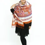 スタンダードな大判サイズで、首に巻くことはもちろん、室内でのひざ掛けにも、肩から羽織る使い方もできます。特に羽織りは、パッと華やかにエレガントな雰囲気に変わります。上半身を覆えるので、着ている服を気にせず合わせることができます。忙しい朝もコーディネートを気にする必要はありません。