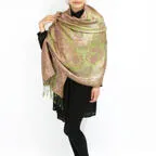 スタンダートな大判サイズで巻いても羽織っても、どちらも使いやすいタイプです。特に羽織は全体の印象がパッと華やかに、エレガントな雰囲気に変化します。