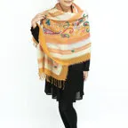 スタンダードな大判サイズで、首に巻くことはもちろん、室内でのひざ掛けにも、肩から羽織る使い方もできます。特に羽織りは、パッと華やかにエレガントな雰囲気に変わります。上半身を覆えるので、着ている服を気にせず合わせることができます。忙しい朝もコーディネートを気にする必要はありません。