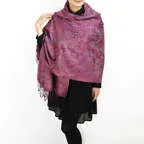 スタンダートな大判サイズで巻いても羽織っても、どちらも使いやすいタイプです。特に羽織は全体の印象がパッと華やかに、エレガントな雰囲気に変化します。