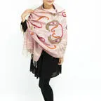 スタンダードな大判サイズで、首に巻くことはもちろん、室内でのひざ掛けにも、肩から羽織る使い方もできます。特に羽織りは、パッと華やかにエレガントな雰囲気に変わります。上半身を覆えるので、着ている服を気にせず合わせることができます。忙しい朝もコーディネートを気にする必要はありません。