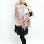 スタンダードな大判サイズで、首に巻くことはもちろん、室内でのひざ掛けにも、肩から羽織る使い方もできます。特に羽織りは、パッと華やかにエレガントな雰囲気に変わります。上半身を覆えるので、着ている服を気にせず合わせることができます。忙しい朝もコーディネートを気にする必要はありません。