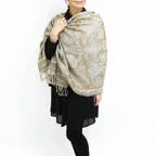 スタンダードな大判サイズで、首に巻くことはもちろん、室内でのひざ掛けにも、肩から羽織る使い方もできます。特に羽織りは、パッと華やかにエレガントな雰囲気に変わります。上半身を覆えるので、着ている服を気にせず合わせることができます。忙しい朝もコーディネートを気にする必要はありません。