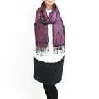 スタンダートな大判サイズで巻いても羽織っても、どちらも使いやすいタイプです。特に羽織は全体の印象がパッと華やかに、エレガントな雰囲気に変化します。