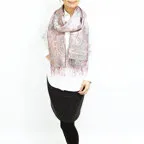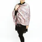 スタンダートな大判サイズで巻いても羽織っても、どちらも使いやすいタイプです。特に羽織は全体の印象がパッと華やかに、エレガントな雰囲気に変化します。