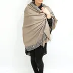 195cm×100cm大判ショールサイズで、巻きでも羽織でもどちらも使いやすいストールです。特に羽織は全面に施された刺繍が美しく輝き、サッとあしらうだけでゴージャスな雰囲気に変化します。横幅が特に長いのでドレスや着物などの羽織物としても重宝します。