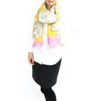 一緒にいる人に華やかさをプレゼントするような、カラフル色使いが印象的なデザイン。着こなしに花を咲かせるリネンストールです!