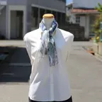 小ぶりなスクエアサイズで、アスコットタイのようにシャツやブラウスの中におさめて使うこともできます。室内でも巻いたままでいられるので使いやすくなっています。