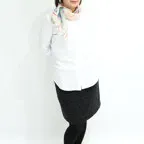 小ぶりなスクエアサイズで、アスコットタイのようにシャツやブラウスの中におさめて使うこともできます。室内でも巻いたままでいられるので使いやすくなっています。