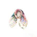 小ぶりなスクエアサイズで、アスコットタイのようにシャツやブラウスの中におさめて使うこともできます。室内でも巻いたままでいられるので使いやすくなっています。