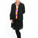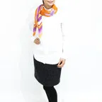 スクエアサイズで、アスコットタイのようにシャツやブラウスの中におさめて使うこともできます。室内でも巻いたままでいられるので使いやすくなっています。