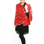 バランスの良い大判サイズで、巻きでも羽織でもどちらも使いやすいストールです。特に羽織は全面に施された刺繍が美しく輝き、サッとあしらうだけでゴージャスな雰囲気に変化します。