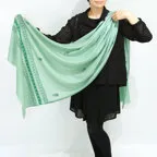 バランスの良い大判サイズで、巻きでも羽織でもどちらも使いやすいストールです。特に羽織は全面に施された刺繍が美しく輝き、サッとあしらうだけでゴージャスな雰囲気に変化します。