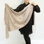 バランスの良い大判サイズで、巻きでも羽織でもどちらも使いやすいストールです。特に羽織は全面に施された刺繍が美しく輝き、サッとあしらうだけでゴージャスな雰囲気に変化します。
